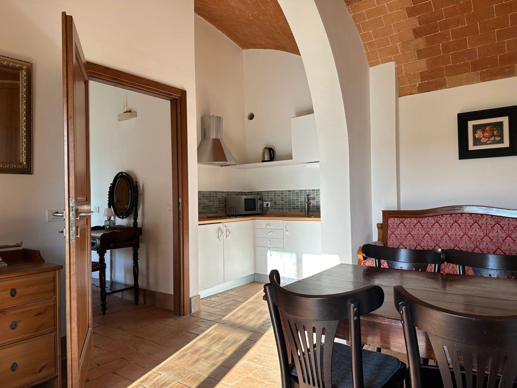 The Vigneto flat is located on one level on the ground floor of the villa and is also suitable for a wheelchair or walker thanks to its wide doors and spacious bathroom with walk-in shower. It has a kitchen-cum-living room and a bedroom with a double bed; an extra bed can be added if required.