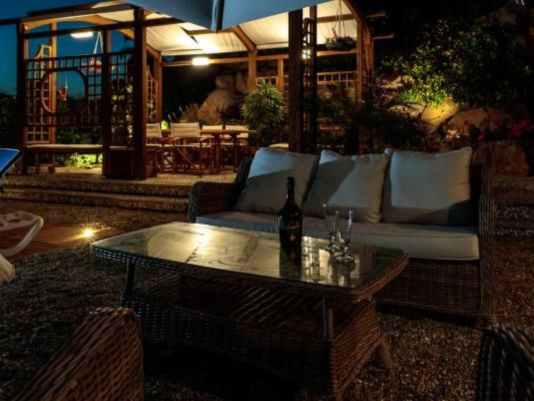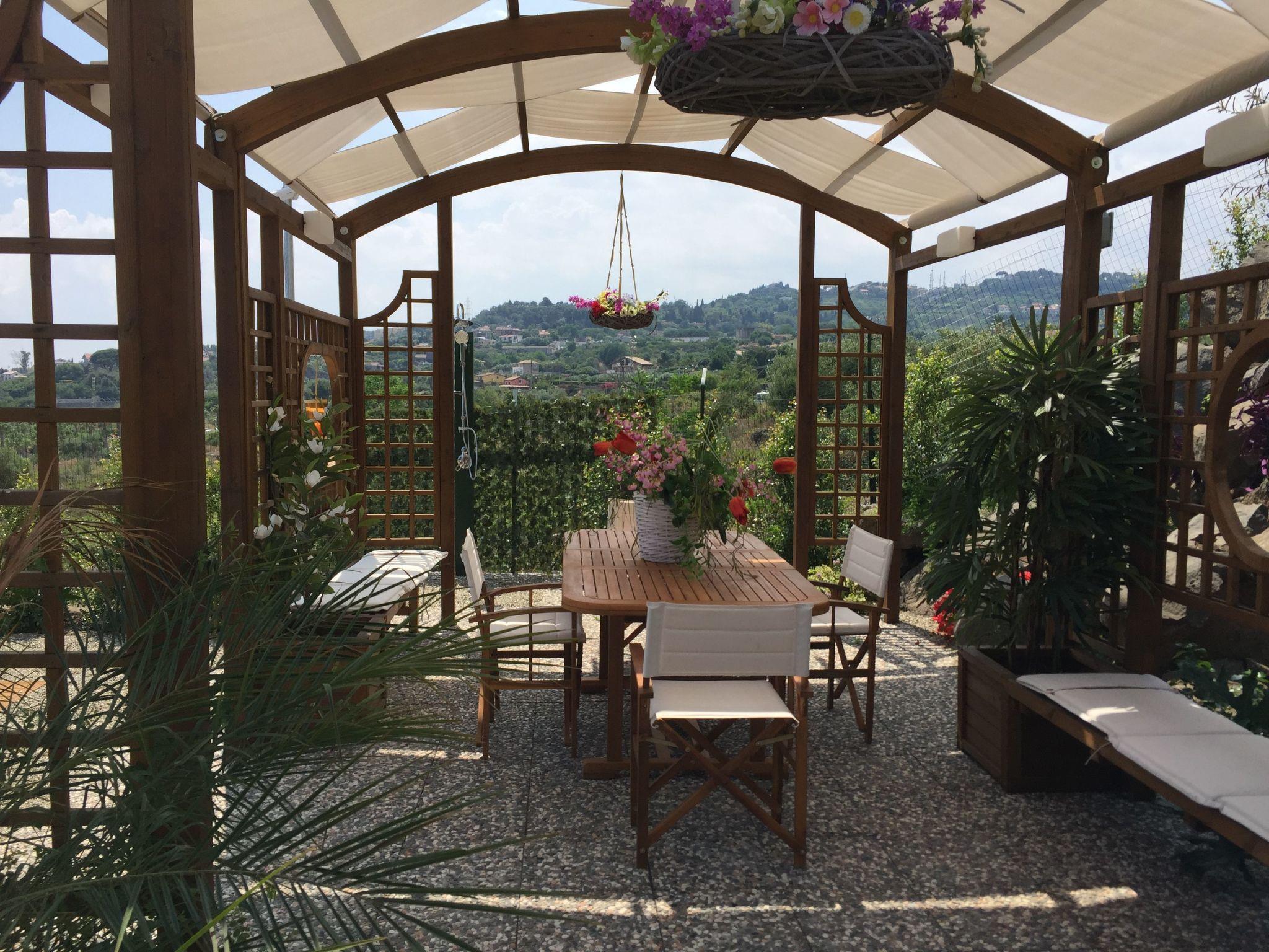 The property's exteriors are equally impressive, boasting a garden on 3 levels. Entry is via an automatic gate leading to free parking. The standout feature is the private Mini SPA and solarium on the second level, offering cold/warm water, ergonomic seats, and complemented by chromotherapy and aromatherapy for a fulfilling SPA experience. This level also hosts a relaxation area with a large sofa, armchairs, and an outdoor dining gazebo with a TV. Facilities for a delightful open-air meal include a barbecue and accessories stored in a woodhouse. An additional patio with a sunshade and barbecue corner by the apartment's entrance invites more moments of outdoor living.