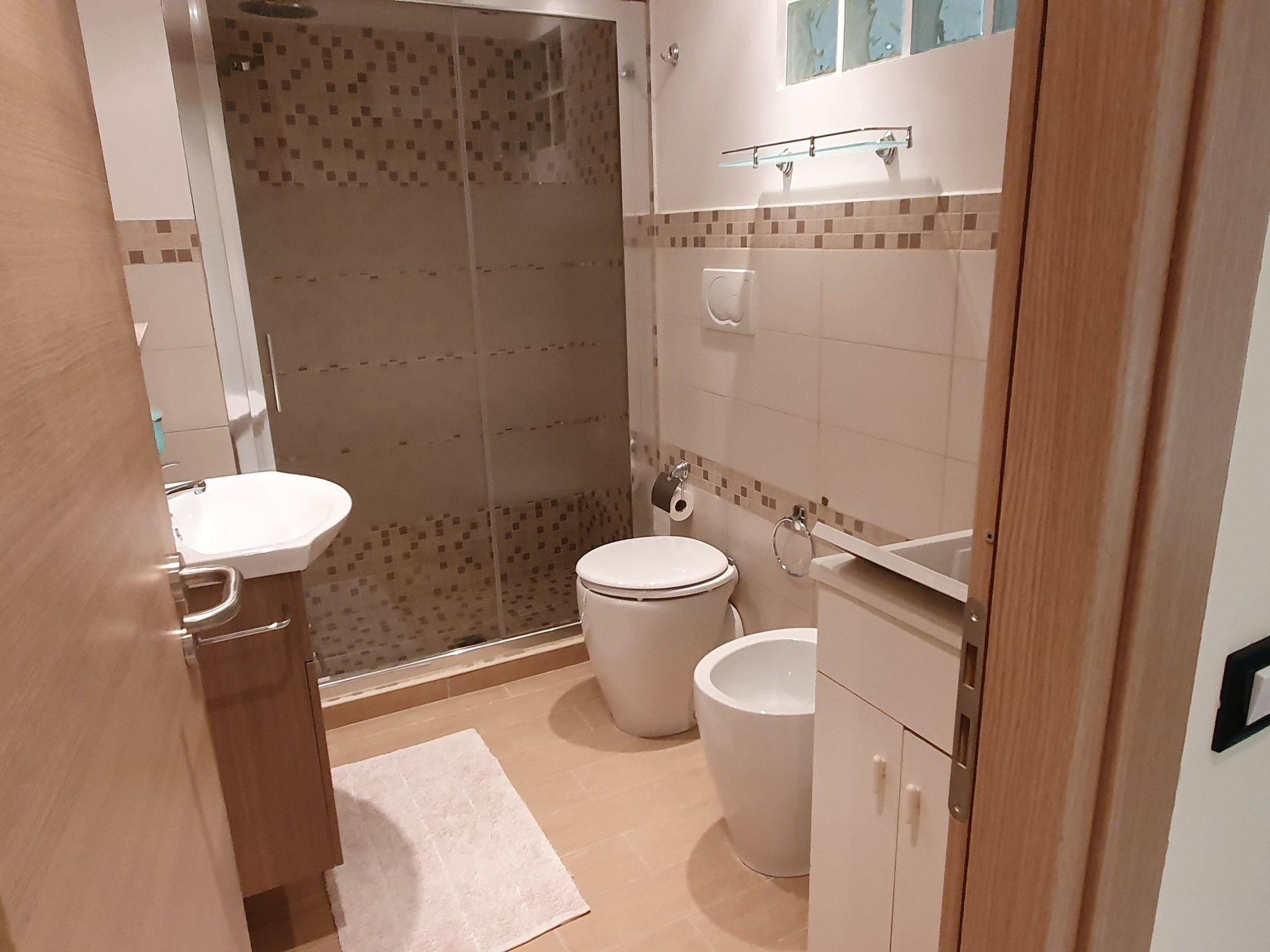 Inside, the apartment spans 100 square meters and is designed to cater to your every need. It features a spacious living room adorned with a sofa bed, a fully equipped kitchen with all essentials, and a service area inclusive of a washing machine. Two independent bedrooms, each boasting a double bed, along with two bathrooms equipped with showers ensure your stay is comfortable. Unique to one of the bathrooms is a sauna shower box, enhancing your relaxation options. All rooms are fitted with air conditioning, central heating, and access to satellite TV and WiFi, ensuring a homely feel. Additional amenities include a cot for children up to 3 years and the possibility to accommodate up to two children (max 15 years) on the large sofa bed, subject to house rules.