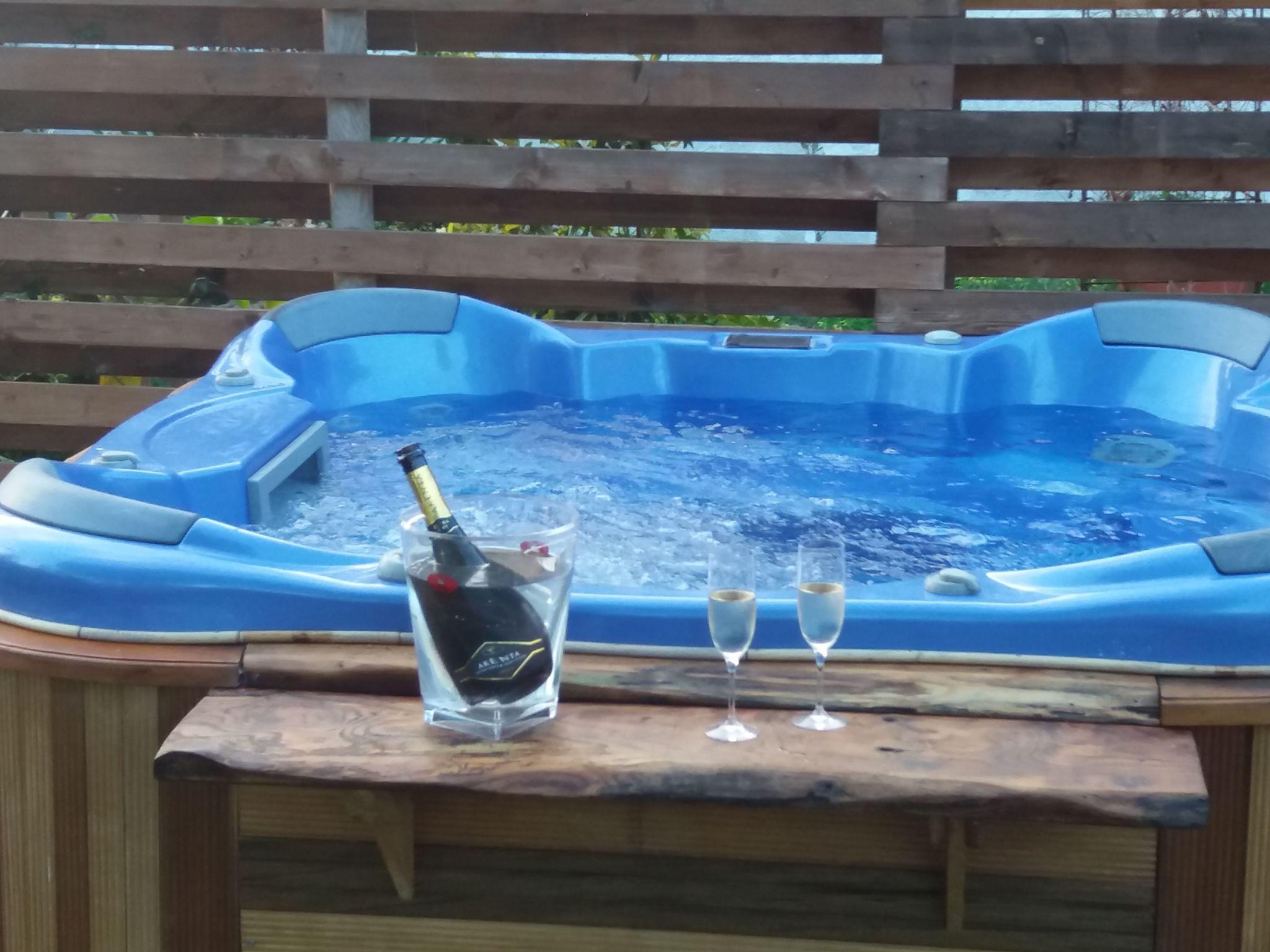 Outside: an exclusive patio with sun loungers, table and chairs, BBQ, green lawn and a wonderful hydromassage mini-pool completely covered in precious wood for exclusive use