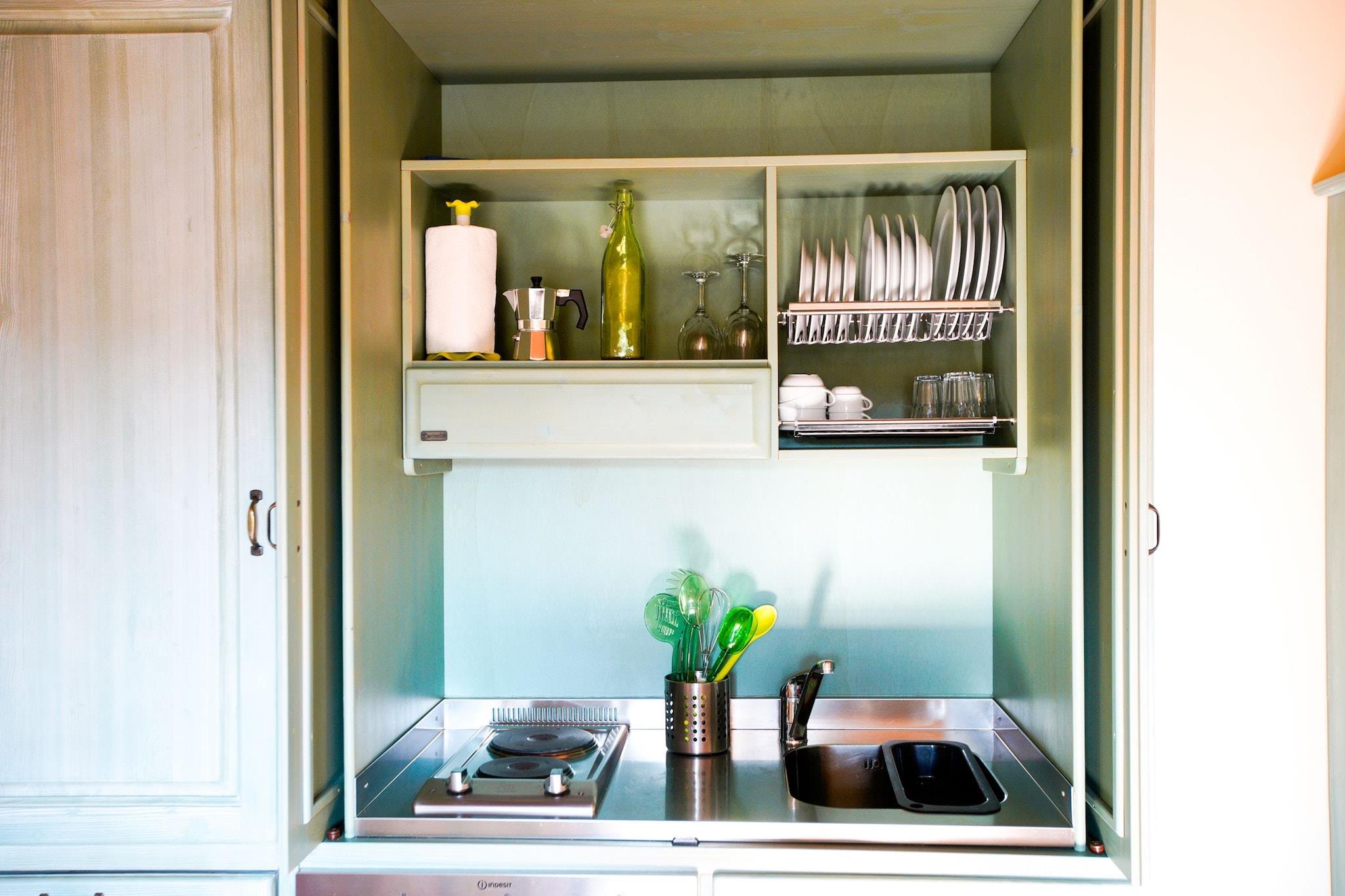 På 1. etage: (Stue(dobbeltsovesofa, Fjernsyn(parabol), spisebord), tekøkken(kogeplade, elkedel, elkedel, emhætte, ovn, køle-fryseskab), soveværelse(dobbeltseng), badeværelse(bruser, håndvask, toilet, bidet), varme, barneseng(på anmodning), barnestol(på anmodning)) terrasse, have, havemøbler, solstole, parkering, Parasol, swimmingpool(deles med andre gæster, 14 x 6 m., opened from May upto and including Oct), baldakin