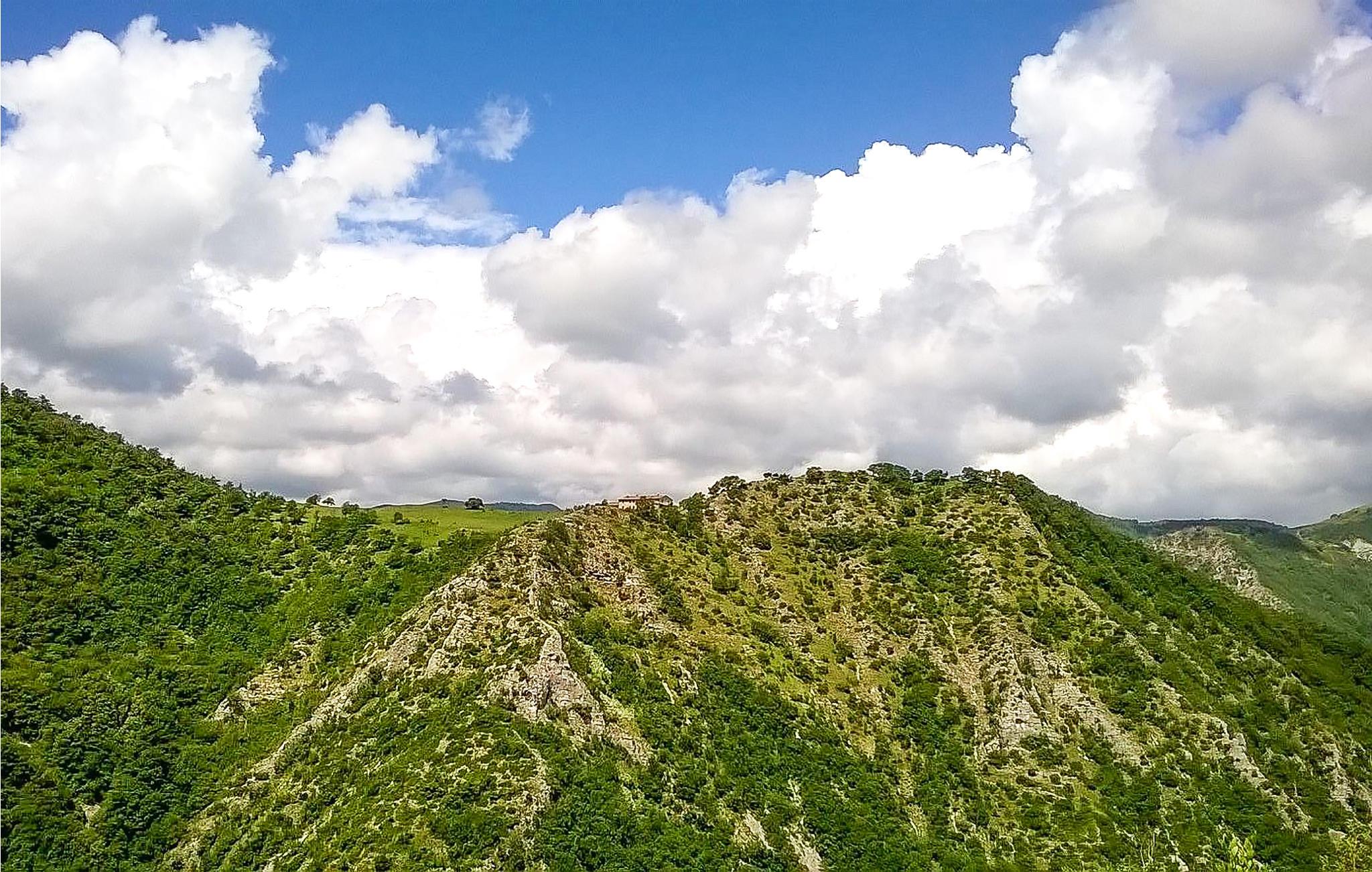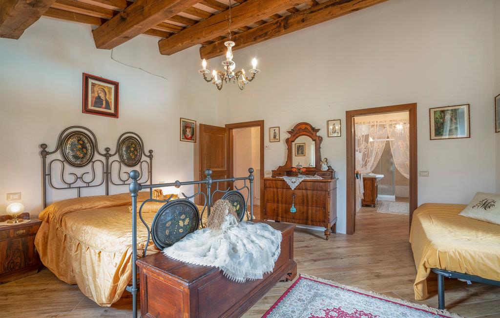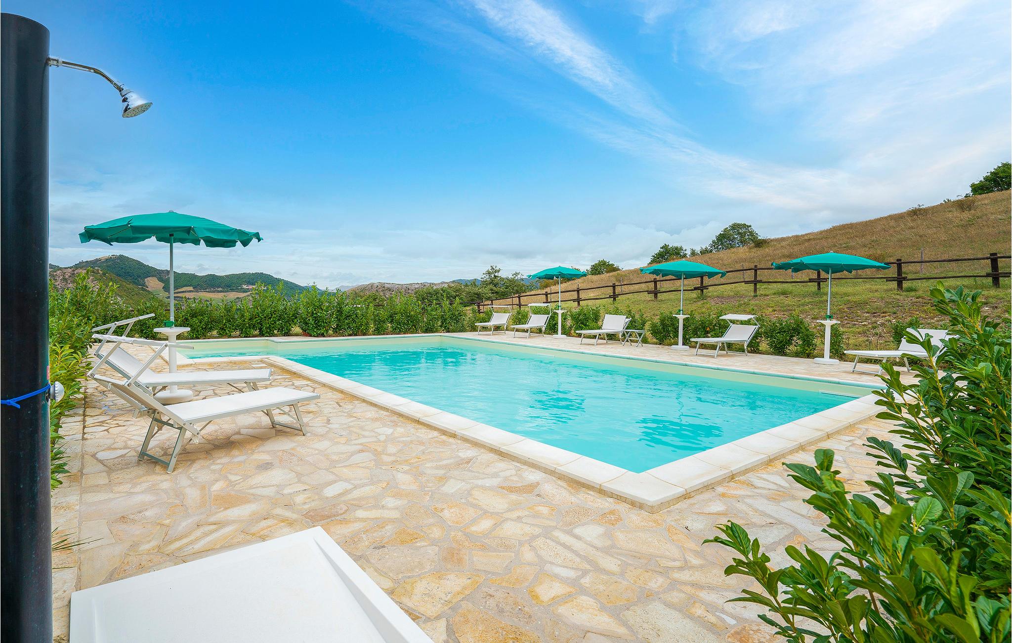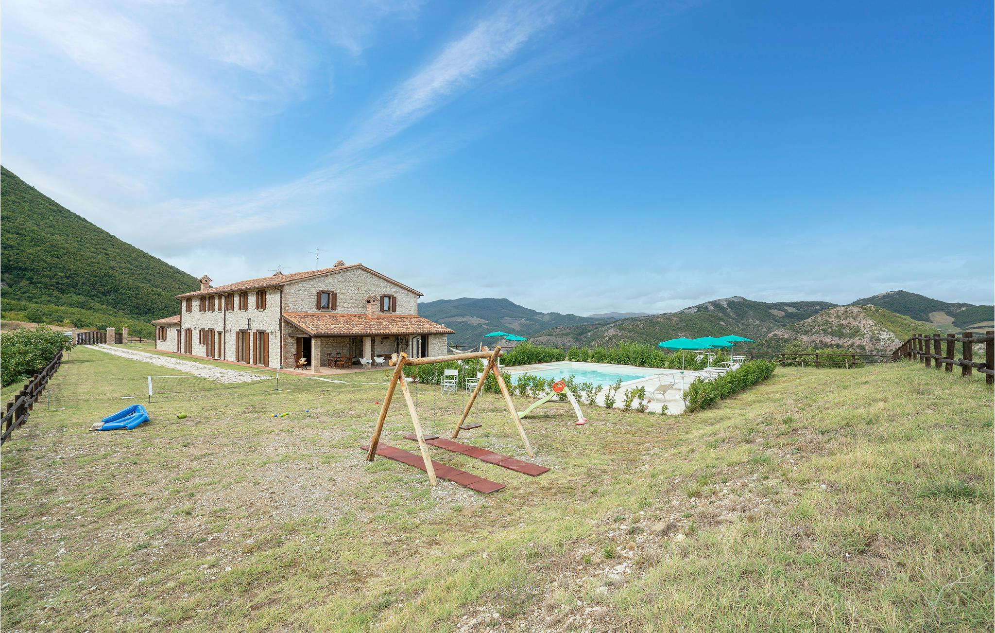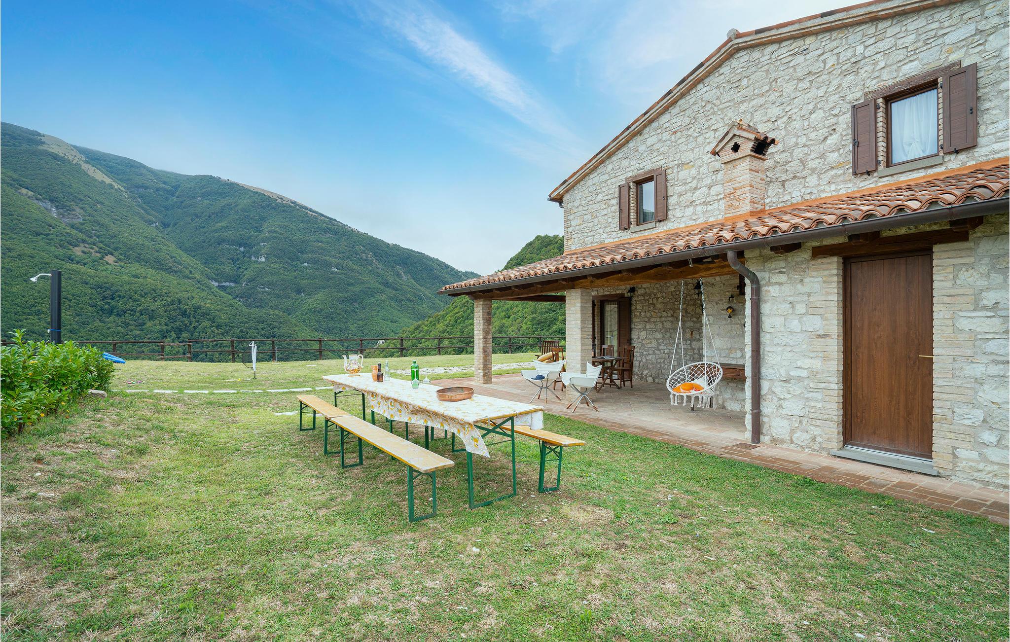 Mellem Piobbico og Apecchio (6 km væk) ligger dette komfortable landsted på en bakke i 800 moh. En perfekt feriebolig til en stor familie eller gruppe, der sætter pris på fred, ro og natur. Denne tidligere bondegård er stilfuldt restaureret og møbleret. I de to oprindelige stalde i stueetagen er der nu to store stuer med et langt bord, en åben pejs og et poolbord, Her kan der også dyrkes aktiviteter som musik, dans, yoga. Soveværelserne ligger på 1. sal. Foran huset er der en overdækket terrasse med grill og pizzaovn. Den omfattende ejendom er helt indhegnet. Der er plads nok til parkering, til alle mulige boldspil, og selvfølgelig er der pool med behagelige liggestole til afslapning efter svømmeturen. Overalt er der en unik panoramaudsigt over det modsatte Monte Nerone (1525 moh). Vandrestier lokker ud på vandre- og cykelture ind i det imponerende landskab, kendetegnet af store skove, barske skråninger og iskolde bjergbække. Det er 65 km til Pesaro og Fano. Adgang via 1,6 km ikke-asfalteret vej, ikke egnet til lavtliggende biler.