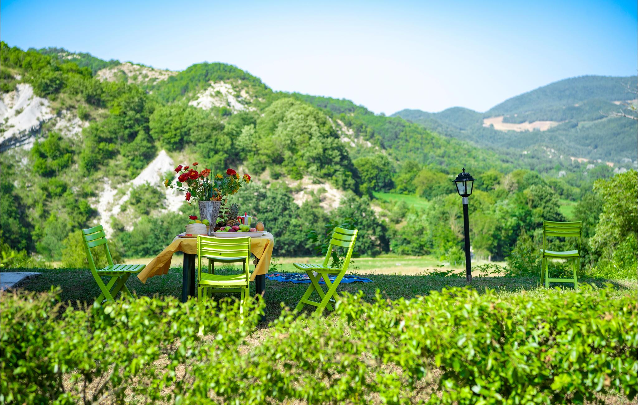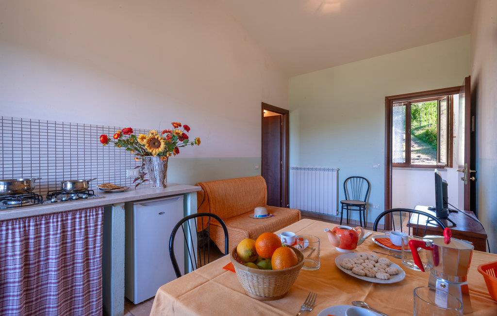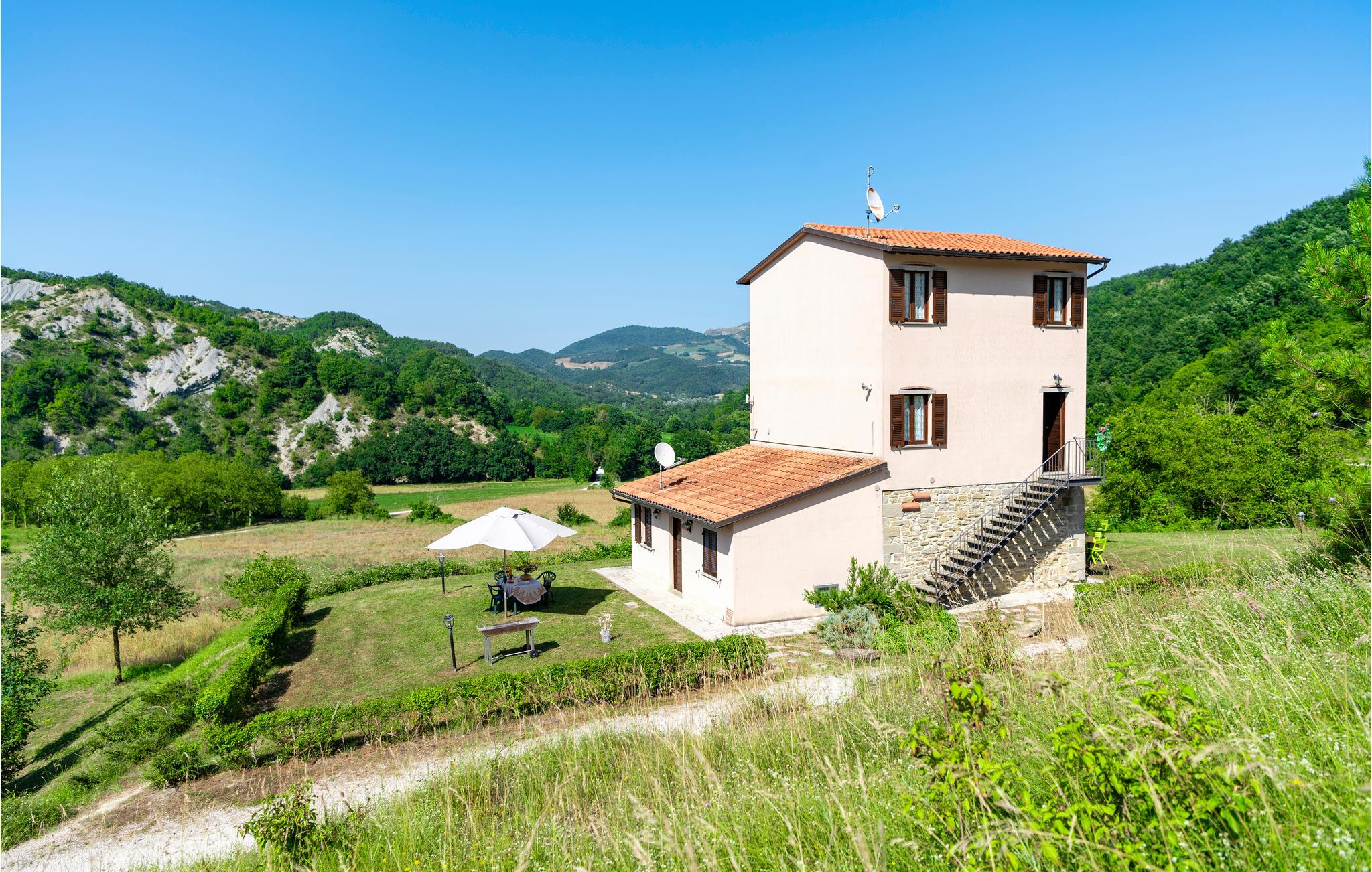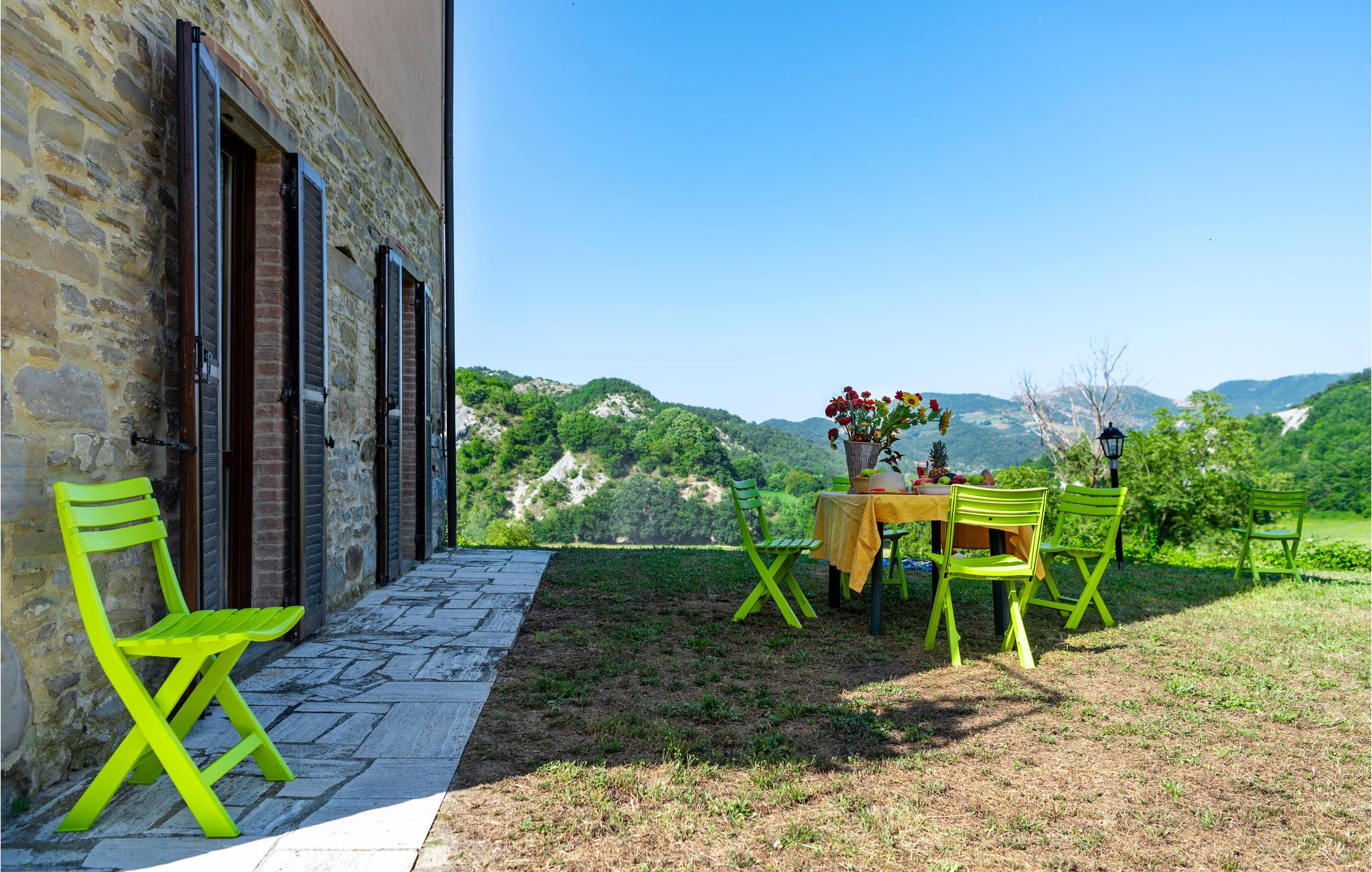 Denne ferielejlighed ligger på ejendommen Valguerriera, ca. 4 km fra Piobbico, i en dal i Apennin, det ideelle rejsemål til jer, hvis I ønsker jer en afslappende ferie i uberørt natur. Ejendommen består af herskabshuset og tre landhuse, de generøse udendørsområder og den dejlige, fælles pool på 17 x 10 m med undervandsmassage. I landhusene er der i alt 11 indbydende indrettede ferielejligheder. Lejligheden byder på en uafhængig indgang i eget udendørsområde med bord, stole og parasol, hvor I kan slappe af og spise jeres måltider i det fri. Grill og vaskemaskine til fælles brug. Parkering på grunden. En barneseng er til rådighed. Her bor I i Marche, ved grænsen til regionerne Toscana og Umbrien, i nærheden af Piobbico (Pesaro og Urbino), i en rolig dal ved navn Candigliano, en af de dejligste og mest oprindelige dale i baglandet af Pesaro, der byder på mildt klima og hvorfra I nyder en vidunderlig udsigt til Apennin. I omgivelserne venter der kunst- og renæssancebyer som Urbino, UNESCO-verdenskulturarv, fortryllende middelalderlandsbyer som Piobbico, Apecchio, Sant’Angelo in Vado og Acqualagna, kendt for trøflerne, samt Urbania, Cagli, San Marino, Gradara og San Leo. Ejendommens beliggenhed er også fordelagtig til lidt længere dagsture som til Gubbio, Assisi, Perugia, Città di Castello, Arezzo, San Sepolcro, Loreto, Florenz og Siena, der alle rummer stort kunsthistorisk relevans, eller til San Marino, til borgen af Gradara, grotterne af Frasassi eller til Furlopasset. Afstande: 4 km Piobbico (dagligvarer og andre indkøb, bank, apotek, læge), 30 km Urbino, 55 km Fano og strandene langs Adriaterhavet, som I når på omkring en times kørsel. 6 km til wellnesscenter og 10 km til ridebane. Mulighed for guidede ture.