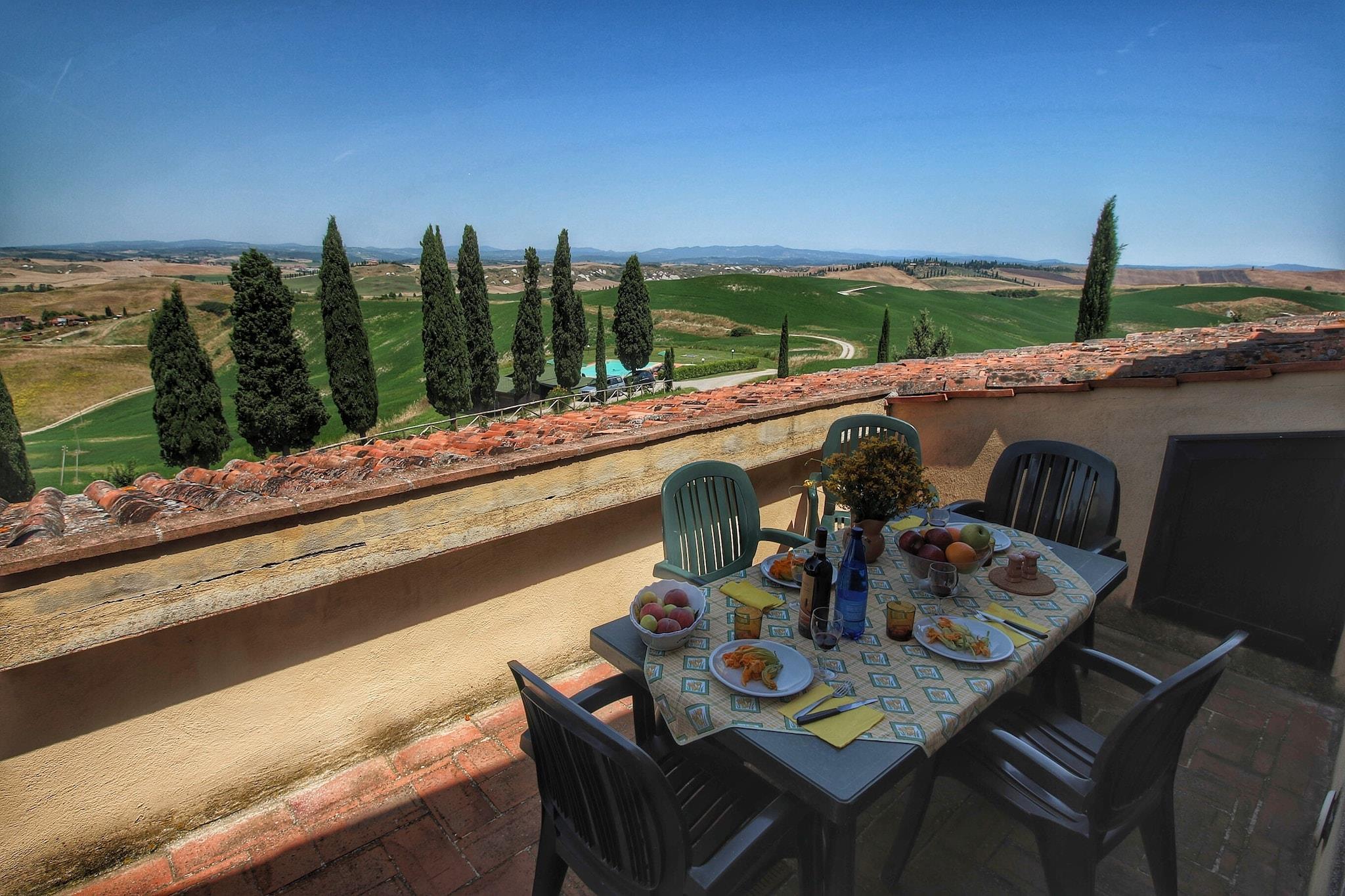 Beliggende i de bølgende bakker i Arbia Asciano, tilbyder denne kæledyrsvenlige bondegård et fredfyldt tilflugtssted for op til otte gæster, der kombinerer rustik charme med moderne bekvemmeligheder. På første sal er der en rummelig stue med pejs, der skaber en hyggelig stemning til afslappende aftener. Et veludstyret køkken omfatter kogeplader, komfur, emhætte, espressomaskine, ovn, mikroovn og køleskab med fryser, hvilket gør tilberedningen af måltider ubesværet. Stuehuset kan prale af fire smukt møblerede soveværelser - to med dobbeltsenge og to med to enkeltsenge - hvilket sikrer et afslappende ophold for alle. To badeværelser, hver med bruser, håndvask, toilet, bidet og vaskemaskine, giver ekstra bekvemmelighed. Opvarmning overalt sikrer komfort året rundt, hvilket gør denne ejendom ideel til alle årstider. Gæsterne kan nyde udendørslivet med en privat 9 m² stor terrasse og en rummelig fælles have, komplet med komfortable møbler og en grillplads til udendørs spisning. Den store swimmingpool (14 x 7 m), åben fra juni til september, tilbyder en forfriskende flugt under den toscanske sol. For dem, der er ivrige efter at udforske, er bondegården ideelt beliggende kun 13 km fra Siena, med nem adgang til charmerende landsbyer og naturskønne landskaber. Naturelskere kan udforske vandrestier, mens kulturelle entusiaster kan besøge historiske steder i nærliggende byer. Der er masser af spisemuligheder, med restauranter kun 4 km derfra, der serverer autentiske toscanske retter. Gæsterne kan nyde traditionelle retter lavet af friske regionale råvarer, mens offentlig transport tilbyder nem adgang til de omkringliggende attraktioner. Uanset om du slapper af i haven, forkæler dig selv med lokale smagsoplevelser eller opdager Toscanas maleriske landskaber, giver denne bondegård den perfekte blanding af komfort og eventyr til et uforglemmeligt ophold.