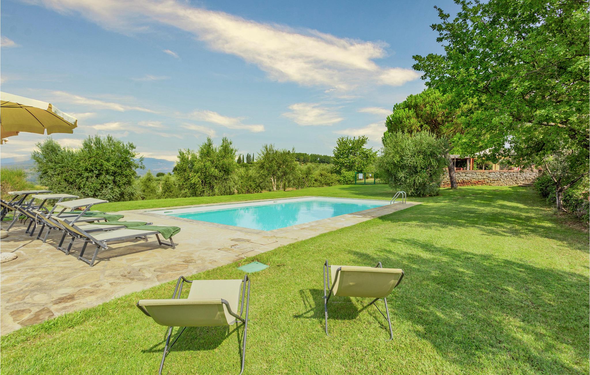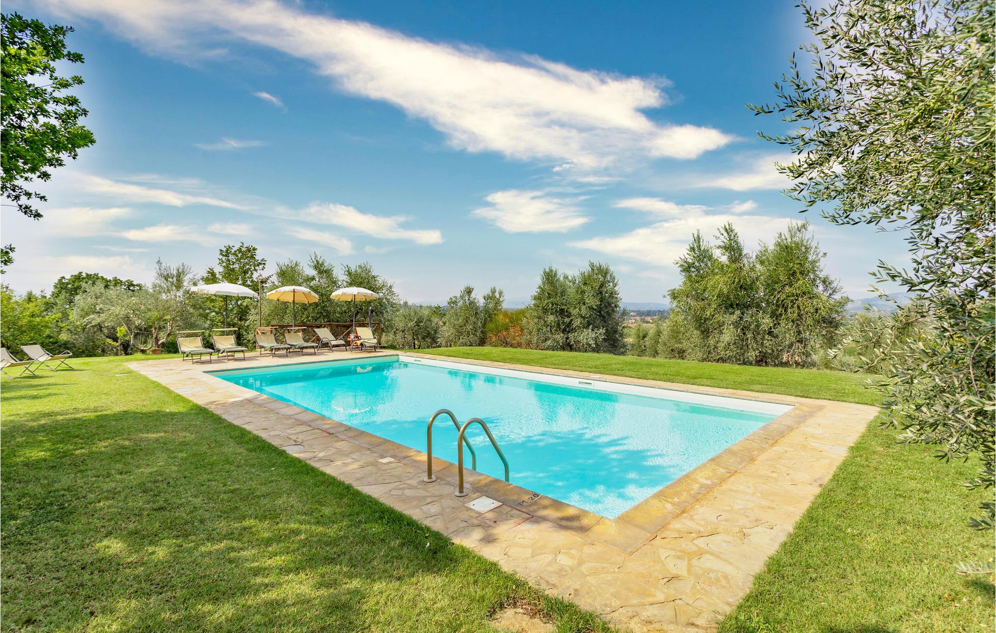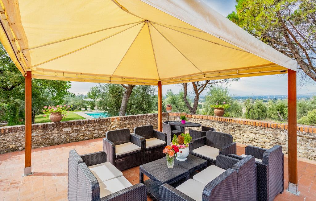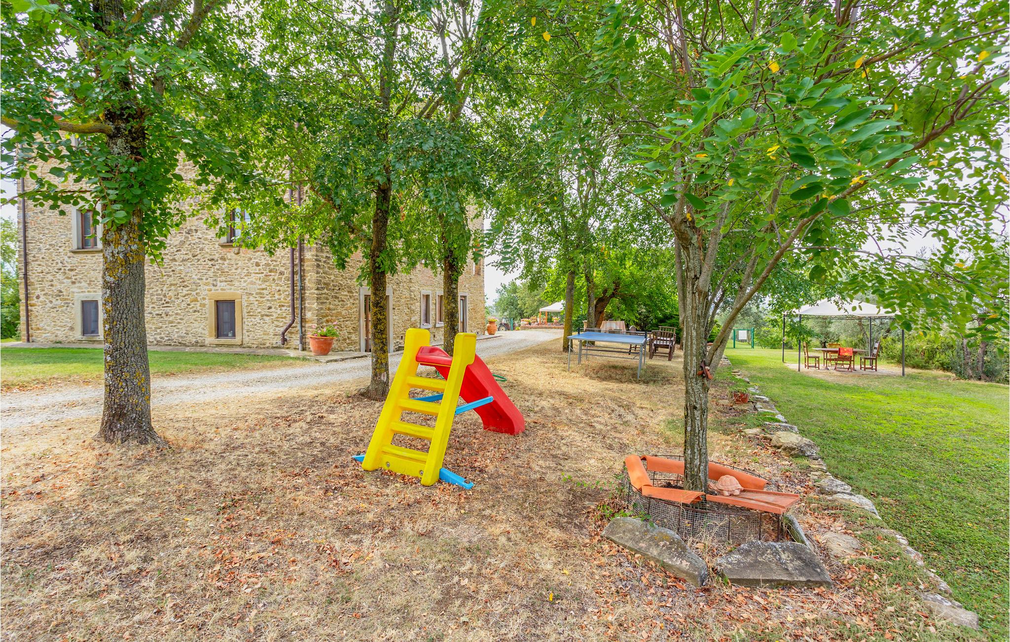 Den store grund er helt indhegnet - haven, legeområdet og poolområdet er udelukkende til rådighed for jer! På grunden er der en overdækket terrasse, grill, volleyballbane, bordfodbold og bordtennis til rådighed. Poolområdet med terrasser og liggestole er også indhegnet. Overalt kan man nyde en vid udsigt over olivenlunde ind i det maleriske landskab, helt til Arezzo.