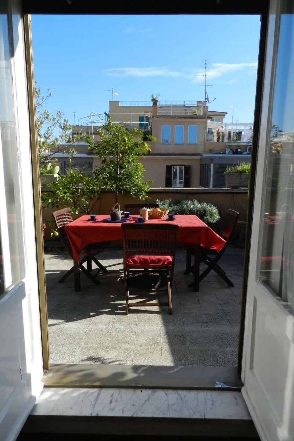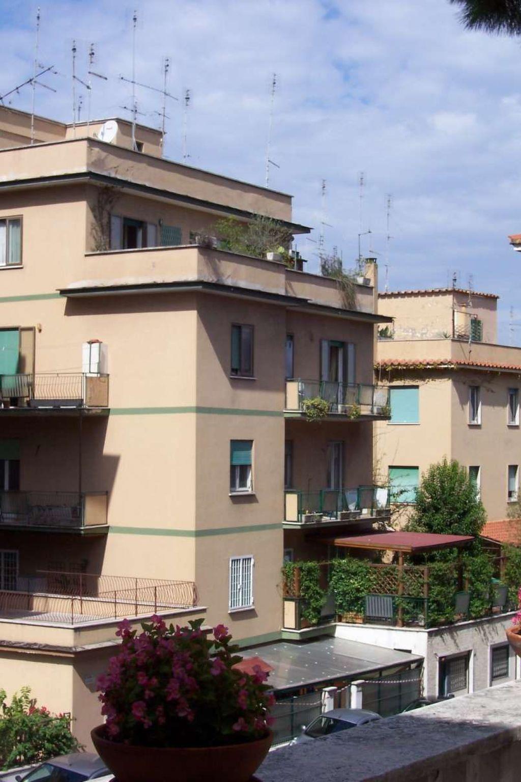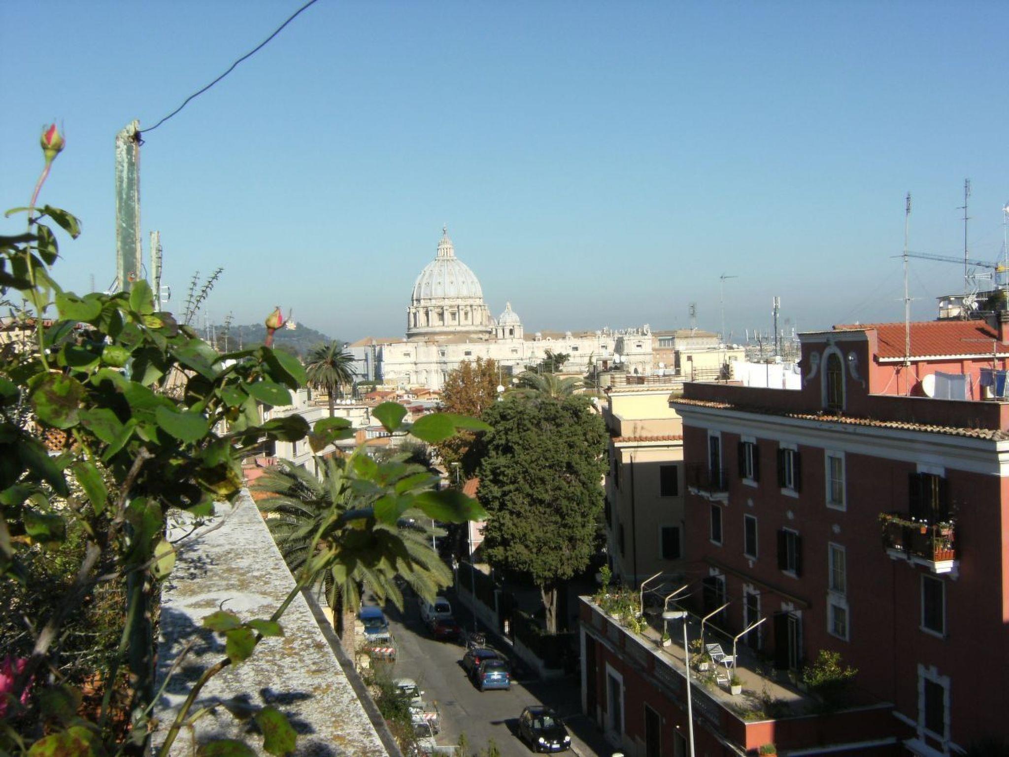 The holiday flat - an attic with a large roof terrace - is located in a very good and relatively quiet residential area with a stunning view of Rome's main church, San Pietro.