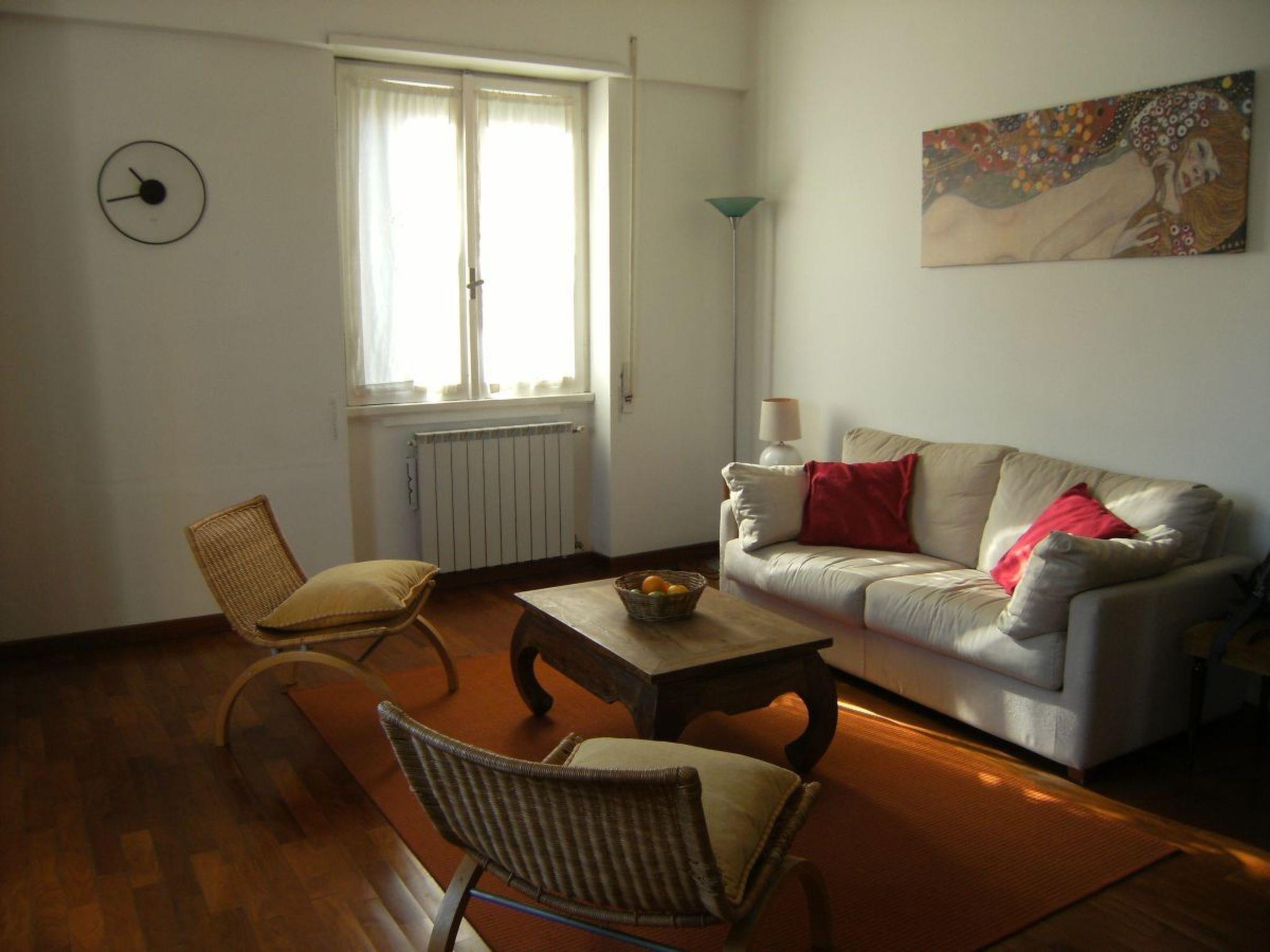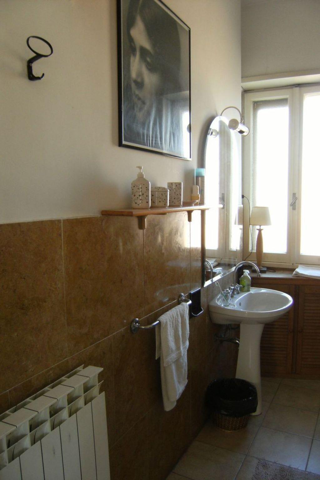 The quiet and light-flooded flat (approx. 75 sqm) with windows on 3 sides is located on the 4th floor (a new lift has been available since 2011!) of a small apartment building and is attractively furnished: large living/dining room with access to the terrace, large satelliteTV, dvd player, ceiling fan, new double sofa bed, another 3-seater couch and 2 armchairs, large bedroom with ceiling fan, kitchen (***) with dishwasher and washing machine, view of S. Pietro and exit to terrace, bathroom (with bathtub, hairdryer). The furnishings are good and very well maintained, beautiful parquet floors, central heating (gas).