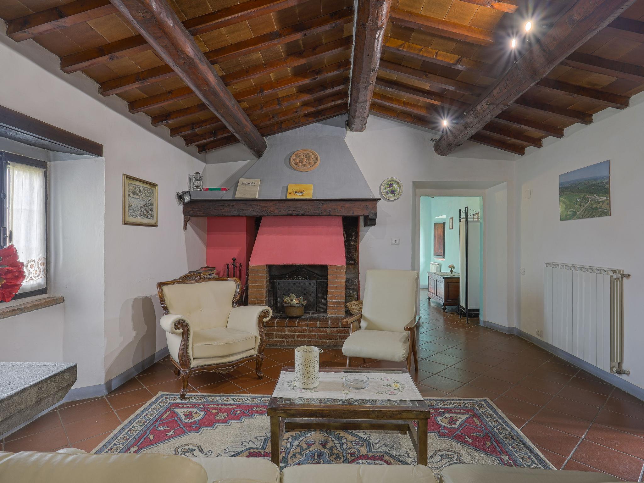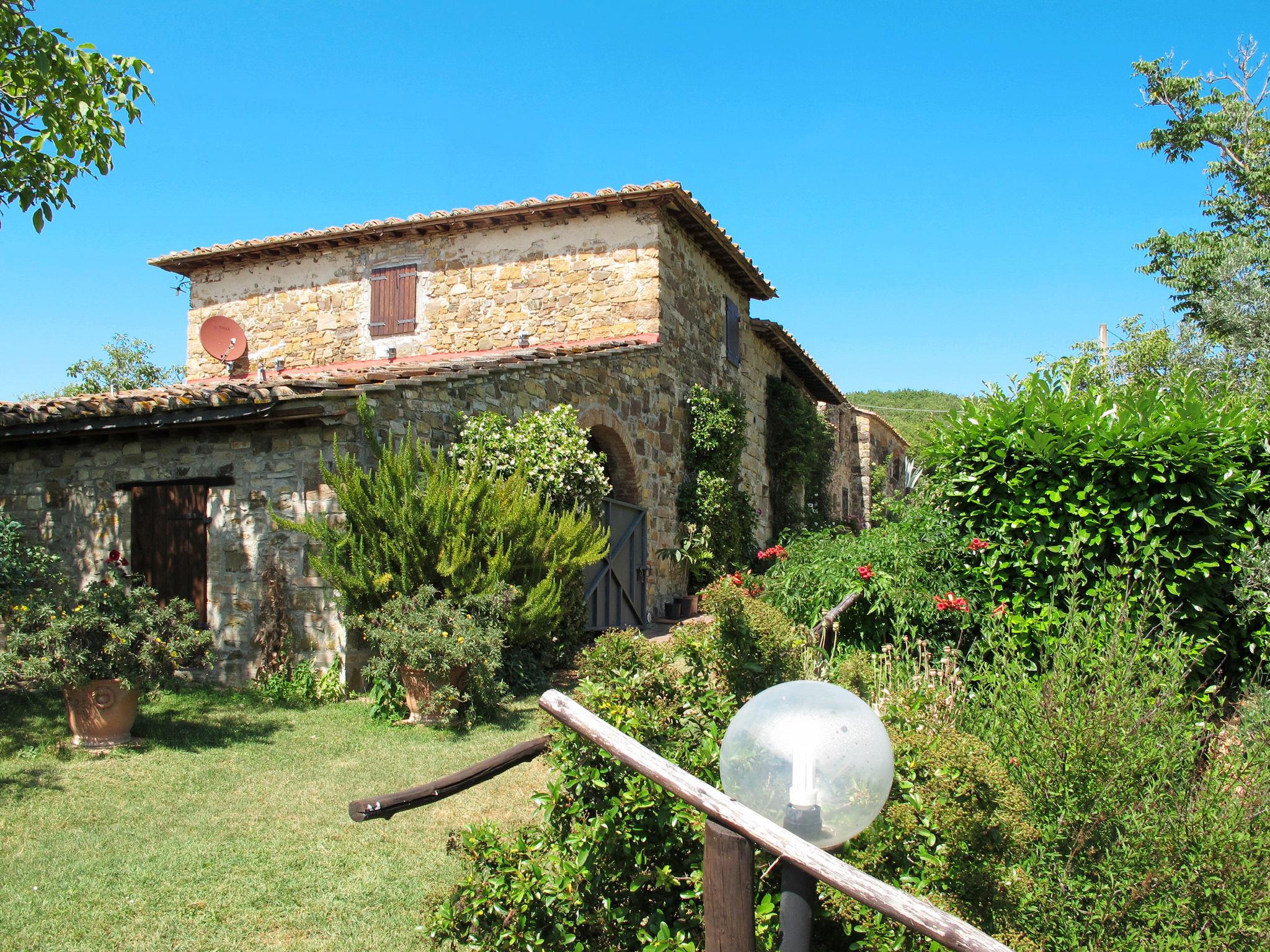 "Il Casale", 4-room cottage 120 m2, on the upper floor. Spacious, rustic and cosy furnishings: upper floor: (exterior staircase) large living/dining room with open-hearth fireplace, dining table and satellite TV. Walk-through room with 1 french bed (160 cm). 1 small room with 2 beds (80 cm). Interconnecting room with 1 french bed (160 cm), separate WC. Kitchen (oven, dishwasher, 4 gas rings, toaster, microwave, electric coffee machine). Shower/WC. Gas heating. Natural stone floors. Comfortable furnishings in the country house style. Patio, porch. Terrace furniture, barbecue, deck chairs. Very beautiful panoramic view of the countryside. Facilities: washing machine, children's high chair, baby cot for up to 2 year olds, hair dryer, logs (extra). Internet (WiFi, free). Parking at the house. Please note: non-smokers only. Maximum 1 pet/ dog allowed. The pool mentioned in the description is for private use. IT048038C2XFJB6OSG