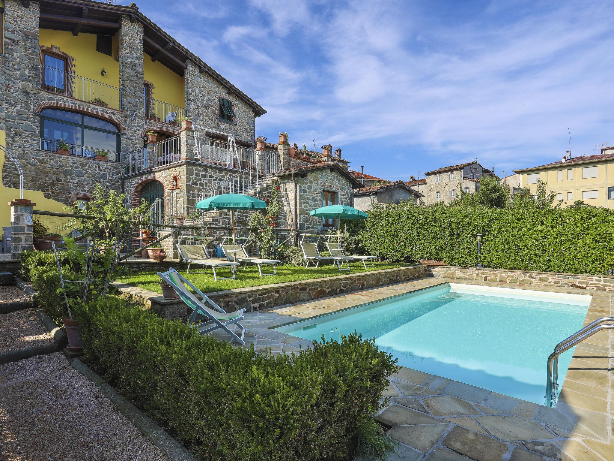 "rustico" cottage "Carla", 400 m a.s.l.. In the hamlet Lugliano 6 km from the centre of Bagni di Lucca, 35 km from the centre of Lucca, 48 km from the centre of Pisa, 56 km from the sea. Private: property 200 m2 (fenced), terraced garden, swimming pool (7 x 3 m, depth 140 cm, seasonal availability: 01.May. - 01.Oct.). Outdoor shower. In the house: washing machine (for shared use), heating available only from 15.Nov. - 15.Apr.. 3 km long narrow motor access. Stepped path (27 steps) to the house. Parking on the premises. Supermarket 6 km, bus stop 300 m, sandy beach 56 km. Please note: the owner lives in the same residence.