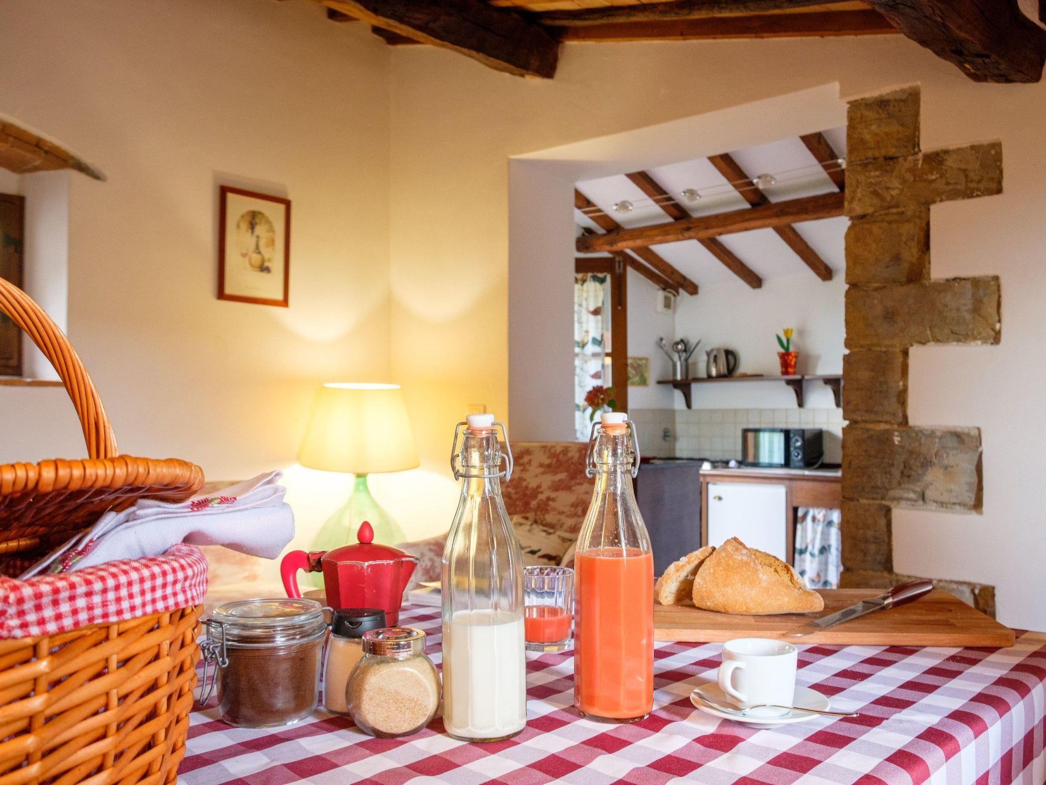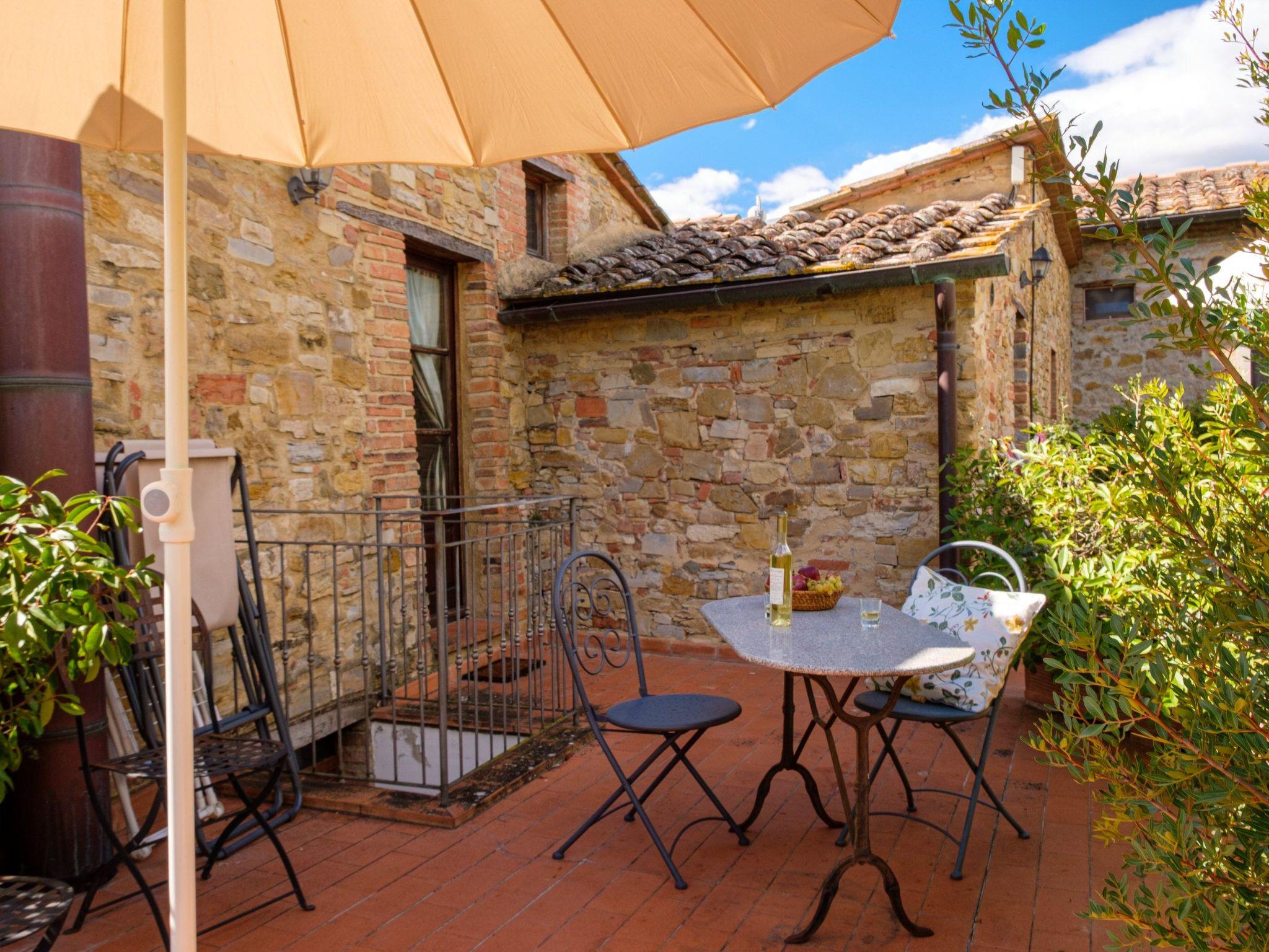 Flat in the Podere Ticciaia (40 sqm on one floor, access via stairs, 2 people). Beautiful and romantic flat with 1 double bedroom, bathroom with shower, living/dining area, kitchenette with access to private terrace with table and chairs, shared olive garden with relaxing view. Flat equipped with air conditioning.