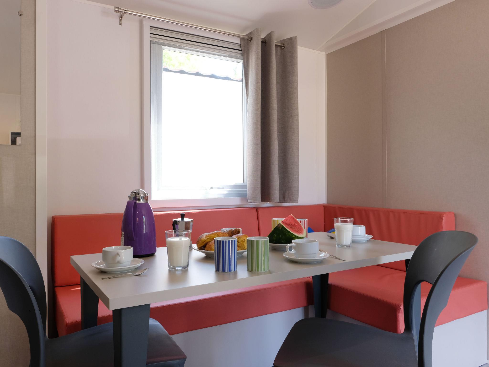 "Happy Premium Suite", 4-room mobile home 30 m2. Comfortable furnishings: living/sleeping room with dining table, electric heating and air conditioning. 1 room with 1 french bed (140 cm, length 190 cm). 2 rooms, each room with 2 beds (70 cm, length 190 cm). Open kitchen (4 hot plates, microwave, freezer, electric coffee machine). Shower/WC. Air-conditioning (extra). Terrace partly roofed. Terrace furniture, electric barbecue (portable), deck chairs (2). Facilities: mosquito net. Parking (1 car). Please note: non-smokers only. IT023006B143AX8QZE