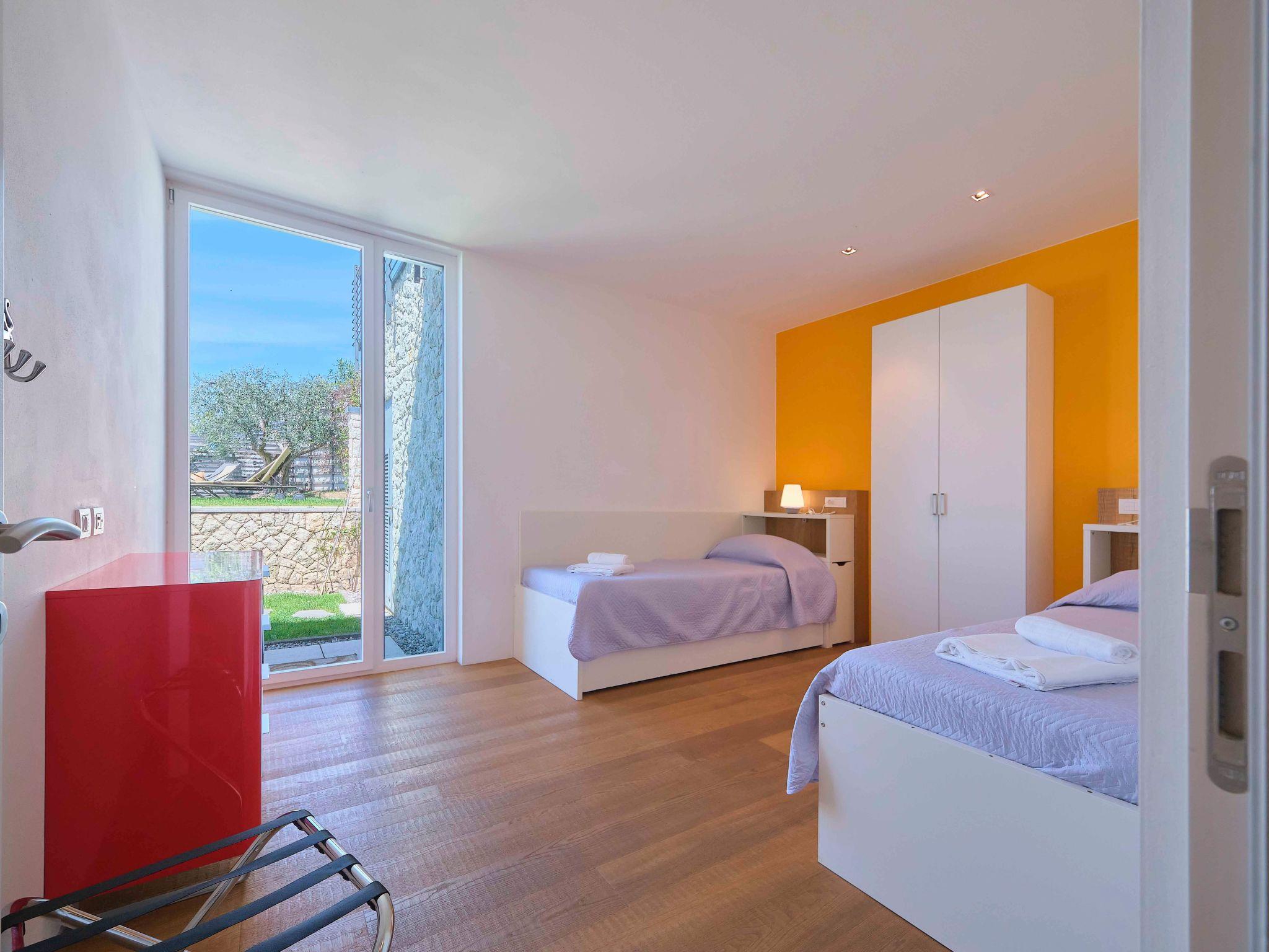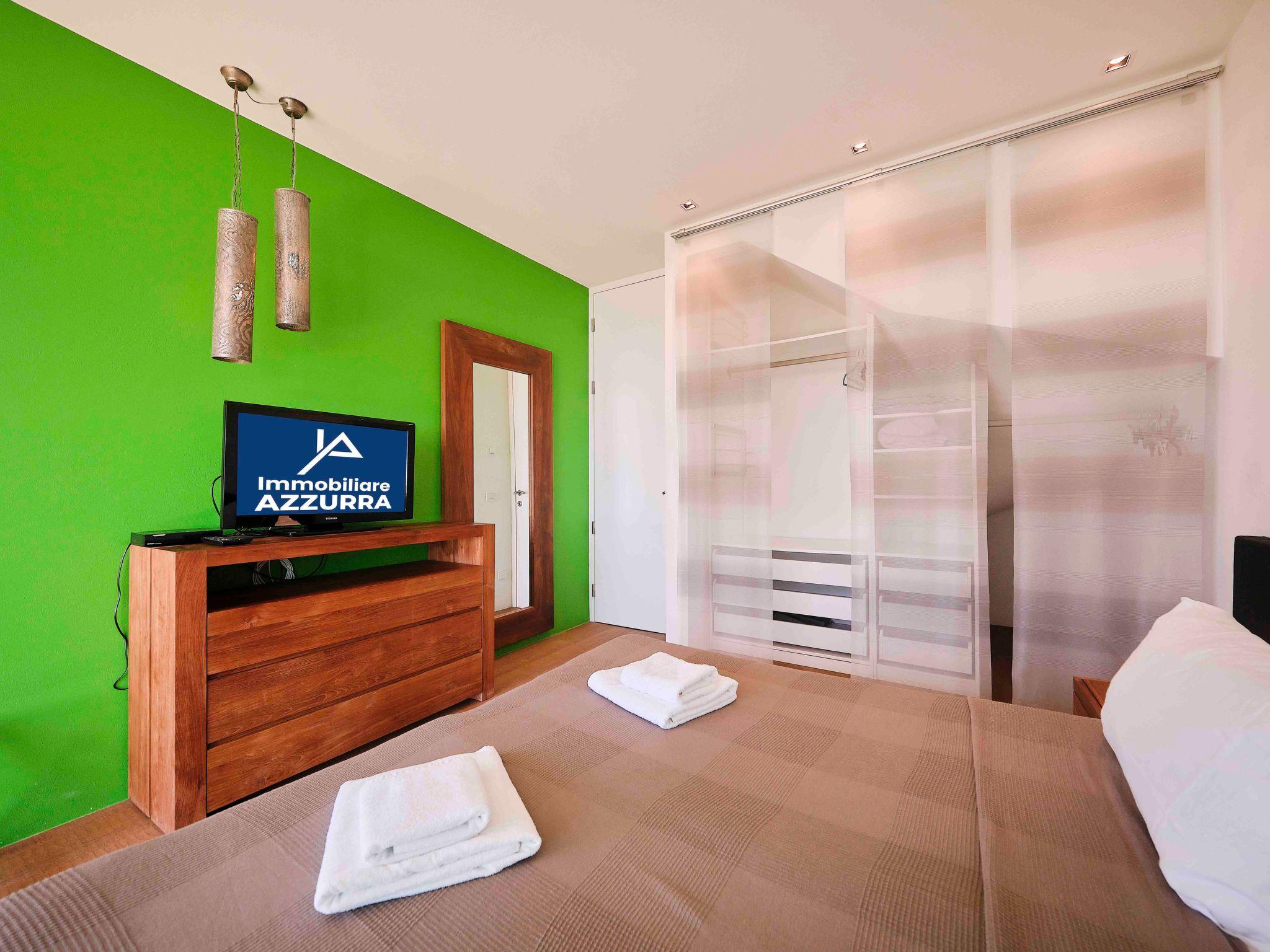 The villa is divided vertically into 2 properties. We rent the property overlooking the swimming pool (3.5 x 10 metres) which can accommodate a maximum of 8 persons. The entrance is on the upper floor and consists of a living room with sofa (convertible into a sofa bed 160 x 200 cm), dining area with kitchenette and a bathroom. On the ground floor, accessible via a convenient staircase, there are 3 bedrooms, two of which have a double bed 180 x 200 cm, while the third bedroom has 2 single beds and a further 2 foldaway beds underneath. Also on the same floor are 2 large bathrooms, both with shower. The kitchen is brand new, equipped with dishwasher, induction hob, oven, refrigerator and freezer. The property is equipped with air conditioning, satellite TV, Wi-Fi, electric shutters, electric awnings on the terrace and barbecue.
