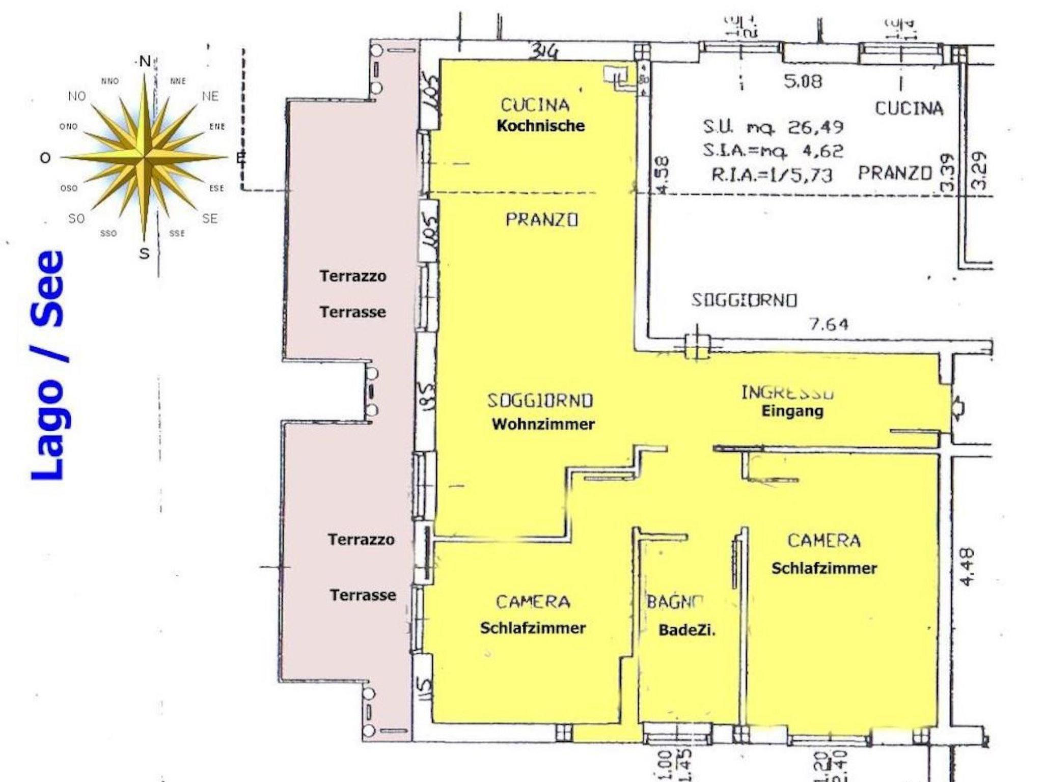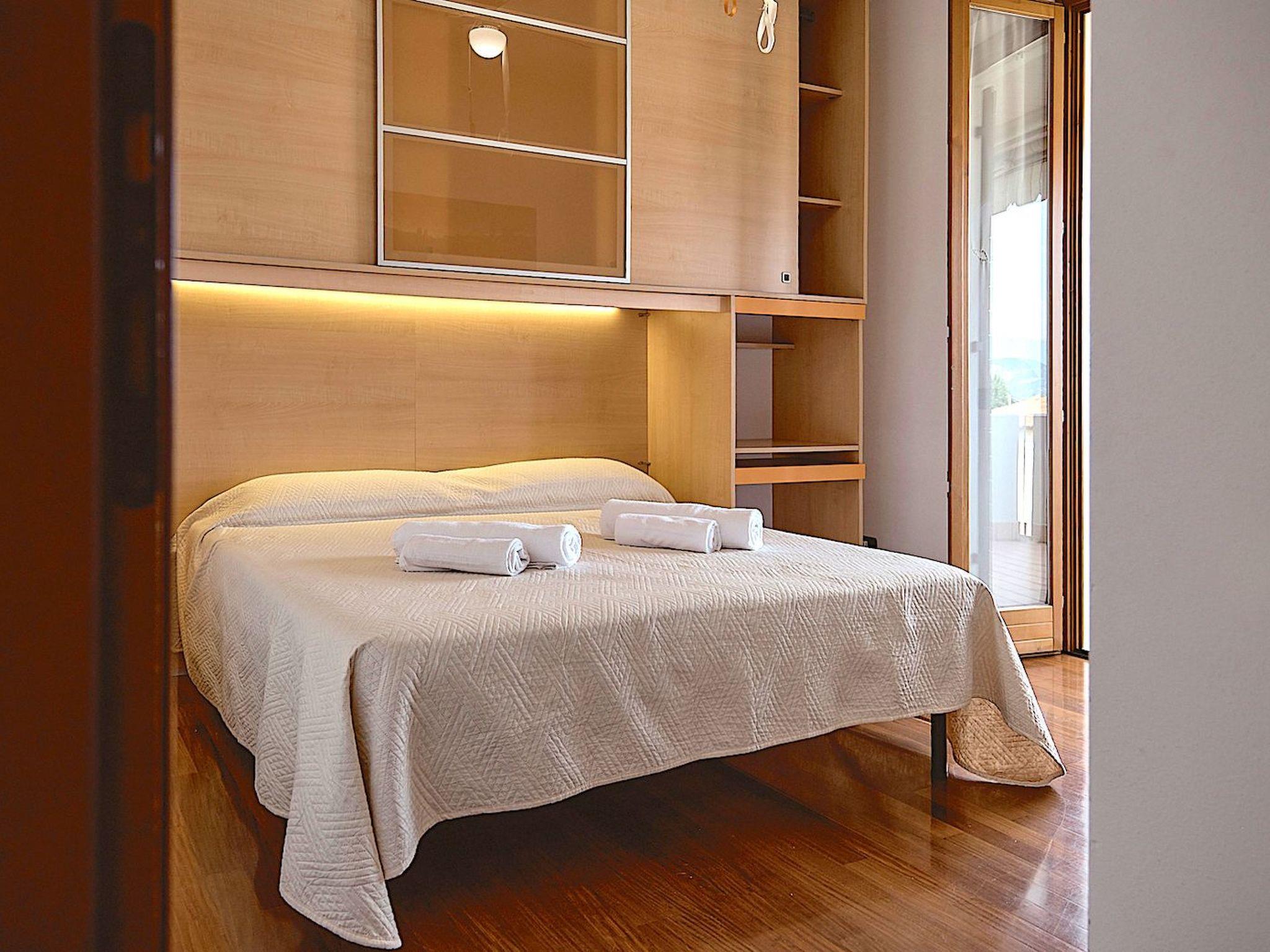 The exterior is distinguished by a spacious 20 sqm terrace, accessible from both the living room and the bedroom. Facing west, it offers a wonderful view of the lake and the swimming pool, creating the perfect ambience for relaxing evenings or to start the day with an al fresco breakfast. In addition, the condominium boasts a large rooftop solarium, shared by the residents, from which one can enjoy a splendid lake view.