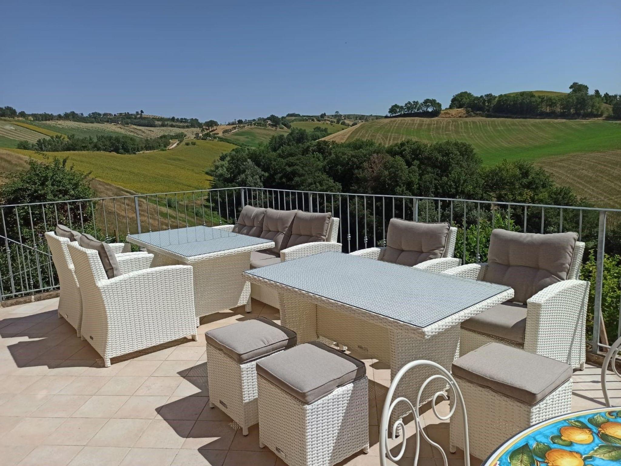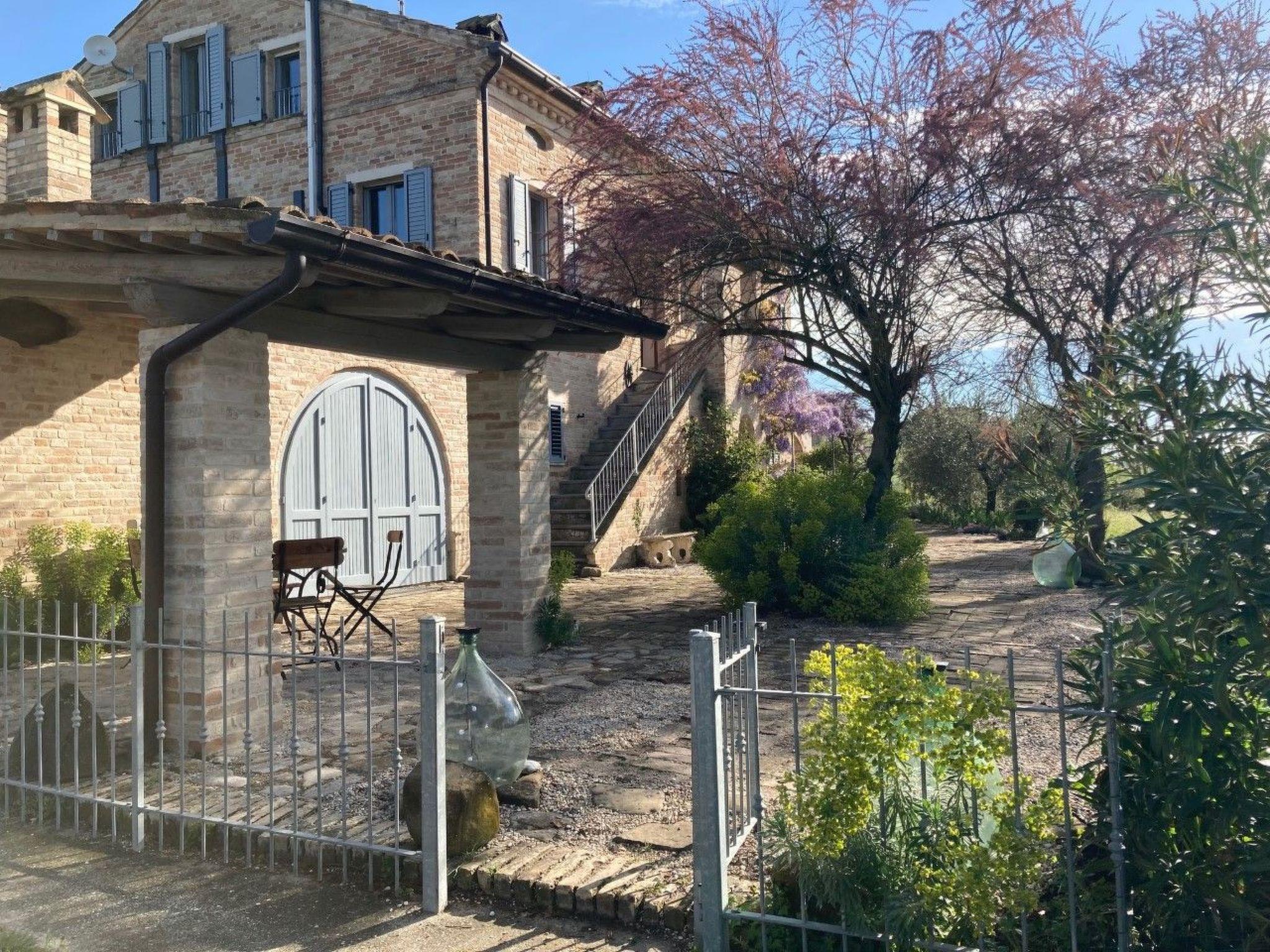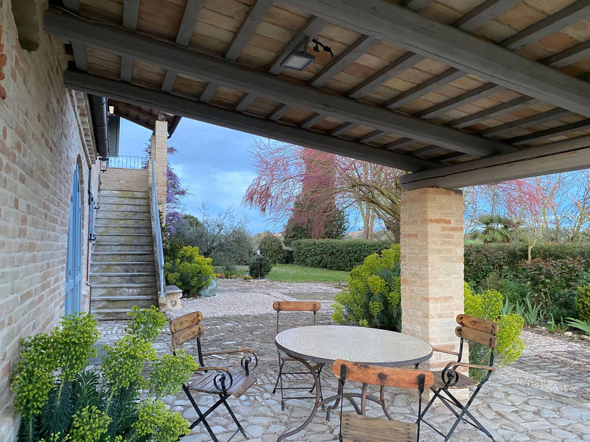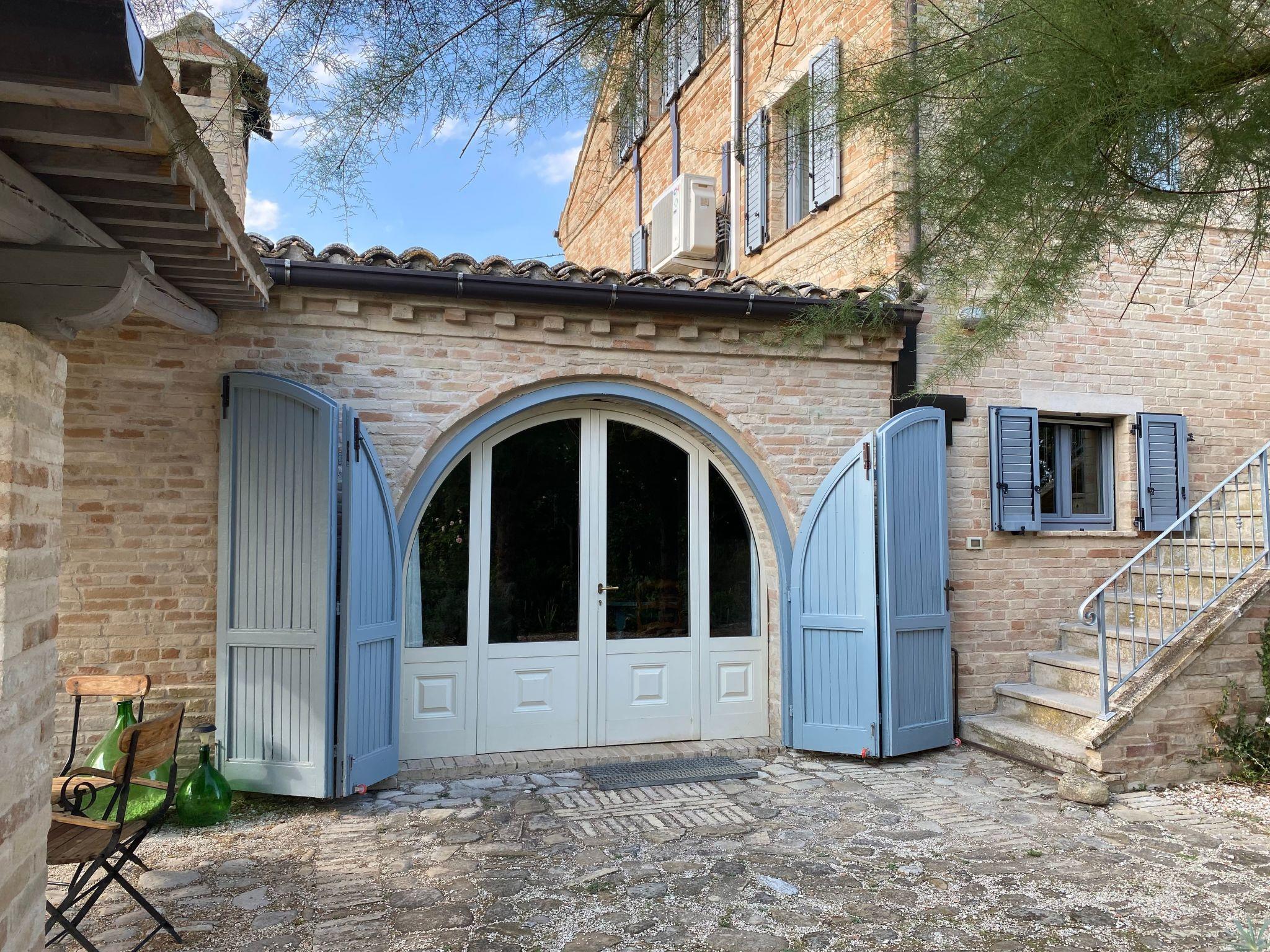 From the upper terrace there is a wonderful view of the hilly landscape of the Marches, the pool, the garden and the Sibillini mountains in the background. The garden is completely fenced, and the tarmacked access road is very quiet with no through traffic, which means that it is extremely quiet. There are 4-5 parking places in front of the house.