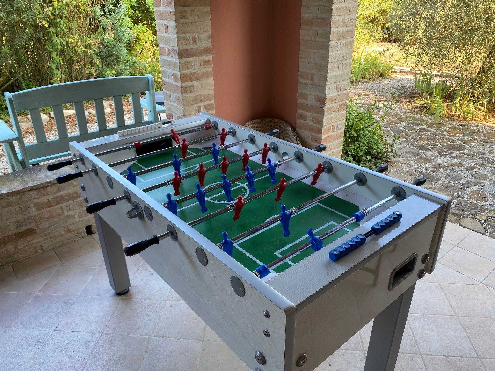 The outdoor pool with shower is 12 metres long, 4 metres broad and 1.40 metres deep for the exclusive use of our guests. We are also offering guests a fitness room in the garden with a spin bike, an elliptical, and pilates/yoga equipment. In the back area of the garden there is enough space to fix a net in order to play volleyball or badminton. There is a foosball table in the summer kitchen, which is popular with families. We also have all sorts of soft play toys and pool toys to keep little ones happy.