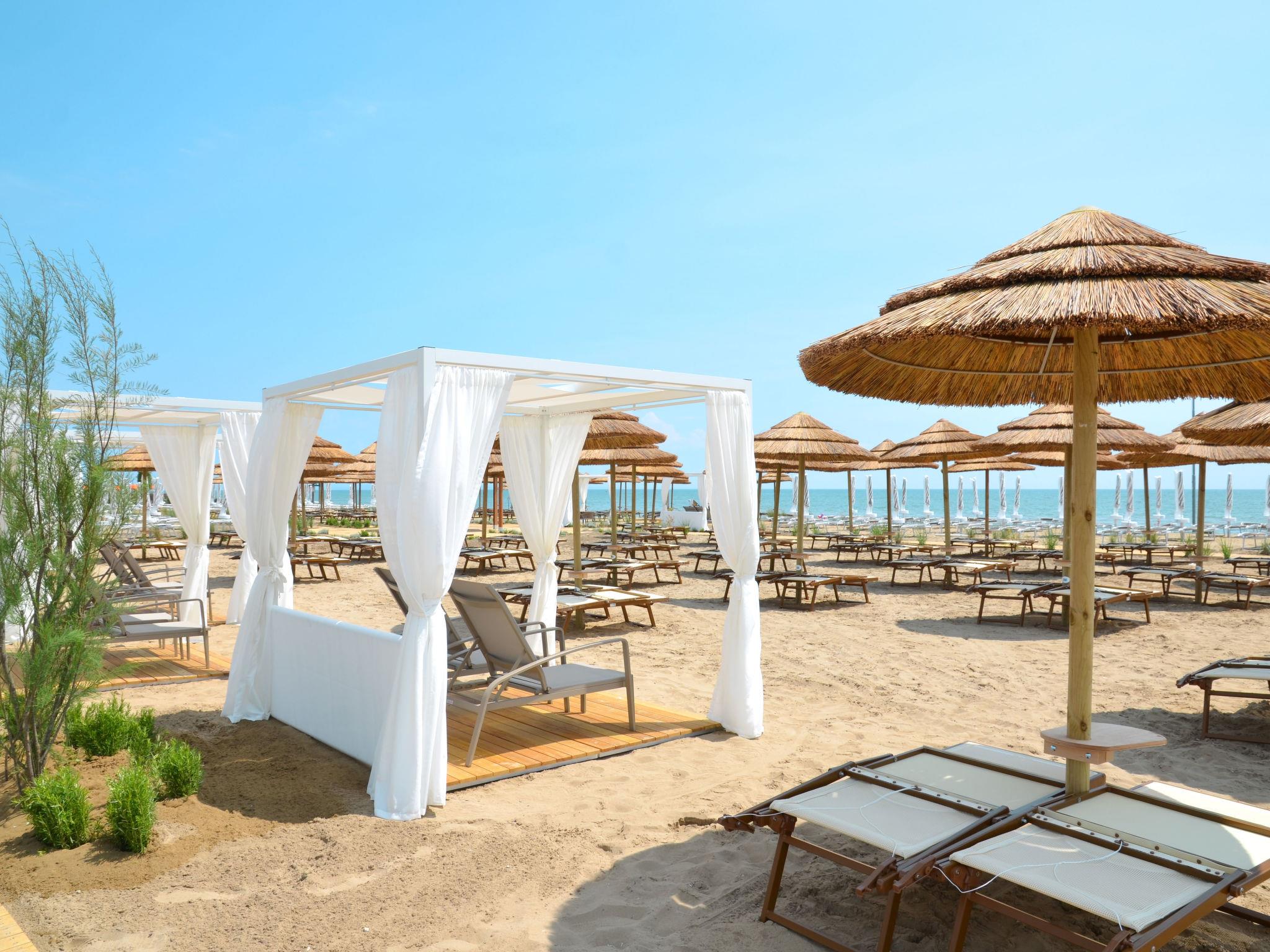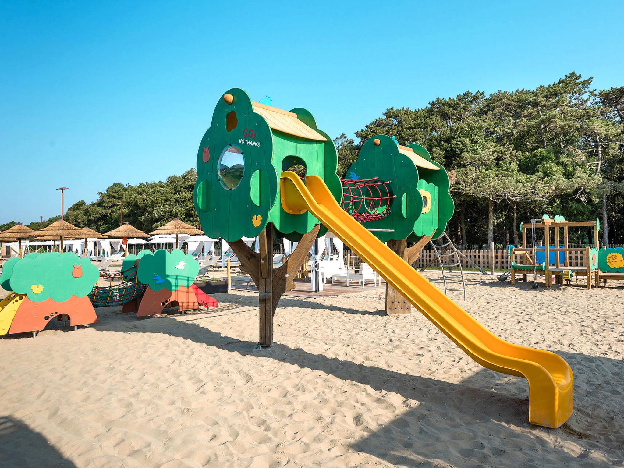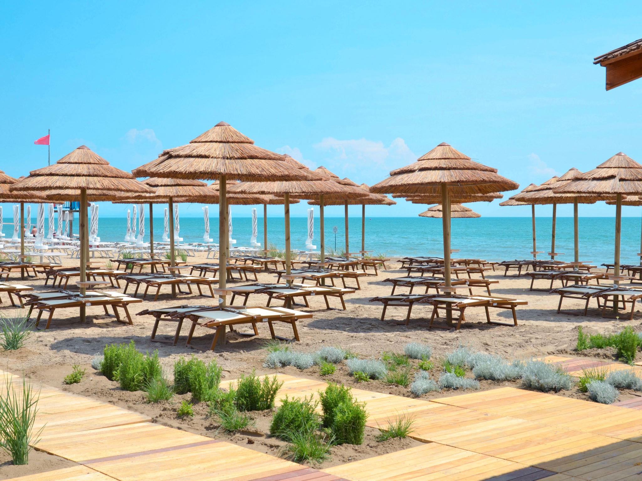 Large, child friendly, modern resort "Lino delle Fate Eco Village". 290 apartments in the residence. In the district of Bibione-Lido dei Pini 1.8 km from the centre of Bibione, 13 km from the centre of Lignano, 100 km from the centre of Venezia, 450 m from the sea, 450 m from the beach. For shared use: property 25 ha, park, well-kept garden with lawn and plants, biotope, swimming pool (1'000 m2, seasonal availability: 28.Mar. - 02.Nov.). Children's pool, outdoor shower, private beach, hot tub, children's playground. In the complex: restaurant, bar, washing machine, tumble dryer (for shared use, extra), bicycle rental. Linen change weekly. Towel change 2 times per week. Room cleaning weekly. Breakfast and half board possible (extra). Communal covered parking. Central parking spaces. E-charging station. Shop, grocery 300 m, bus stop 900 m, railway station "Latisana (Venezia-Trieste)" 21 km, sandy beach 700 m, thermal baths "Bibione Thermae" 3.5 km. Golf course (18 hole) 8 km. Nearby attractions: Oasi Naturalistica Val Grande 3.5 km, Golf Club Lignano, 20 % reduction on, green fee. Please note: car-free holiday complex. Entertainment in the season. Suitable for families. Beach service: During summer season 1 parasol and 2 sunbeds per apartment included in the price.