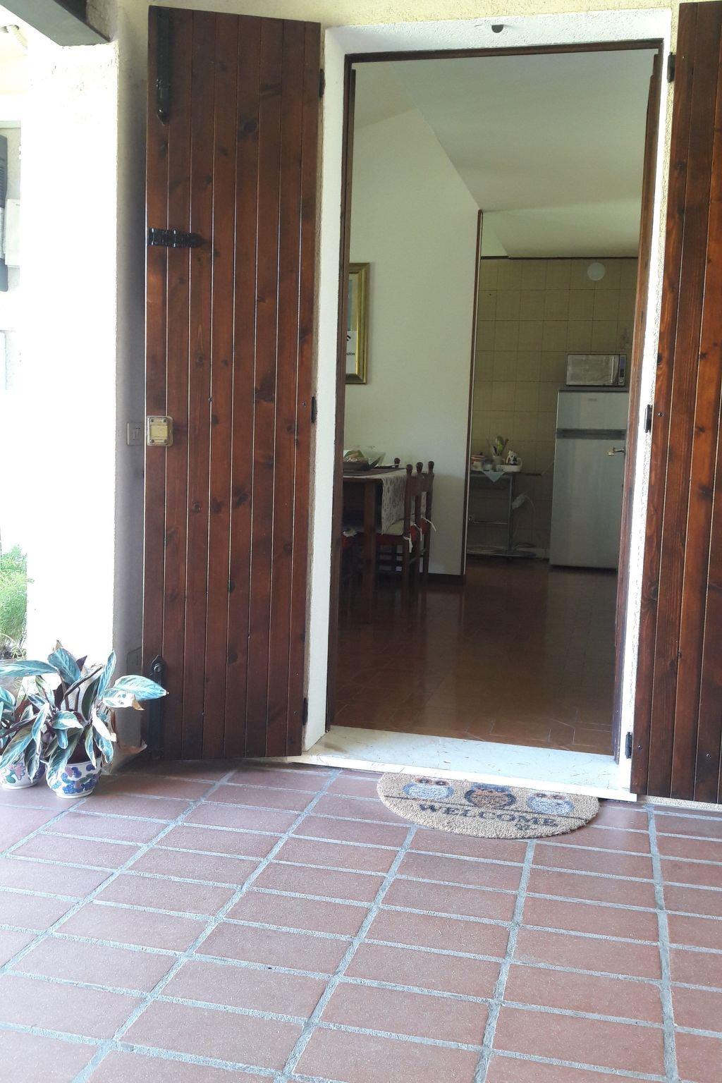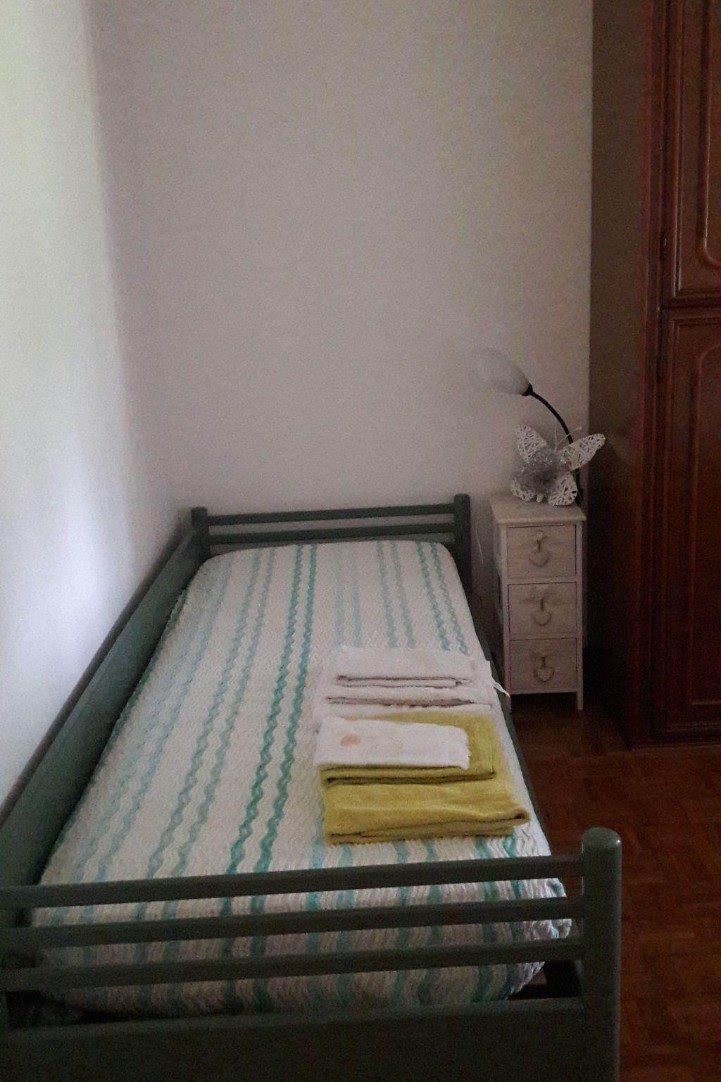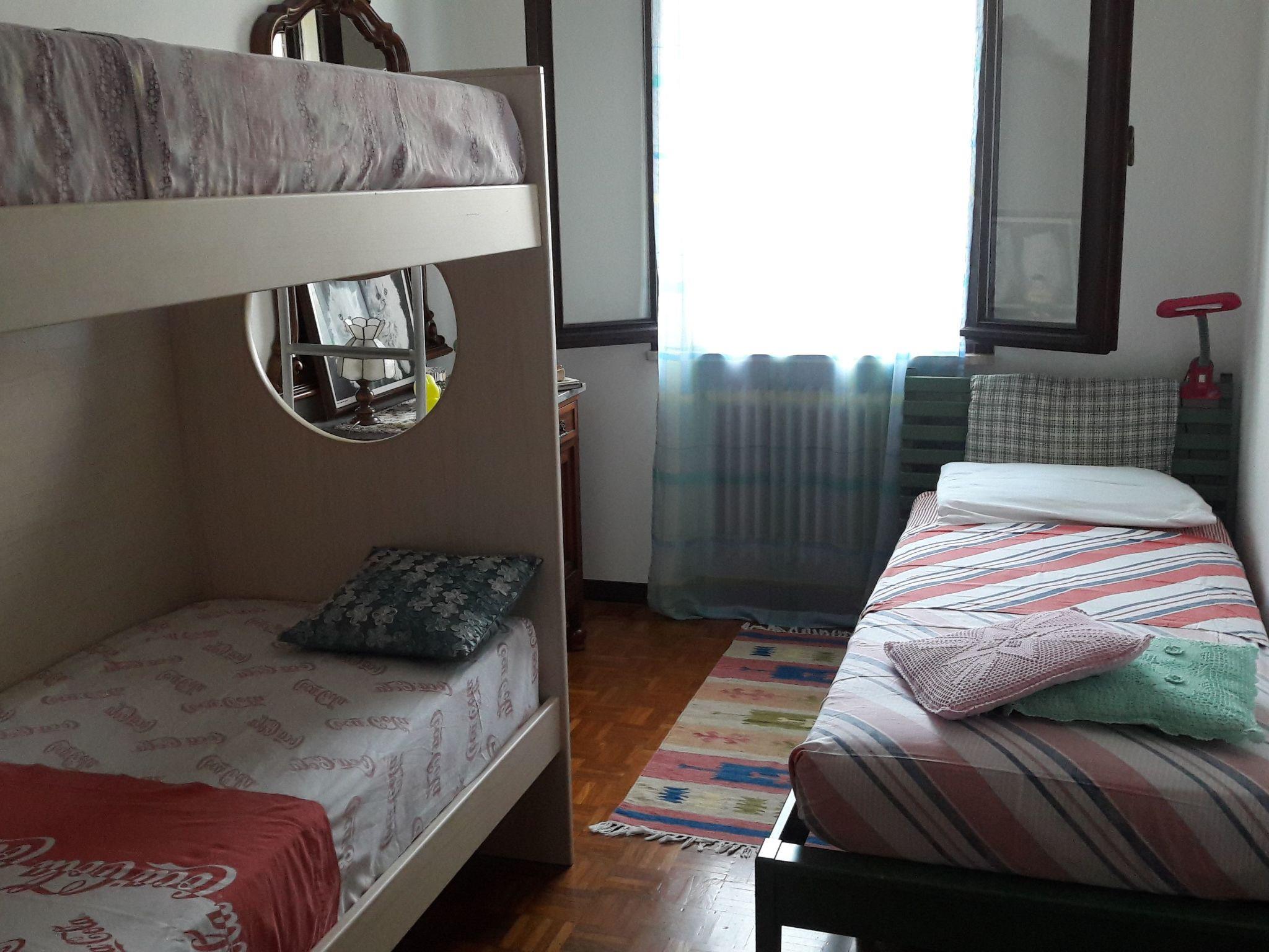 This is a very comfortable flat, 75 sqm. It is on the ground floor, overlooking the garden and with a separate entrance. It is equipped with air conditioning and heating in all rooms. The flat consists of the following rooms: . an access patio, with a table, chairs and a bench . a living room, with a dining table for 8 people, a sofa for three people, a flat-screen TV, a wooden cupboard containing plates, glasses, cups, a blender and a toaster . a kitchen, new, equipped with a 4-burner cooker and electric oven plus microwave oven and refrigerator with freezer . a large bathroom, with a window, equipped with a bathtub and shower, toilet, bidet, sink and washing machine . a bedroom with a light-coloured wooden bunk bed, and a single bed, a dresser and a large mirror . a double bedroom with a wardrobe, bedside tables and a bunk bed. Possibility of adding an additional single bed or a cot. Long corridor with wooden and glass cabinet containing towels and linen.