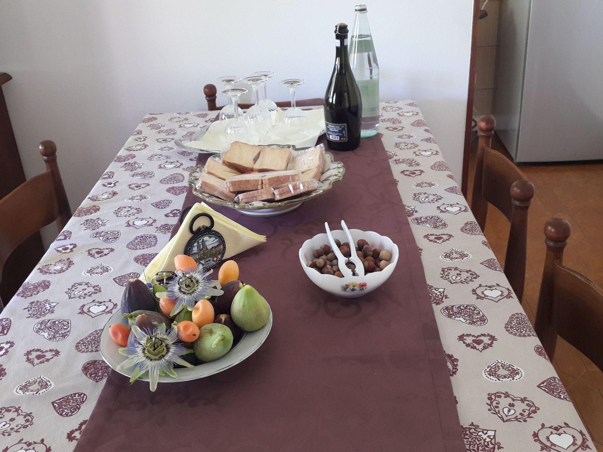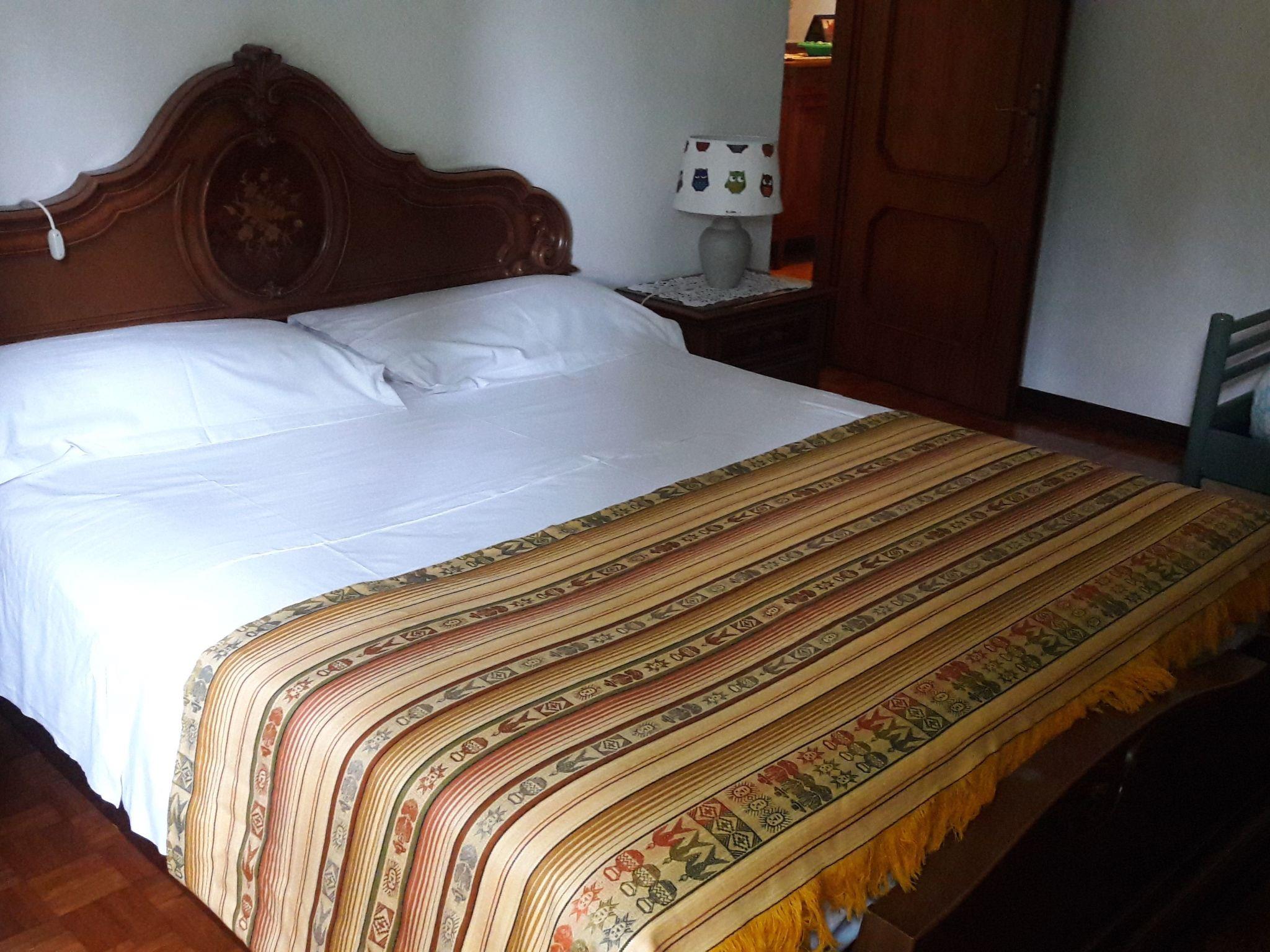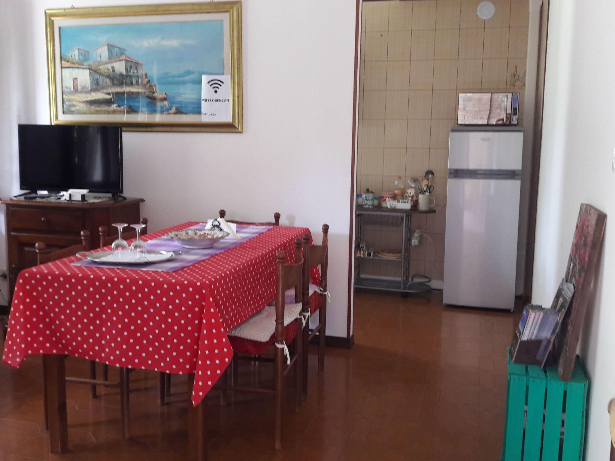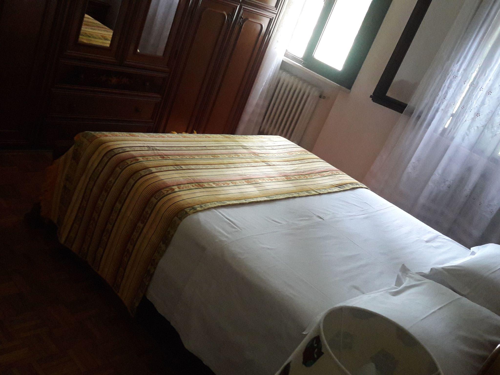 This is a very comfortable flat, 75 sqm. It is on the ground floor, overlooking the garden and with a separate entrance. It is equipped with air conditioning and heating in all rooms. The flat consists of the following rooms: . an access patio, with a table, chairs and a bench . a living room, with a dining table for 8 people, a sofa for three people, a flat-screen TV, a wooden cupboard containing plates, glasses, cups, a blender and a toaster . a kitchen, new, equipped with a 4-burner cooker and electric oven plus microwave oven and refrigerator with freezer . a large bathroom, with a window, equipped with a bathtub and shower, toilet, bidet, sink and washing machine . a bedroom with a light-coloured wooden bunk bed, and a single bed, a dresser and a large mirror . a double bedroom with a wardrobe, bedside tables and a bunk bed. Possibility of adding an additional single bed or a cot. Long corridor with wooden and glass cabinet containing towels and linen.
