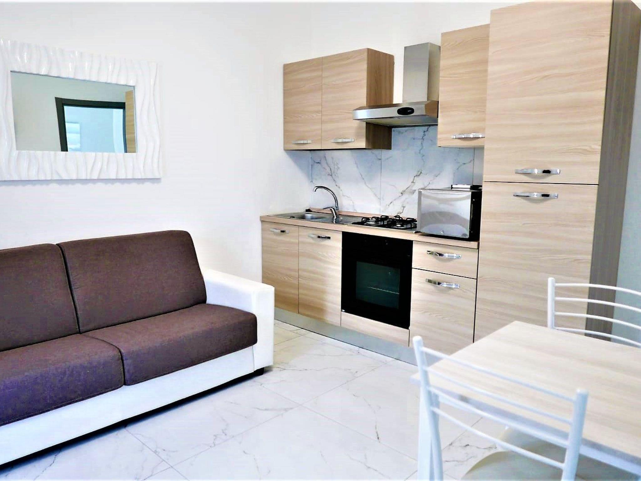 The entrance opens onto a bright living area with French window leading to a habitable balcony. The open-plan environment includes a living room with a double sofa bed, dining area with a table seating six and an open-plan kitchen equipped with electrical appliances: refrigerator with separate freezer compartment, ventilated oven, microwave oven and all the equipment necessary for cooking with comfort.