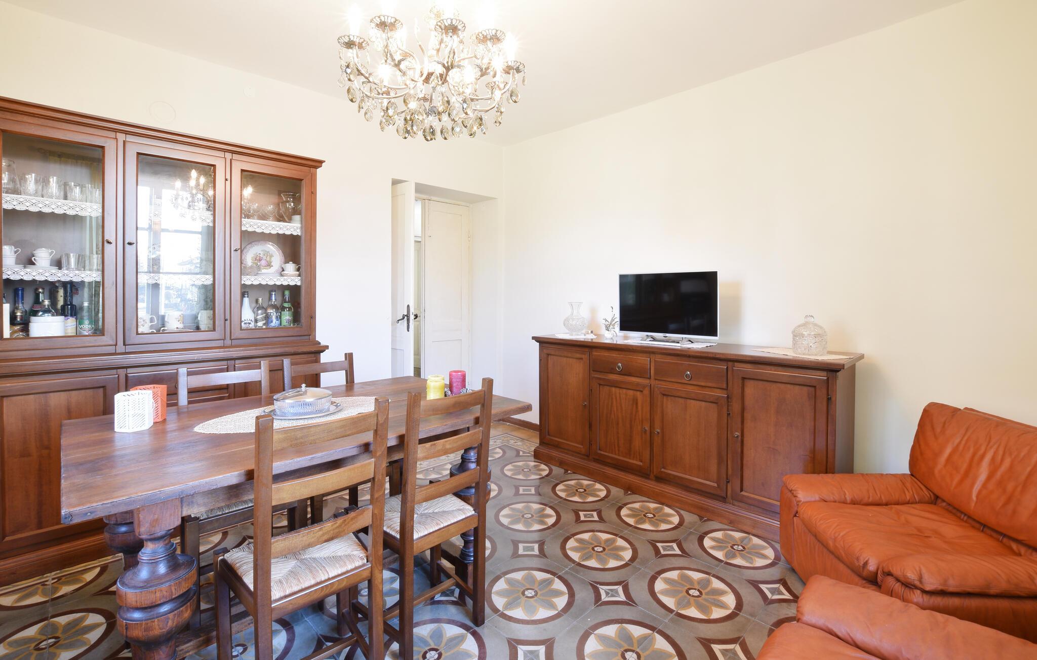 Nyd tiden sammen i det hyggelige interiør i denne indbydende ferielejlighed, som er noget særligt med varme farver og fine detaljer. Lav mad sammen i det fuldt udstyrede køkken med et retro-touch og nyd jeres måltider ved det indbydende spisebord med udsigt over de grønne træer. Efter en begivenhedsrig dag kan I lægge fødderne op i den komfortable sofa og nyde en spændende bog eller have en spilleaften.