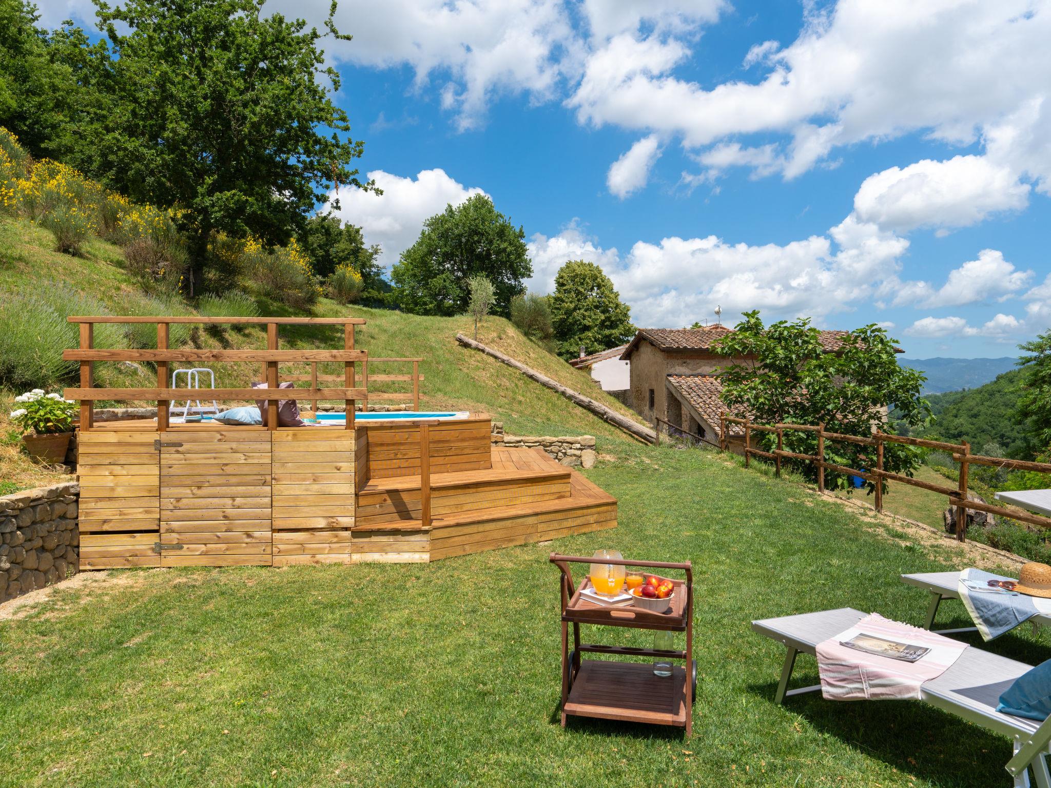 Country house "Olimpia", 150 m a.s.l., semi-detached, renovated in 2023. 4.5 km from the centre of Borgo San Lorenzo, 25 m from the centre, in a secluded, quiet, sunny position on top of a hill, in the countryside. Private: garden 1'000 m2 (not fenced), swimming pool (above ground) (5 x 4 m, depth 120 cm, seasonal availability: 01.May. - 30.Sep.). Garden furniture, barbecue, pool maintenance by the owner/gardener. In the house: central heating system, heating to be paid on the spot, heating available only from 01.Nov. - 04.Apr.. Motor access to the house (200 m via unmade road). Parking on the premises. Shop 4.5 km, supermarket 4.5 km, bus stop 3 km, sandy beach "Versilia" 125 km, bathing lake "Bilancino" 20 km. Golf course (18 hole) 12 km. Nearby attractions: Vicchio, 11 km, Autodromo Nazionale del Mugello 12 km, Fiesole 17 km, Outlet Barberino 23 km. Owner lives in separate semi-detached house.