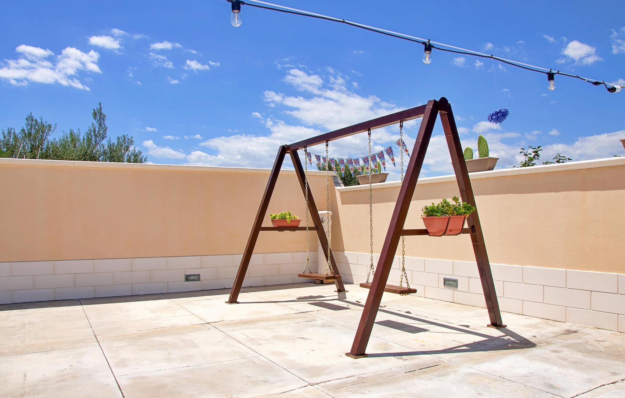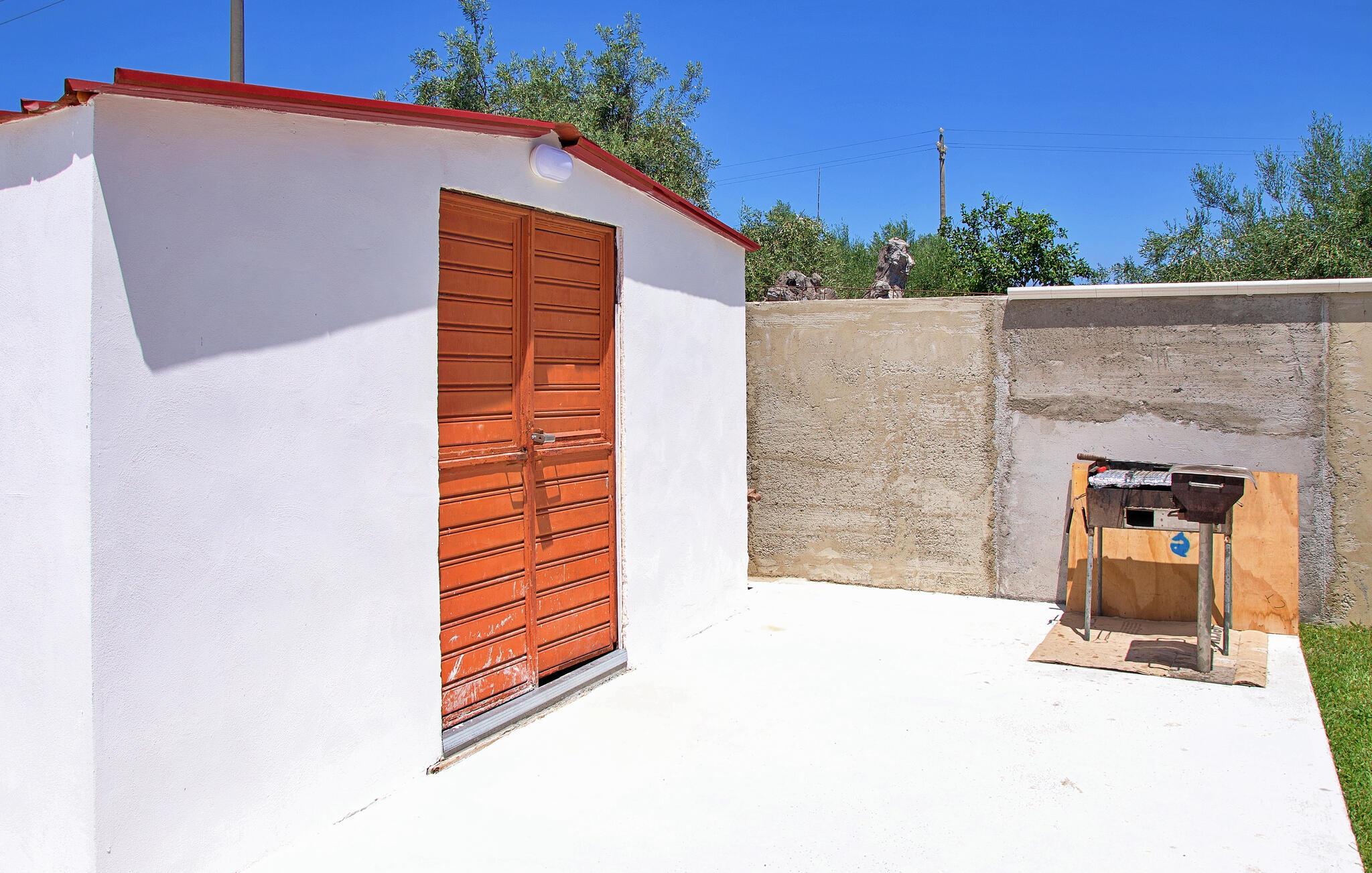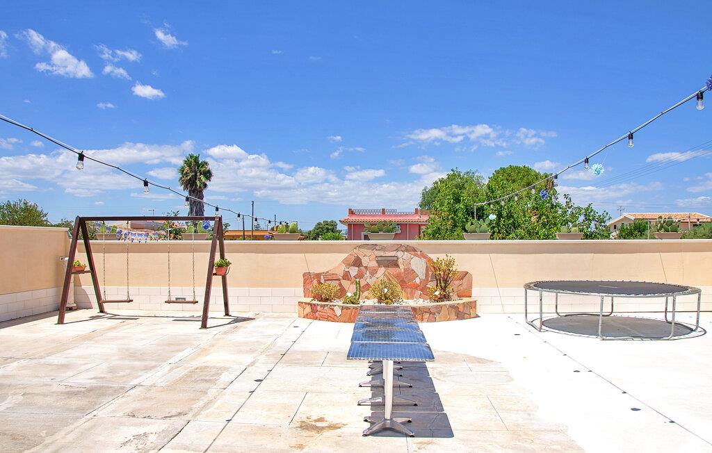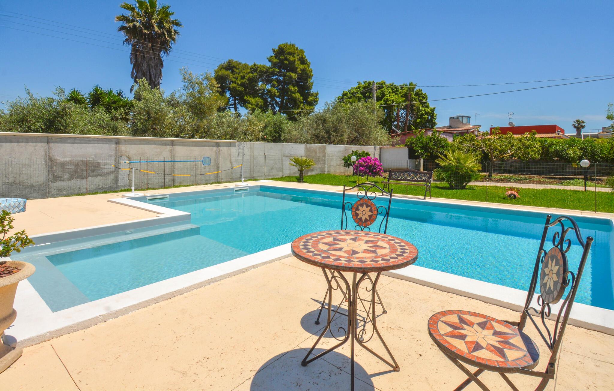 Kombiner afslappende timer ved poolen med spændende eventyr langs Siciliens østkyst, ideelt til en varieret ferie. Det farverige interiør i jeres feriehus skaber en venlig og indbydende atmosfære. Start dagen med en afslappet morgenmad ved spisebordet, eller gå ud på terrassen og nyd morgenens ro. Bagefter kan I forkæle jer selv med en forfriskende dukkert i den private pool. Udenfor inviterer en gynge og trampolin de yngre gæster til at lege og have det sjovt, mens de voksne slapper af i skyggen på den overdækkede terrasse.
