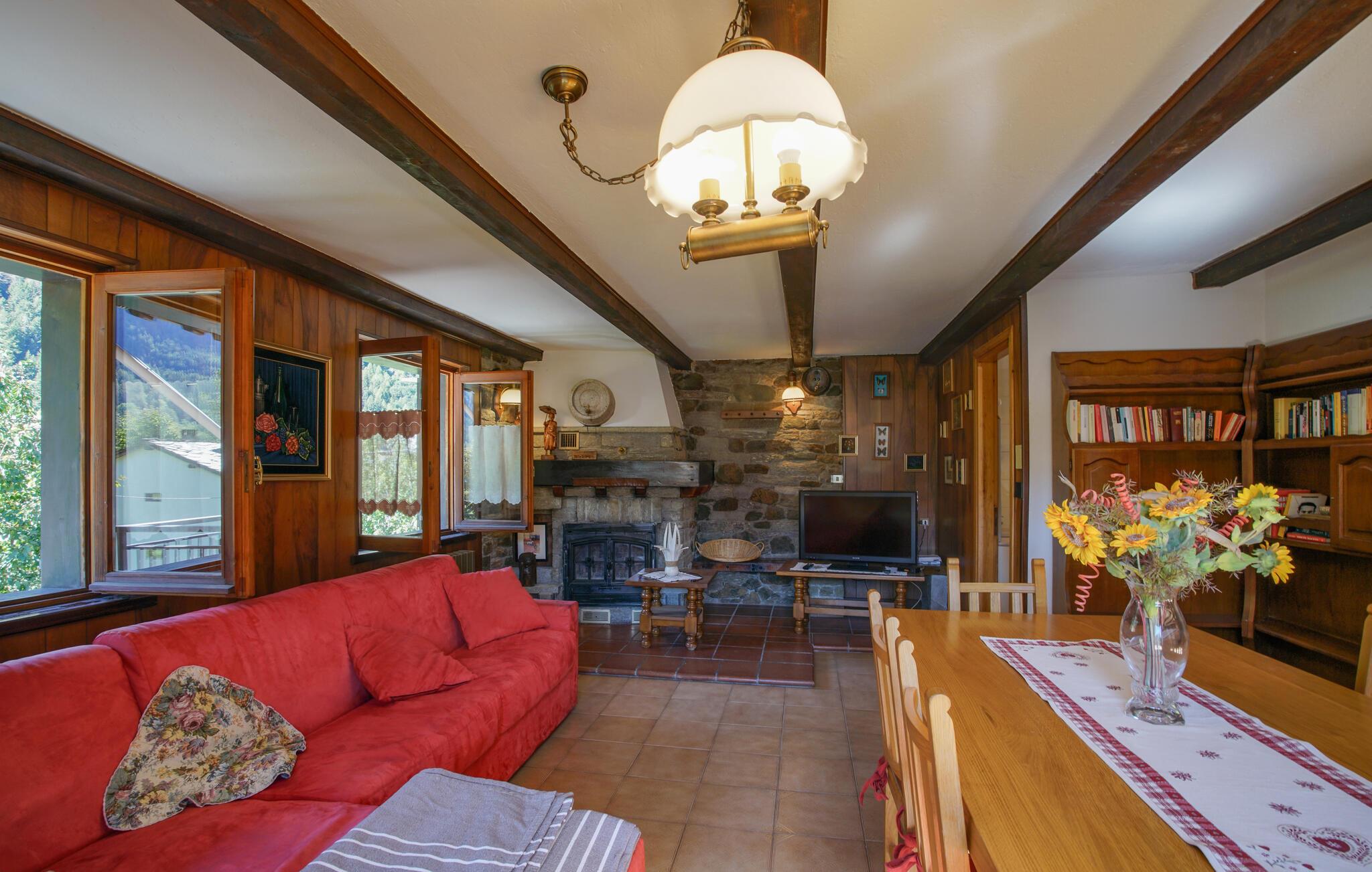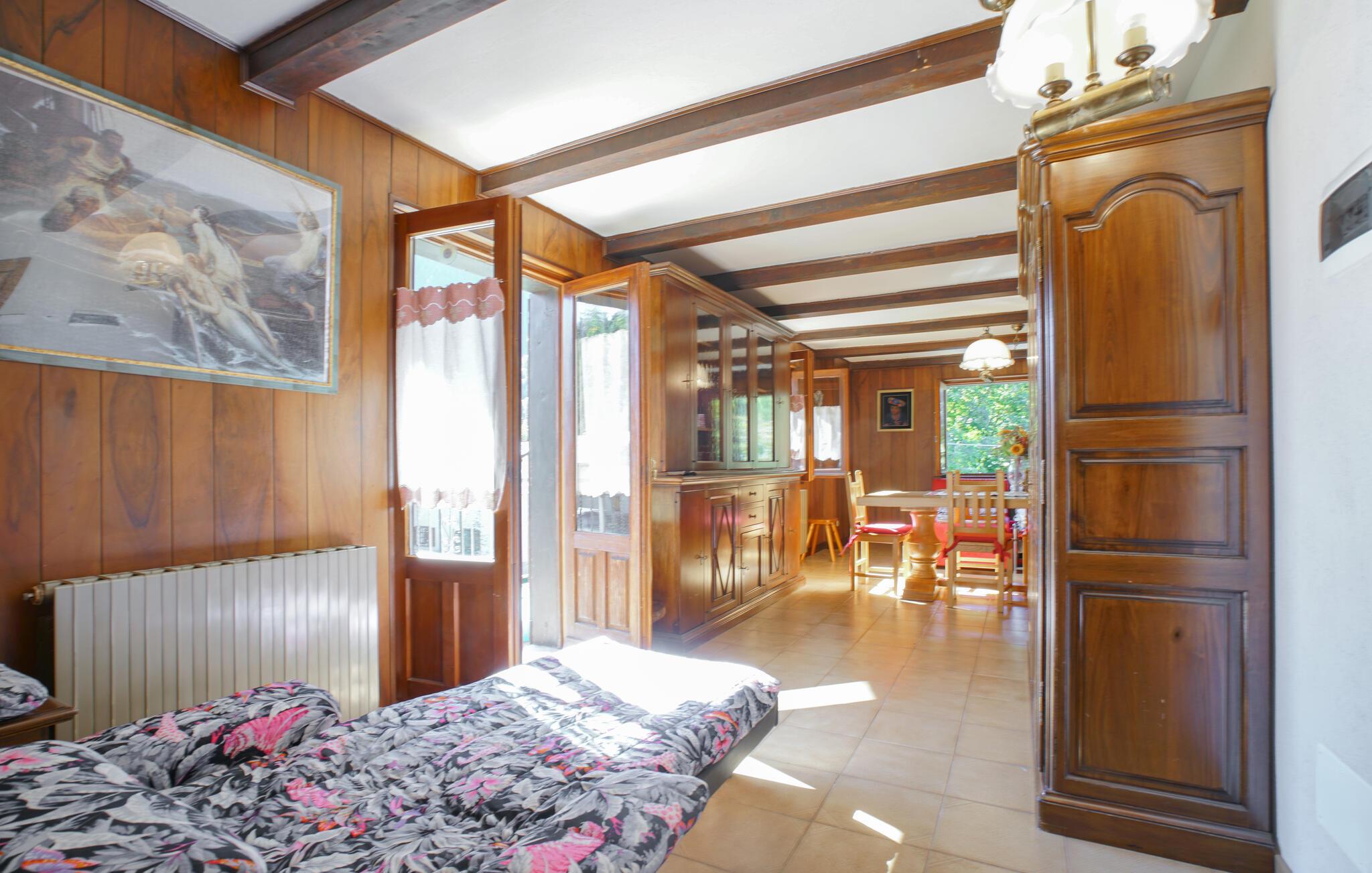 Jeres hyggelige feriehus i Vollon byder på rustik charme og varme træelementer. Den dejlige opholdsstue med komfortable siddepladser og et stort spisebord er ideel til hyggelige aftener med familie eller venner. Gør det behageligt foran brændeovnen og mærk husets hygge brede sig. Gå ud på balkonen og nyd den vidunderlige udsigt over de omkringliggende bjerge og den grønne dal. Her kan I slappe af med en kop kaffe eller te og nyde roen i naturen. Brug det veludstyrede køkken til at tilberede jeres yndlingsretter og nyd dem med udsigt over det maleriske landskab.