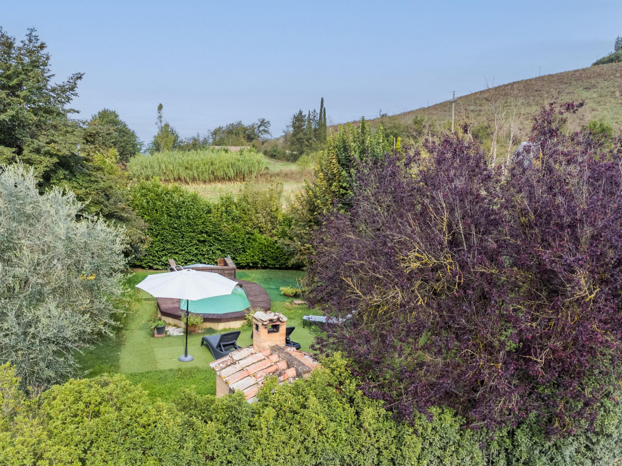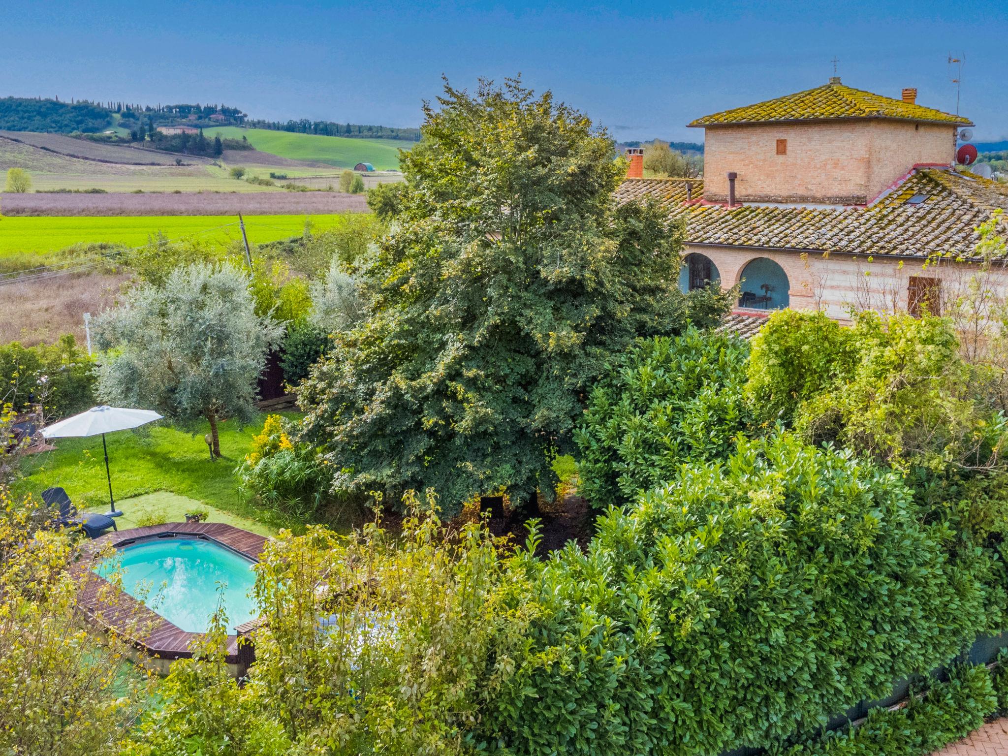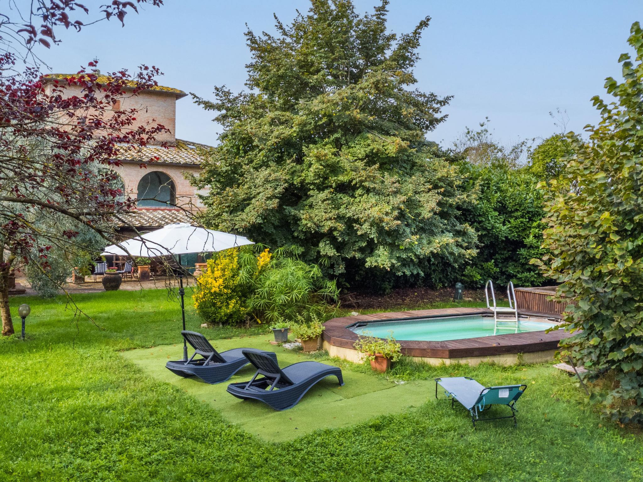 Buonconvento: Very comfortable cottage "Podere Palazzetto", 2 storeys, surrounded by trees and meadows. 8 km from the centre of Buonconvento, 13 km from the centre of Monteroni d'Arbia, in a sunny position, in the countryside. Private: property (fenced), garden wildlife garden and trees, swimming pool (3 x 6 m, seasonal availability: 01.May. - 15.Oct.). Outdoor shower, hot tub, patio, terrace, barbecue, pool maintenance by the owner/gardener. Linen change (suppl. charge extra). 3 km long bumpy motor access to the house. Parking at the house. Shop 4 km, grocery 4 km, supermarket 4 km, restaurant 5 km, sandy beach "Follonics" 94 km, thermal baths "Rapolano Terme" 23 km. Nearby attractions: Monte Uliveto Maggiore 17 km, Montalcino 18 km, San Quirico d'Orcia 25 km, Siena 28 km, Pienza 35 km, Montepulciano 46 km. Please note: car recommended. Baby equipment (included). Groups of teenagers on request only.