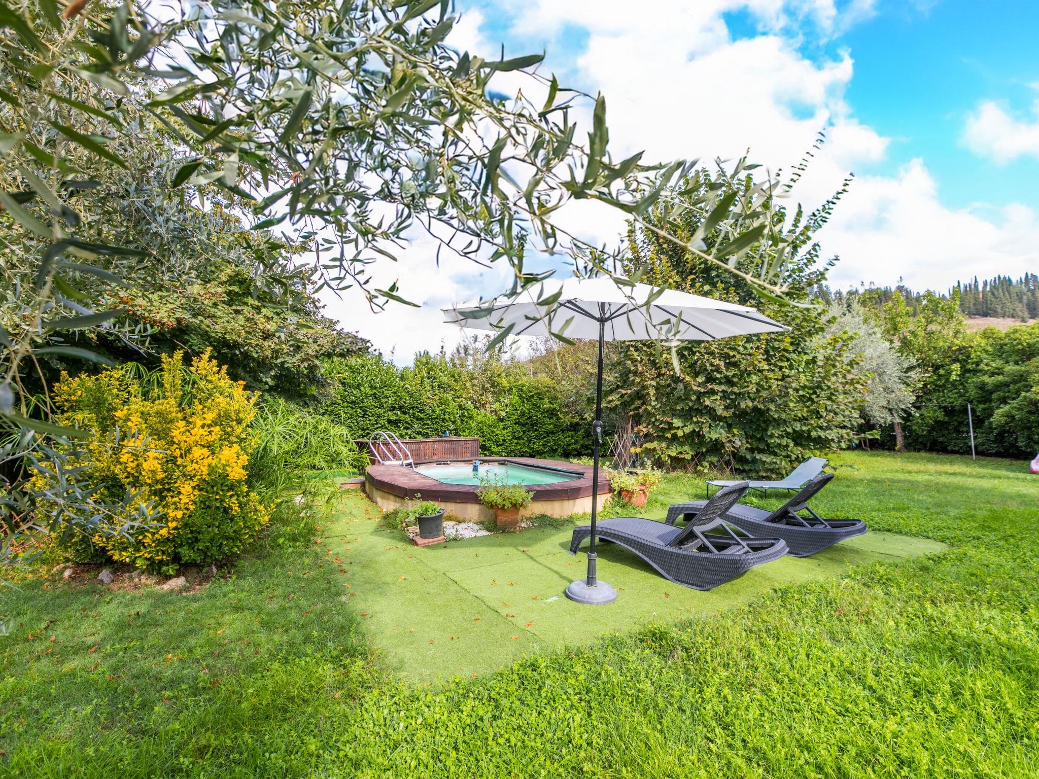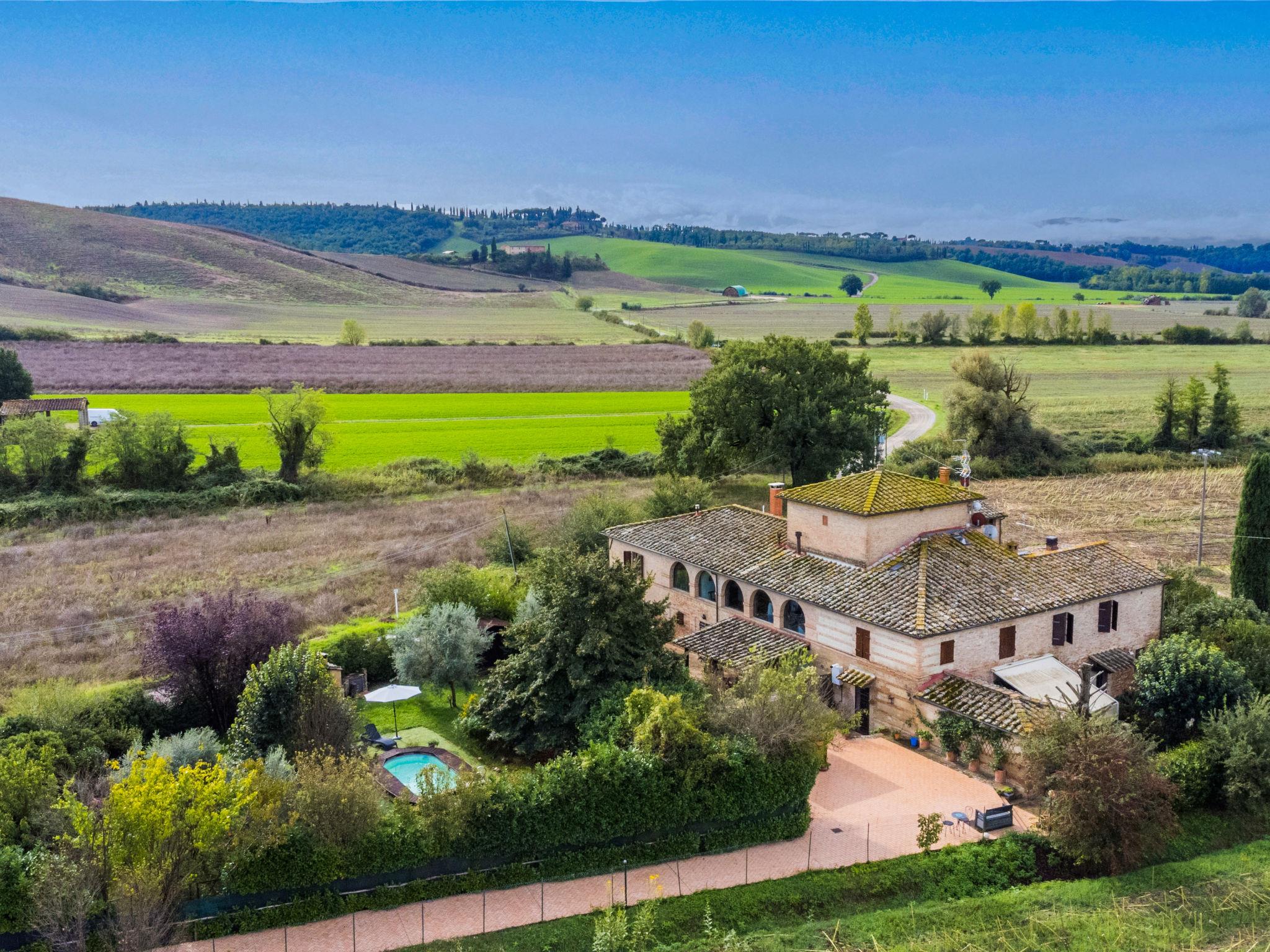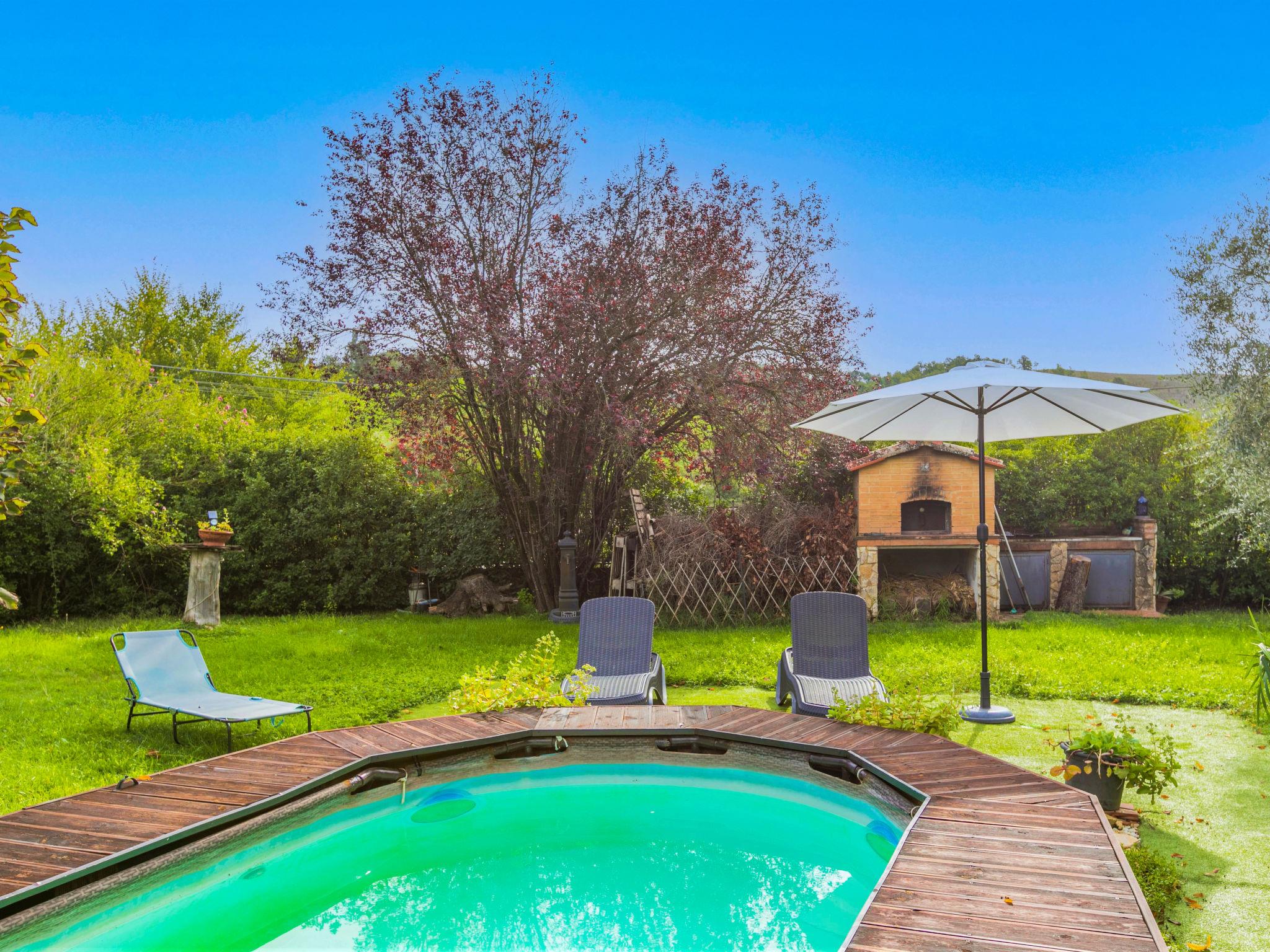 Buonconvento: Very comfortable cottage "Podere Palazzetto", 2 storeys, surrounded by trees and meadows. 8 km from the centre of Buonconvento, 13 km from the centre of Monteroni d'Arbia, in a sunny position, in the countryside. Private: property (fenced), garden wildlife garden and trees, swimming pool (3 x 6 m, seasonal availability: 01.May. - 15.Oct.). Outdoor shower, hot tub, patio, terrace, barbecue, pool maintenance by the owner/gardener. Linen change (suppl. charge extra). 3 km long bumpy motor access to the house. Parking at the house. Shop 4 km, grocery 4 km, supermarket 4 km, restaurant 5 km, sandy beach "Follonics" 94 km, thermal baths "Rapolano Terme" 23 km. Nearby attractions: Monte Uliveto Maggiore 17 km, Montalcino 18 km, San Quirico d'Orcia 25 km, Siena 28 km, Pienza 35 km, Montepulciano 46 km. Please note: car recommended. Baby equipment (included). Groups of teenagers on request only.