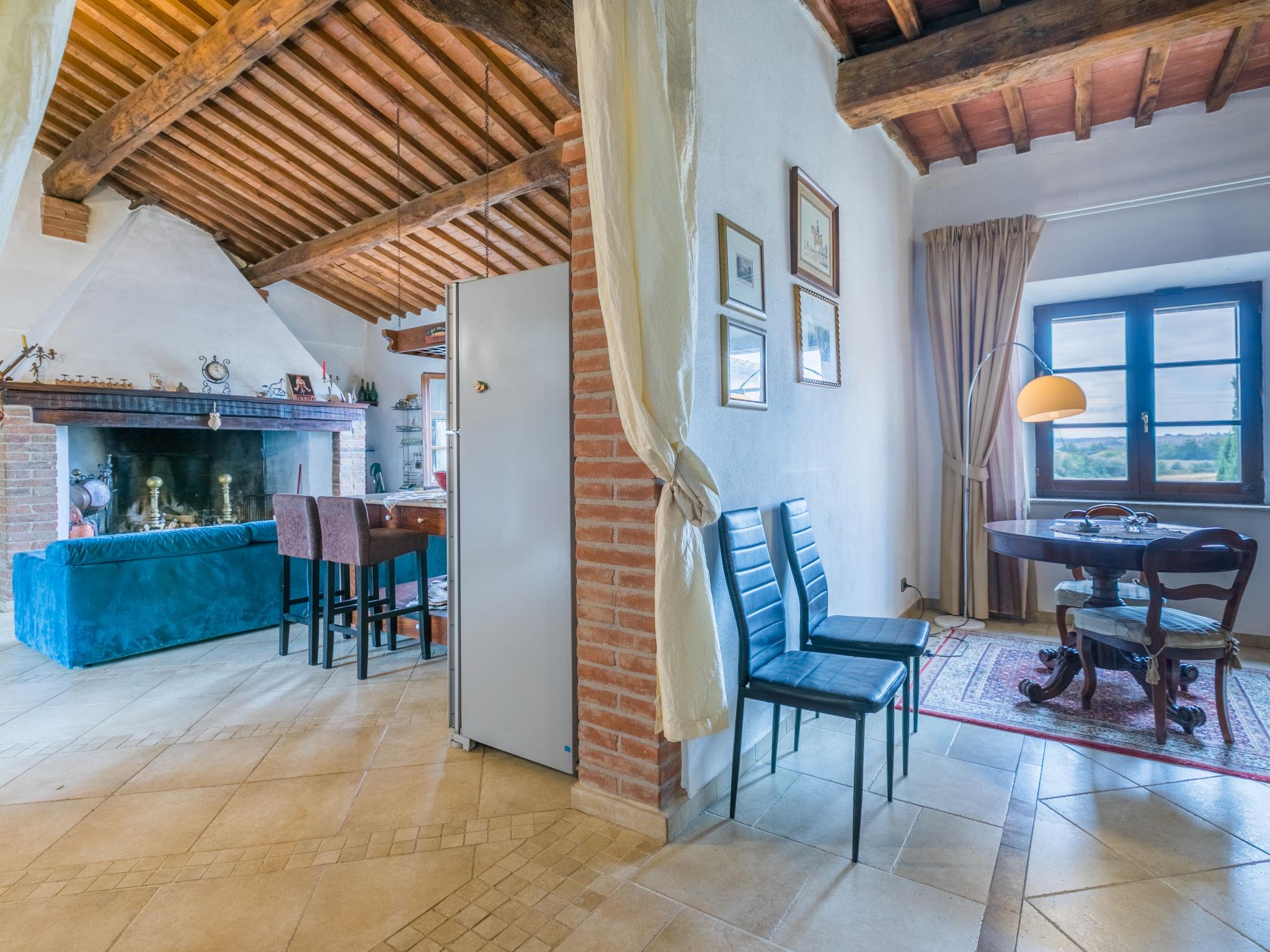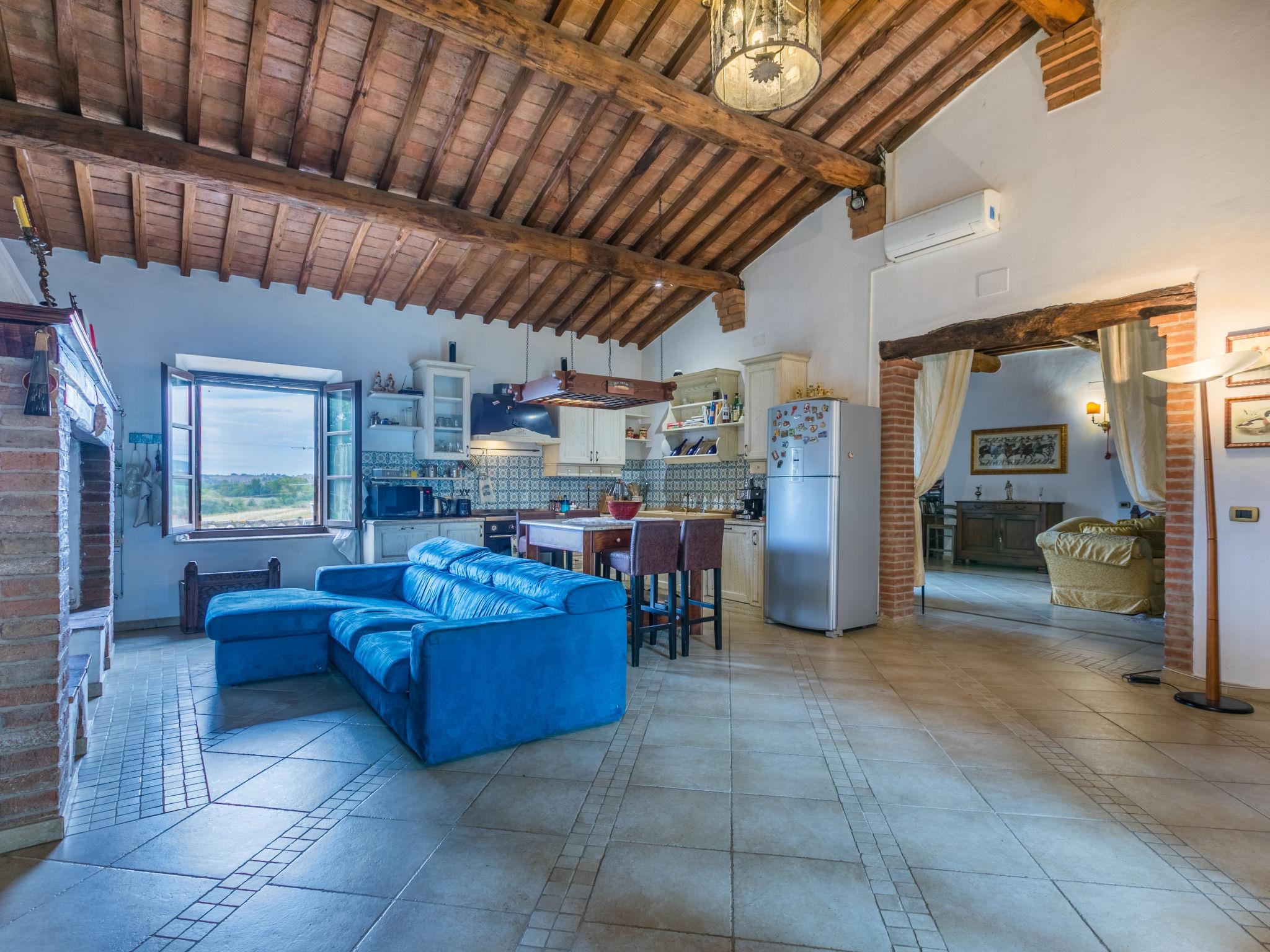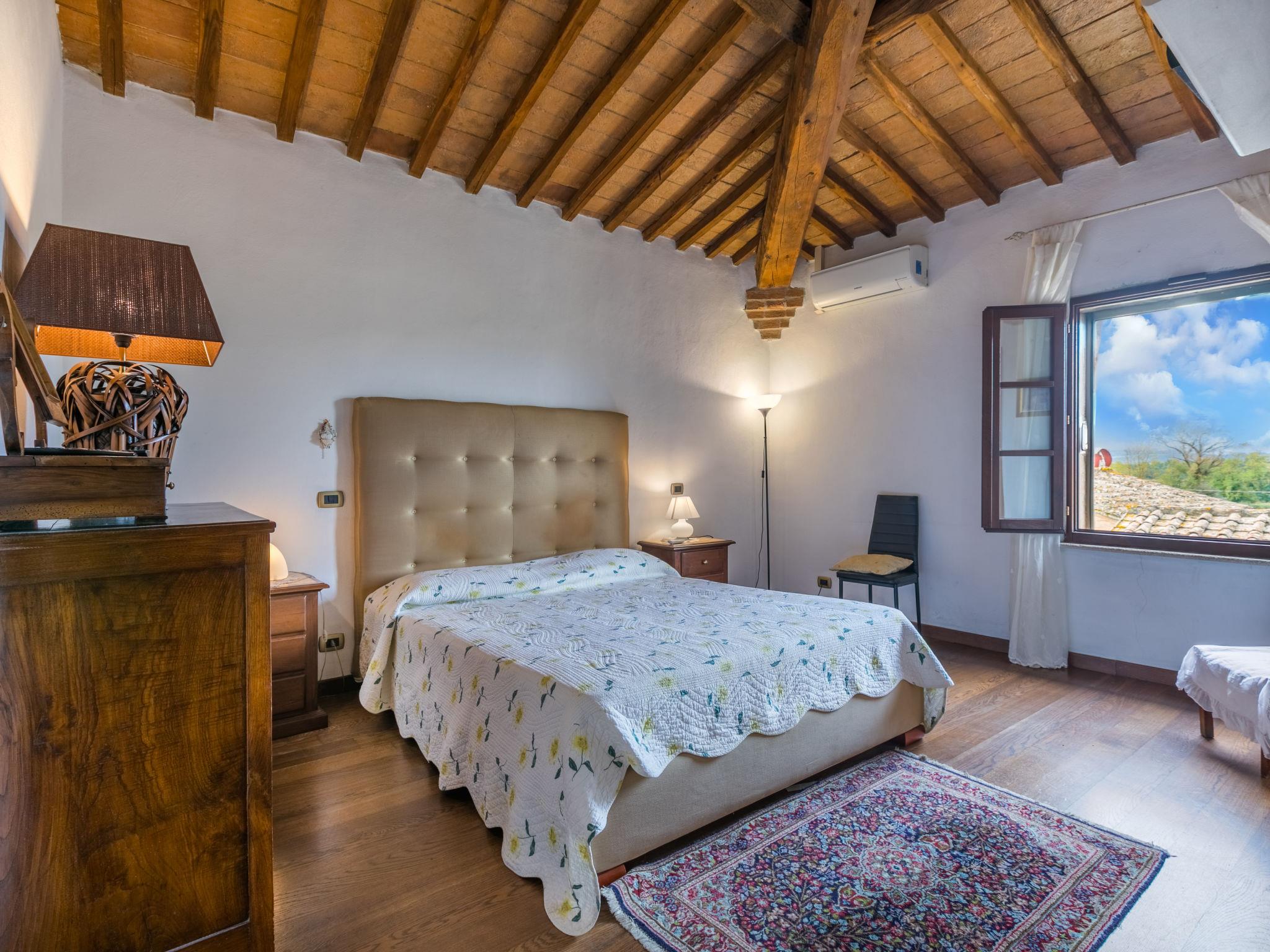 "Podere Palazzetto", 5-room semi-detached house 280 m2 on 2 levels. Spacious, renovated, comfortable and tasteful furnishings: upper floor: living room with panoramic window. Living room with 1 double sofabed, TV and flat screen. 2 double bedrooms with Dressing room. Large kitchen-/living room (oven, dishwasher, Gas stove, 5 gas rings, toaster, kettle, microwave, electric coffee machine) with dining table, open-hearth fireplace. Bath/bidet/WC, shower/bidet/WC. 2nd upper floor: 1 open large double bedroom with shower/bidet/WC. Gas heating, air-conditioning. Natural stone floors. Patio. Terrace furniture, barbecue, deck chairs, covered balcony, box-room. Beautiful panoramic view of the countryside. Facilities: washing machine, iron, mosquito net, children's high chair, baby cot for up to 2 year olds, hair dryer, logs (extra). Internet (WiFi, free). Parking at the house. Please note: non-smokers only. Maximum 1 pet/ dog allowed. The pool mentioned in the description is for private use. IT052003C2IWB3GK4S