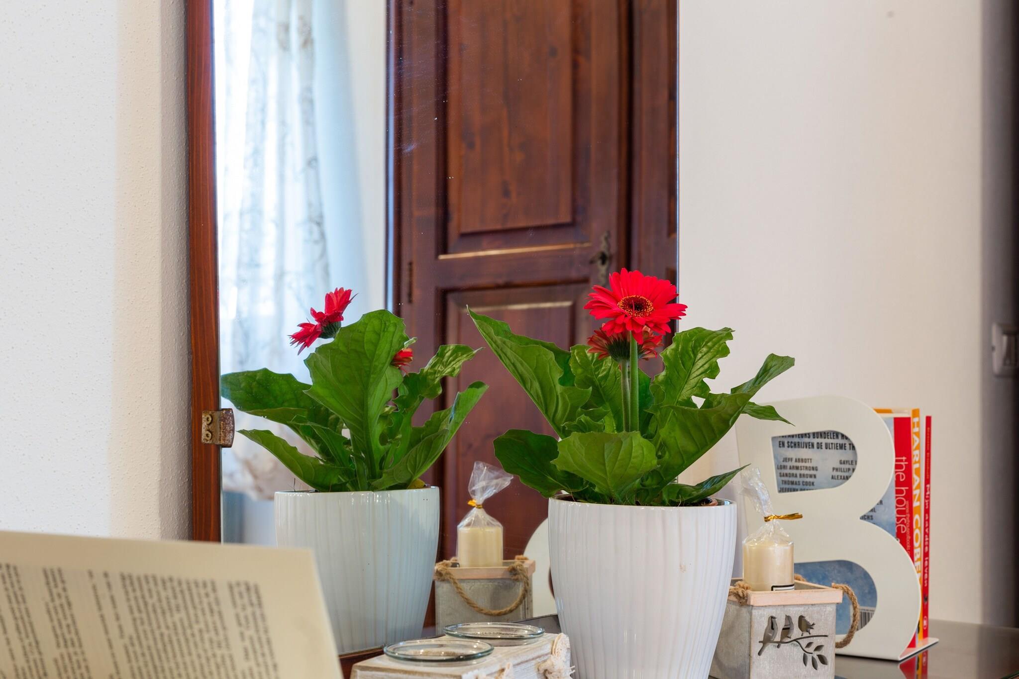 På 1. etage: (Stue(dobbeltsovesofa, Fjernsyn(parabol), spisebord), åbent køkken(kogeplade, kaffemaskine, ovn), soveværelse(enkeltseng, dobbeltseng), badeværelse(badekar med bruser, bruser, håndvask, bidet)) have(deles med andre gæster), havemøbler, grill, swimmingpool(deles med andre gæster, 12 x 6 m., opened from May upto and including Sep), bordtennisbord, barneseng