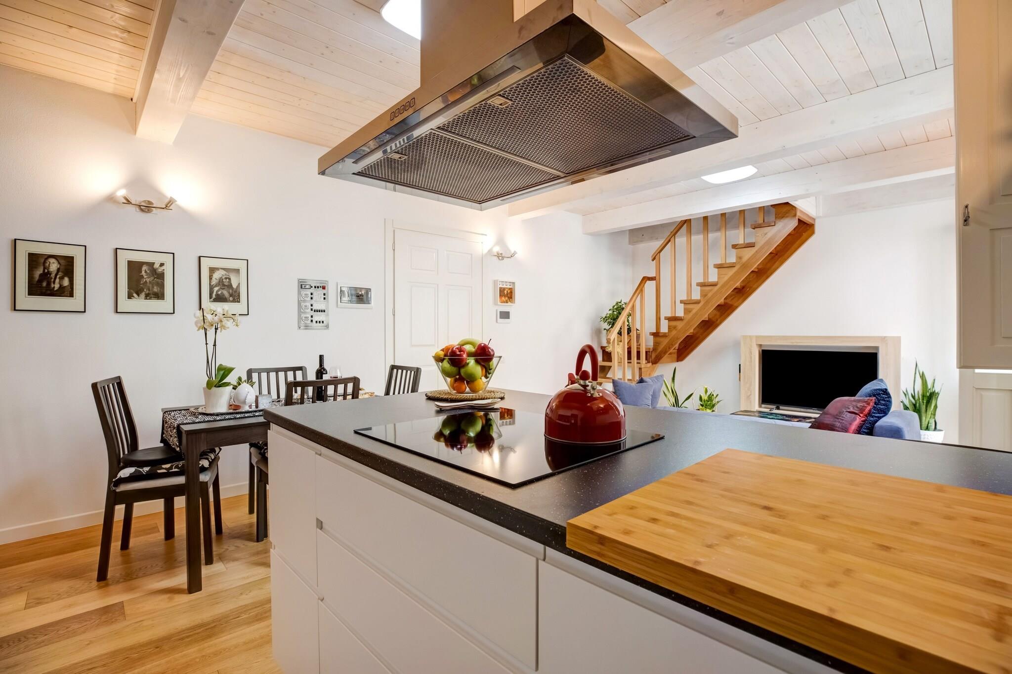 På 1. etage: (åbent køkken(kogeplade(induktion), elkedel, brødrister, emhætte, kaffemaskine, espressomaskine, ovn, mikrobølgeovn, opvaskemaskine , køle-fryseskab, klimaanlæg, Saftpresser, Blender, Stavblender), stue / spisestue(dobbeltsovesofa(140 x 200 cm), Fjernsyn, spisebord, klimaanlæg), soveværelse(king size-seng(160 x 200 cm), tørretumbler, klimaanlæg), badeværelse(bruser, håndvask, bidet, vaskemaskine), klimaanlæg) Parasol, barnestol, strygejern, føntørrer, hyggespil, crib(free)