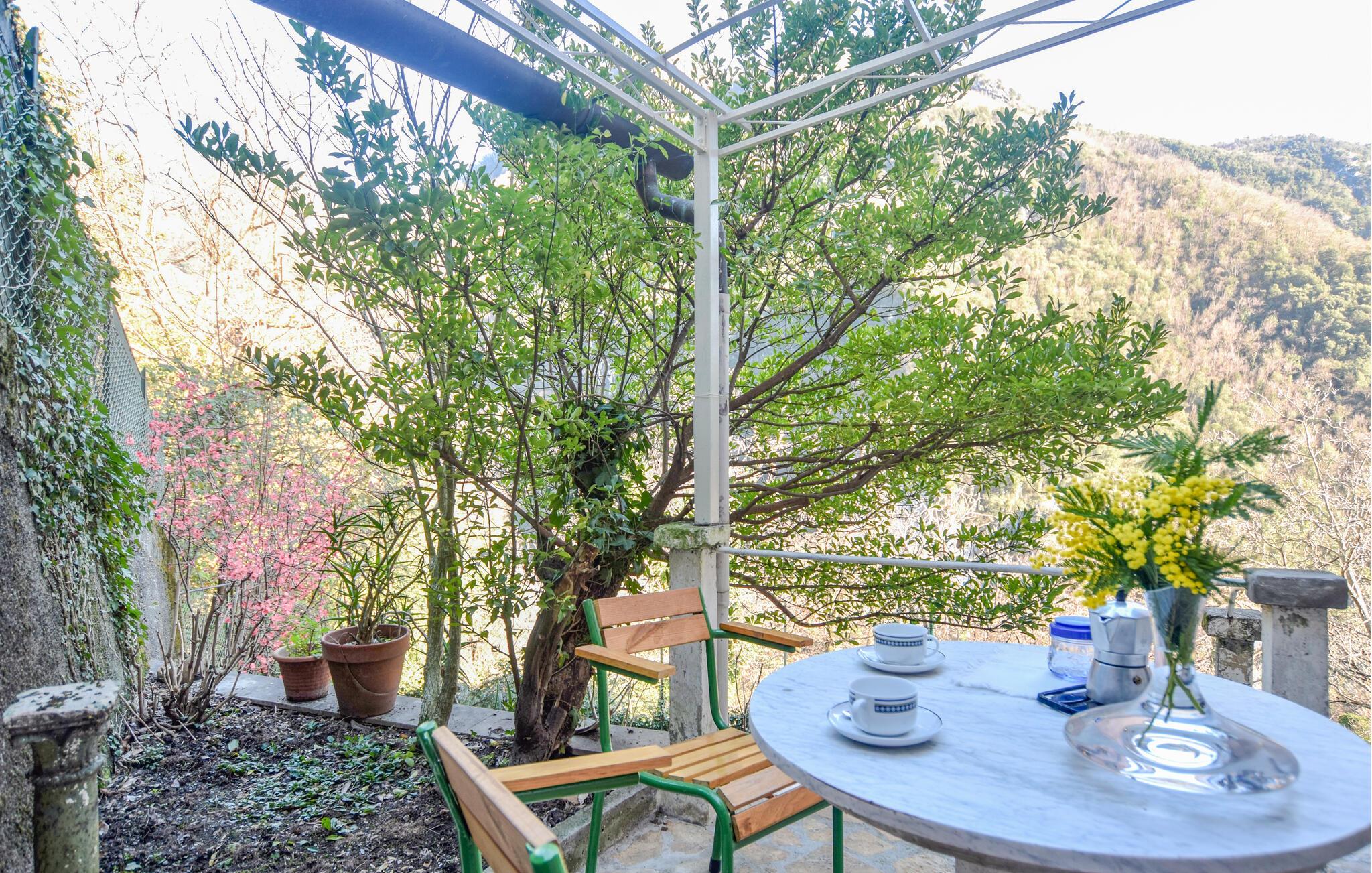 Udearealet byder på en idyllisk terrasse og et hyggeligt opholdsområde med udsigt til de imponerende bjerge. Begynd dagene med en udendørs morgenmad eller nyd en kop espresso, mens I nyder naturens fredelige atmosfære.