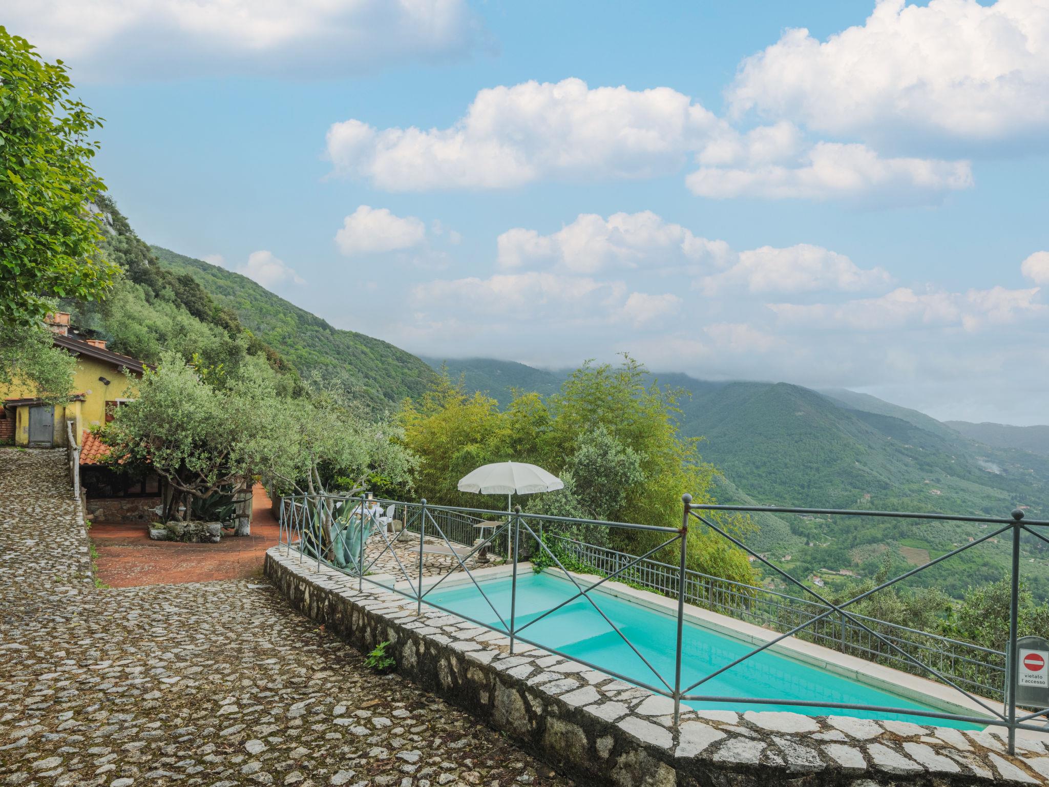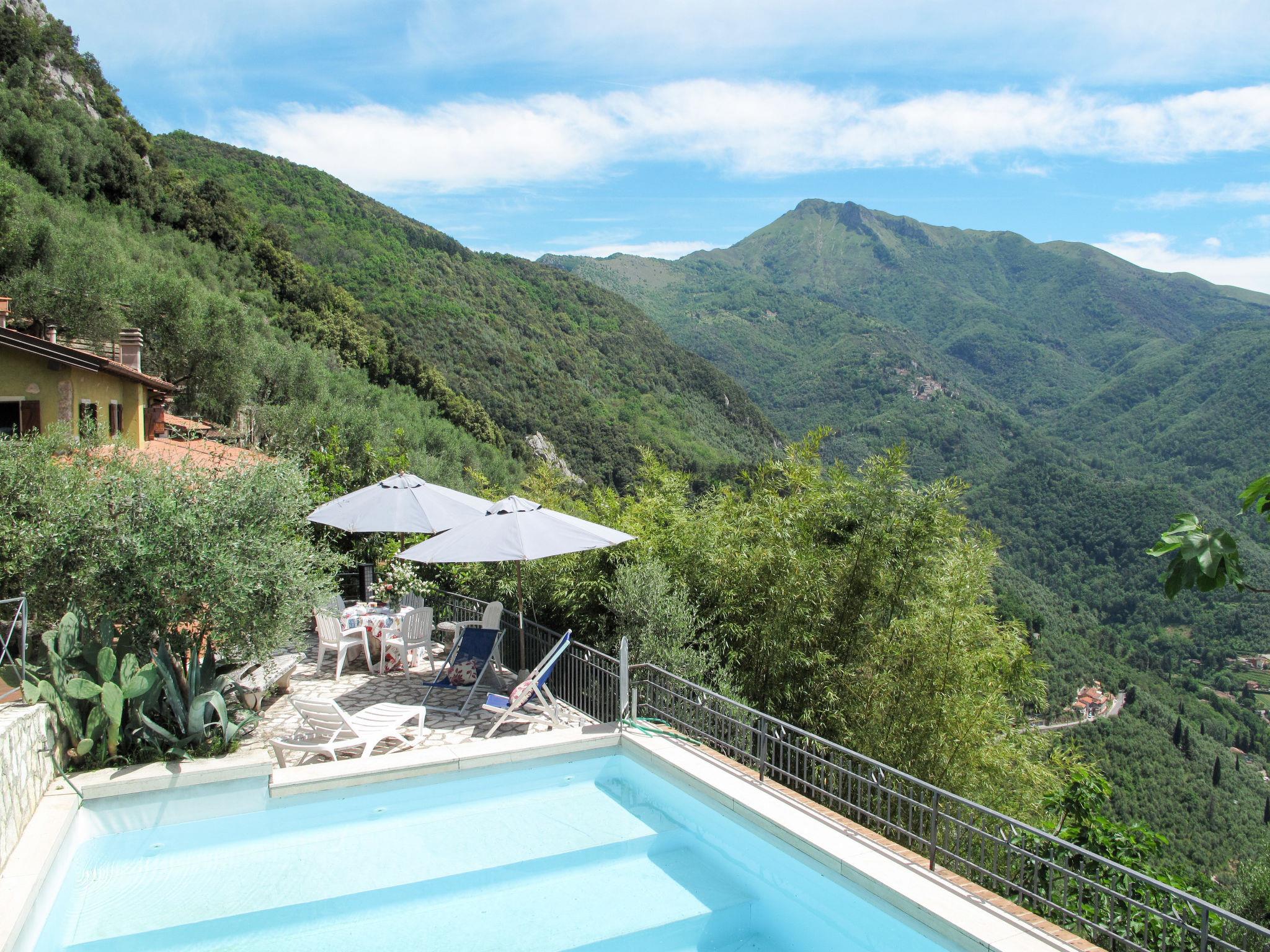 Greppolungo 6 km from Camaiore: Beautiful house "La Grotta", 380 m a.s.l., detached. Property composed of main house and outbuilding above Greppolungo 6 km from the centre of Camaiore, 300 m from the centre of Greppolungo, outside the resort, 41 km from the centre of Pisa, in an elevated position on a slope, 14 km from the sea, 14 km from the beach, in the countryside. Private: terraced garden, 1 ha (fenced) with trees, orchard, swimming pool (8 x 6 m, depth 50 - 175 cm, seasonal availability: 07.May. - 17.Sep.). Outdoor shower, pool house with cooking stove, pool maintenance by the owner/gardener. In the house: central heating system, heating to be paid on the spot (28.Mar. - 30.Oct.), heating available only from 31.Oct. - 27.Mar.. 300 m footpath to the house. Public parking 300 m. Grocery 4 km, restaurant 300 m, bus stop, railway station "Viareggio" 16 km, sandy beach "Lido di Camaiore" 14 km. Nearby attractions: Forte dei Marmi 21 km, Lucca 39 km, Collodi (Pinocchio Park) 57 km, Corchia Park 31 km, Riomaggiore (5 Terre) 81 km, Firenze 124 km. Well-known lakes can easily be reached: Torre del Lago 24 km, Lago di Massaciuccoli 30 km. Hiking paths: Grotta dell´Onda (Casoli) 9 km. Please note: car recommended.