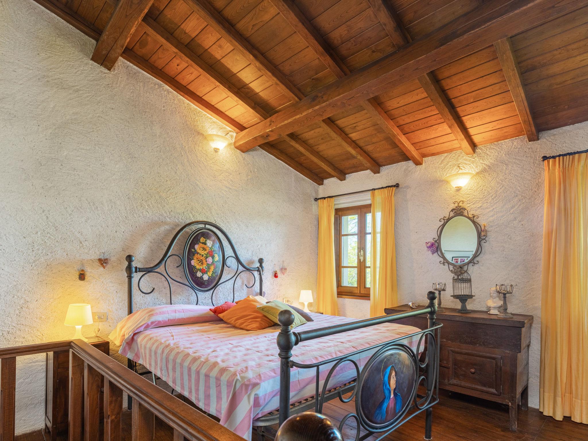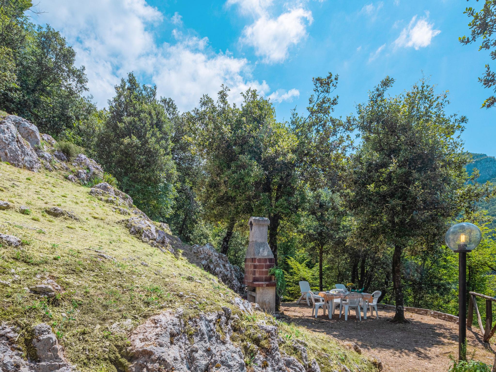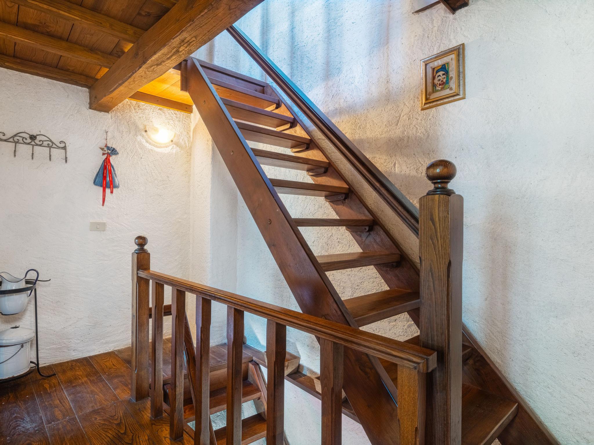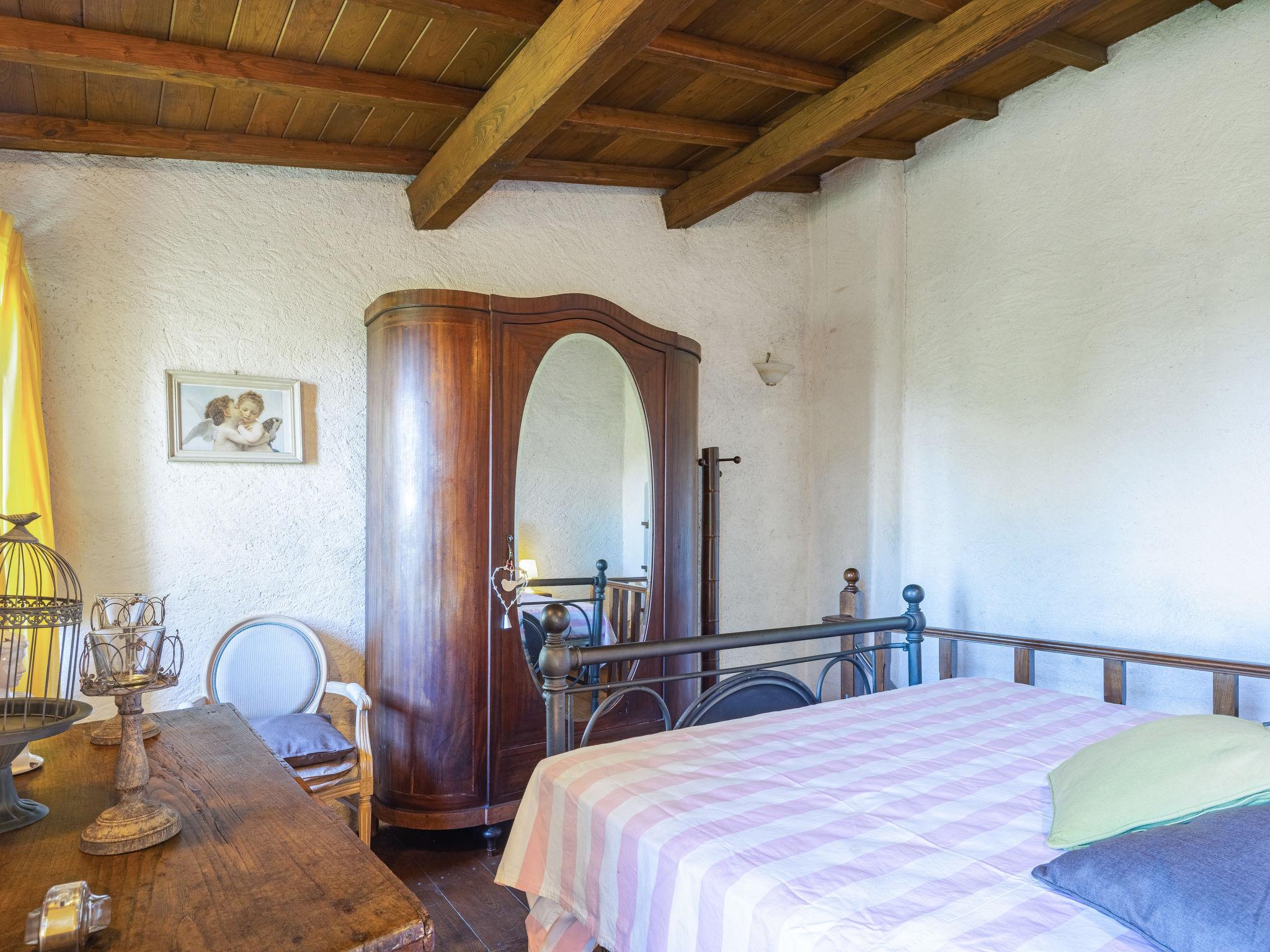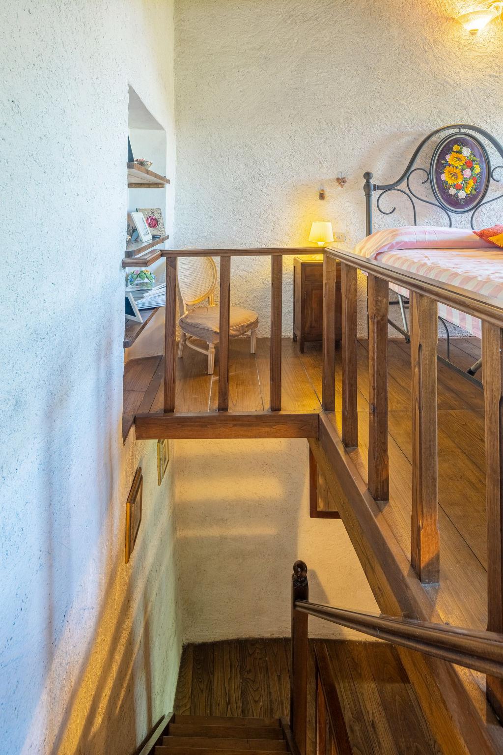 3-room house 50 m2 on 3 levels, on the upper ground floor. Practical and rustic furnishings: kitchen-/living room (4 gas rings, toaster, kettle, microwave, electric coffee machine) with open-hearth fireplace and dining table. Exit to the garden. Upper floor: (steep stair), 1 small room with 1 french bed (130 cm). Shower/bidet/WC. Top floor: 1 open room with sloping ceilings with 1 french bed (160 cm). No heating option. Wooden floors. Terrace furniture, barbecue, deck chairs (2). View of the mountains and the forest. Facilities: mosquito net, hair dryer. Parking at the house. Please note: non-smokers only. Smoke alarm, fire extinguisher. Only the outer walls are remaining of one of the separate semi detached houses. IT046030C2JNPPE5ZE