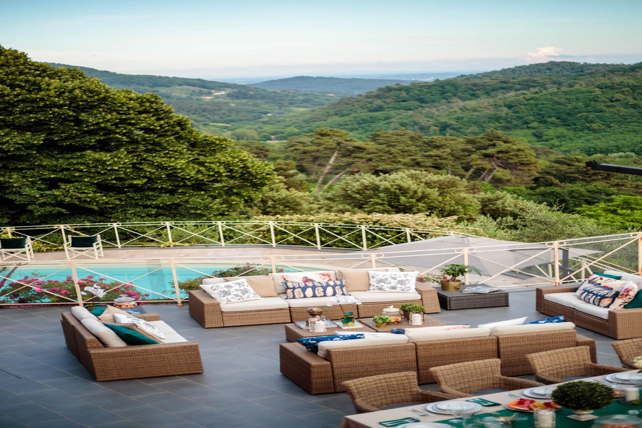 Stueetage: (Indgang , Stue(Fjernsyn, pejs, sofahjørne), Stue(Fjernsyn, sofahjørne), spisestue(spisebord), Køkken(elkedel, brødrister, kaffemaskine, ovn, mikrobølgeovn, opvaskemaskine , køleskab, fryser, Saftpresser, ), badeværelse(bruser, toilet)) På 1. etage: (Soveværelse med badeværelse(dobbeltseng, bruser), Soveværelse med badeværelse(dobbeltseng, bruser), Soveværelse med badeværelse(dobbeltseng, bruser), Soveværelse med badeværelse(dobbeltseng, bruser)) På 2. etage: (soveværelse(enkeltseng, enkeltseng), soveværelse(enkeltseng, enkeltseng), Soveværelse med badeværelse(dobbeltseng, bruser), Soveværelse med badeværelse(dobbeltseng, bruser)) Havemøbler, Fjernsyn, Fjernsyn, Fjernsyn, DVD-afspiller, tørretumbler, tremmeseng, vaskemaskine, klimaanlæg, terrasse, have, grill, parkering, swimmingpool(privat), barnestol, strygejern, føntørrer