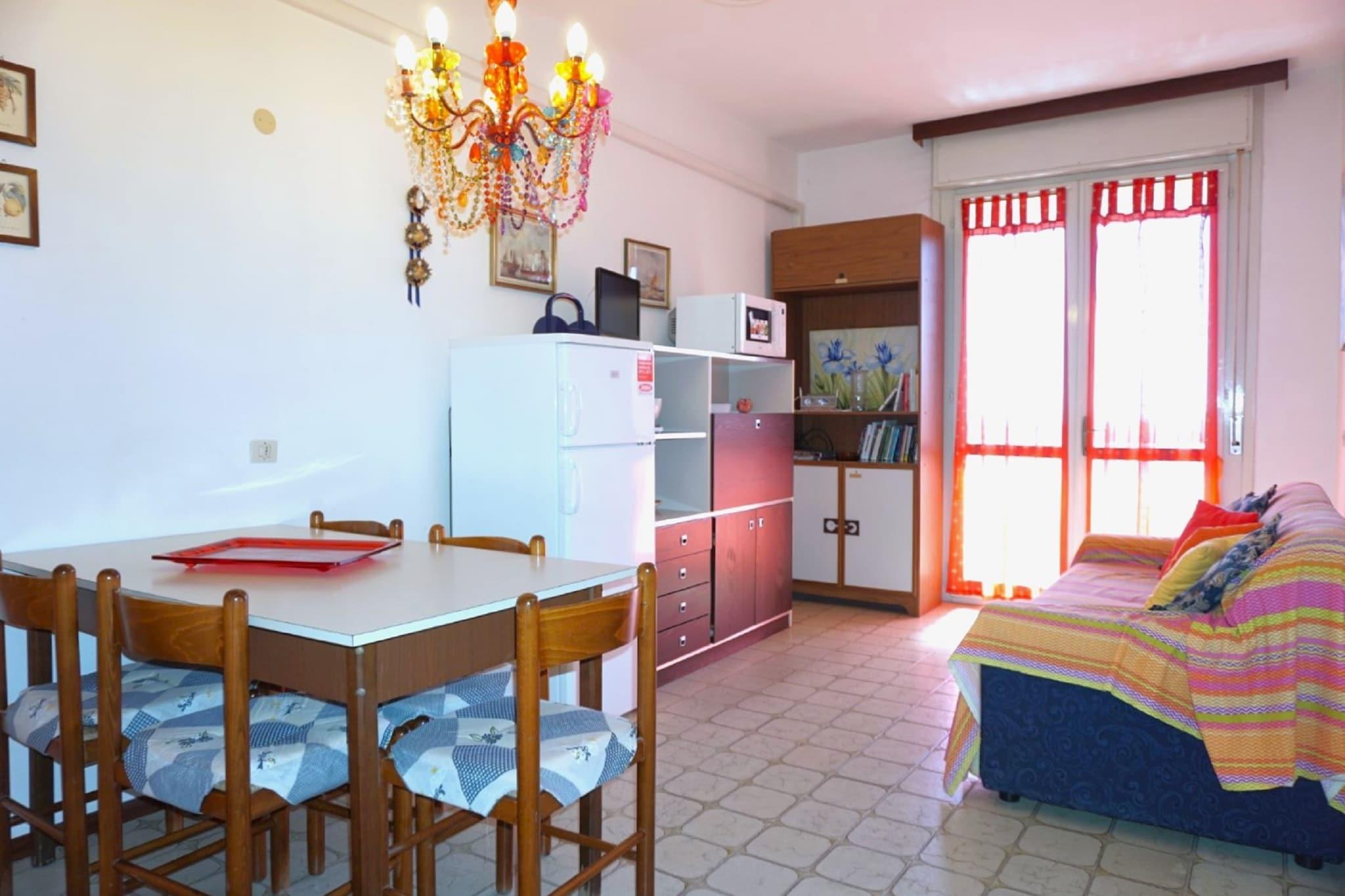 Komfort ved stranden med privat terrasse Denne kæledyrsvenlige lejlighed til 5 gæster ligger kun 500 meter fra Caorles sandstrande og tilbyder et lyst og indbydende ophold på 5. sal. Den komfortable stue har en dobbelt sovesofa, tv, spisebord og siddeområde, perfekt til afslapning efter en dag ved havet. Det åbne køkken er fuldt udstyret med kogeplader, emhætte, mikrobølgeovn, køleskab med fryser og håndvask, ideelt til at tilberede måltider derhjemme. Praktisk planløsning med moderne bekvemmeligheder Lejligheden har et soveværelse møbleret med en dobbeltseng og en enkeltseng, hvilket giver fleksible sovemuligheder for familier eller grupper. Badeværelset er udstyret med bruser, håndvask, toilet og bidet. For din komfort har enheden aircondition og adgang til en privat terrasse, hvor du kan nyde din morgenkaffe eller slappe af i aftenbrisen. Gratis WiFi og parkering på stedet er også inkluderet for ekstra bekvemmelighed. Førsteklasses beliggenhed i Caorle med kæledyrsvenlige fordele Lejligheden ligger i et fredeligt område, men alligevel tæt på alt, kun 150 meter fra dagligvarebutikker og 200 meter fra lokale restauranter, hvilket giver nem adgang til dagligvarer og spisesteder. Med sin fantastiske beliggenhed, essentielle bekvemmeligheder og velkomstpolitik for kæledyr er denne lejlighed en perfekt base for en afslappende ferie på Veneto-kysten.