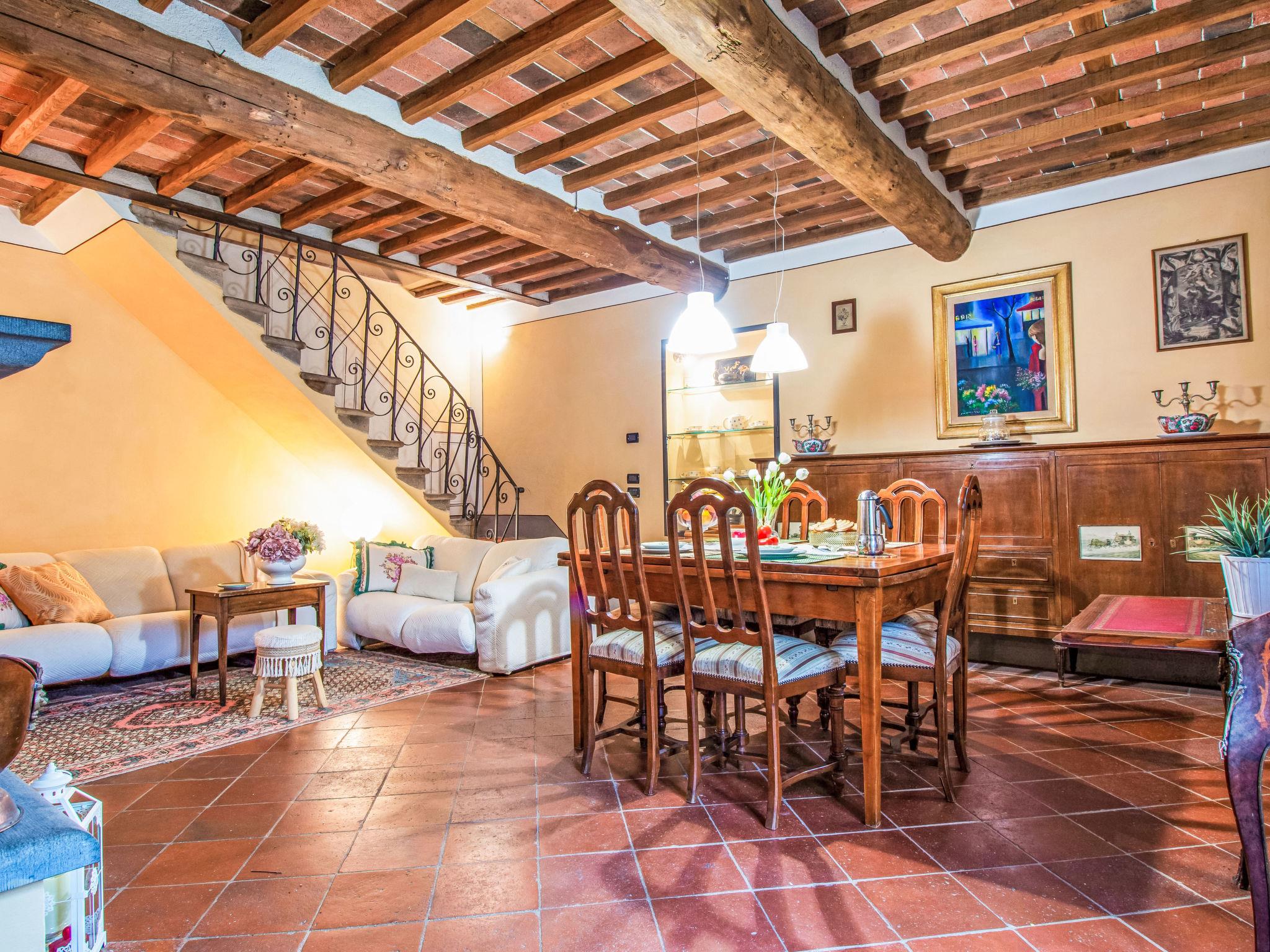 Cosy, comfortable country house "Micla", 3 storeys, built in 1600, renovated in 2004, surrounded by trees and meadows. In the district of San Giusto di Compito, in a quiet, sunny position, in the countryside. Private: property 2'000 m2 (fenced), trees, natural garden 900 m2 (fenced), swimming pool fenced (6 x 4 m, depth 120 - 120 cm, seasonal availability: 15.May. - 15.Oct.). Heating available only from 15.Nov. - 15.Apr.. Parking on the premises. Shop 2 km, grocery 2 km, supermarket 2 km, shopping centre 1 km, bar 2 km, bus stop 2 km, railway station 7 km. Nearby attractions: Lucca 7 km, Pisa 21 km, Montecarlo 17 km, Firenze 80 km. Please note: baby equipment on request (included).