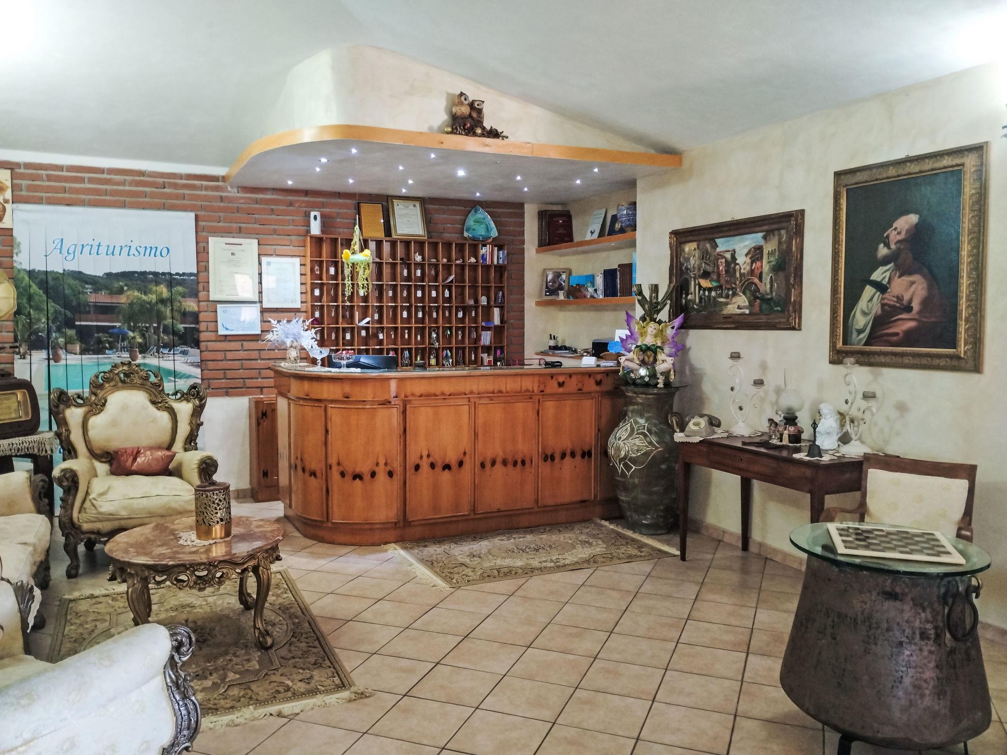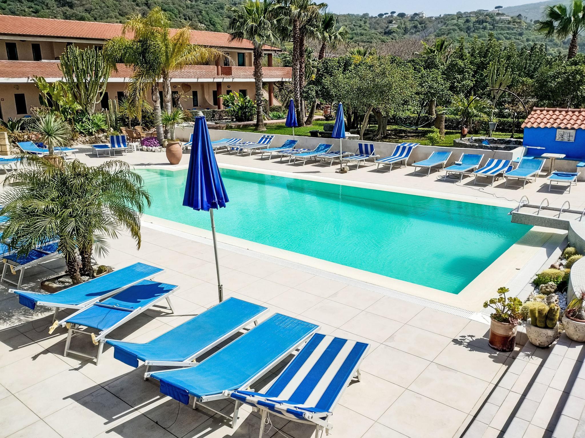 Santa Maria di Ricadi 8 km from Tropea: Small, child friendly, cosy holiday village "Heaven", surrounded by trees. In the district Santa Maria di Ricadi, in a sunny position, 550 m from the sea, 550 m from the beach. For shared use: well-kept garden plants and flowers, lawn for sunbathing, swimming pool (12 x 6 m, depth 90 - 150 cm, seasonal availability: 16.Apr. - 29.Oct. pool opening hours: 08:00-14:00 and 16:00-20:00). Outdoor shower, volleyball court, patio, garden furniture, barbecue, children's playground (slide, swing). In the complex: reception, restaurant, bar, WiFi, table football, sun terrace, washing machine (for shared use, extra). Linen change (suppl. charge extra). Towel change (suppl. charge extra). Breakfast and half board possible (extra). Airport transfer (extra). Parking on the premises. Shop, grocery, supermarket, restaurant, bar 500 m, 10 minute walk to the centre, bus stop 1 km, railway station "Ricadi" 5 km, sandy beach "Santa Maria di Ricadi" 550 m. Nearby attractions: Baia di Grotticelle 1 km, Tropea 8 km, Faro Capo Vaticano 3 km, Vibo Valentia 30 km, Reggio Calabria 90 km. Please note: suitable for families, baby equipment on request. Local sale of farm products. The photograph shows a typical example. Additional accommodations can be booked. The holiday properties may differ in situation, size and location. Included in the price: swimming pool, shuttle to/from the sea, parking, transfer to Ricadi station arrival/departure. The apartments are located on the ground or first floor and have a veranda or patio.