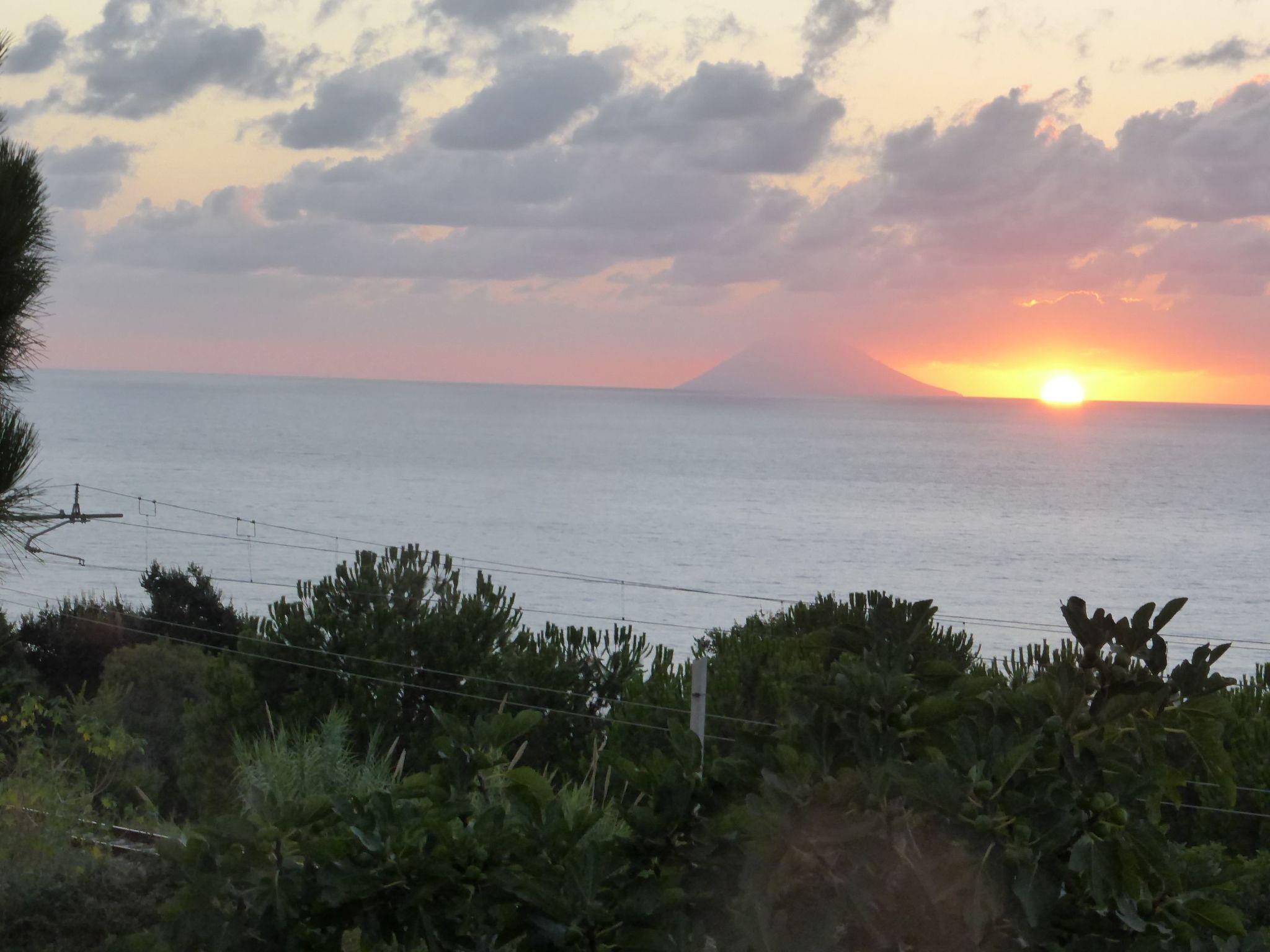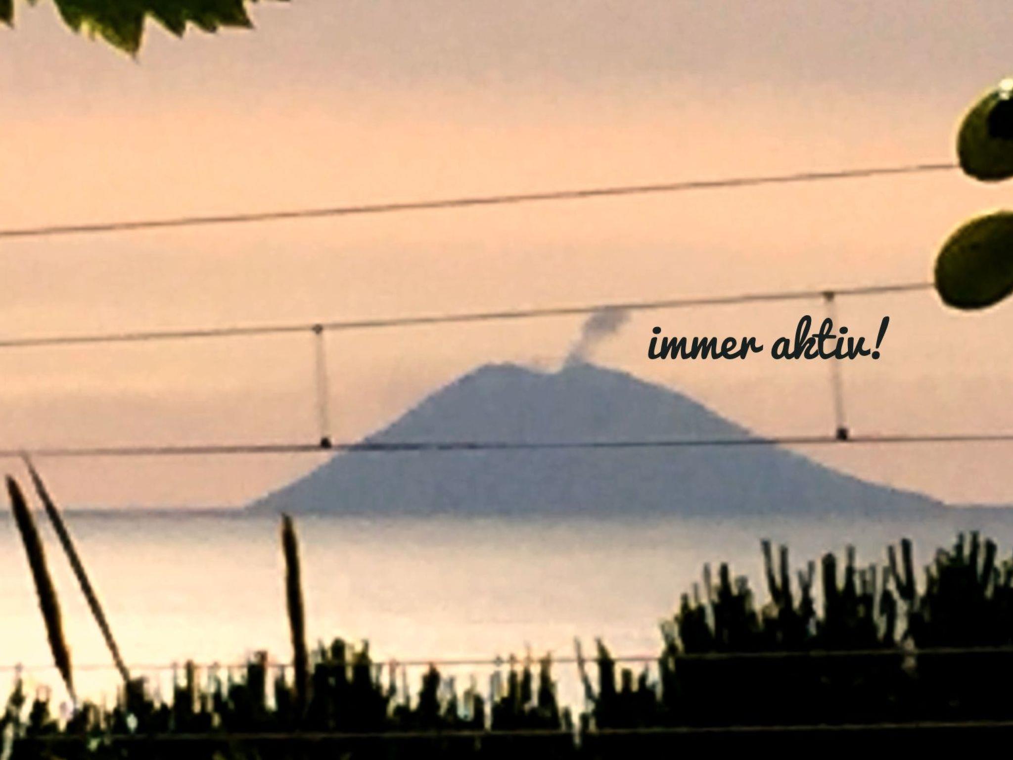 The ground floor has a living room with a kitchen, a kind of conservatory (with a TV), two bedrooms, a storage corner and stairs. The first floor comprises two bedrooms, a bathroom and the enormous terrace, of course with a view of the sea and Stromboli.