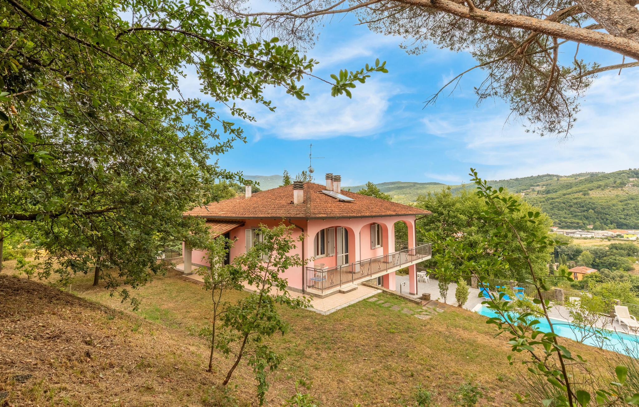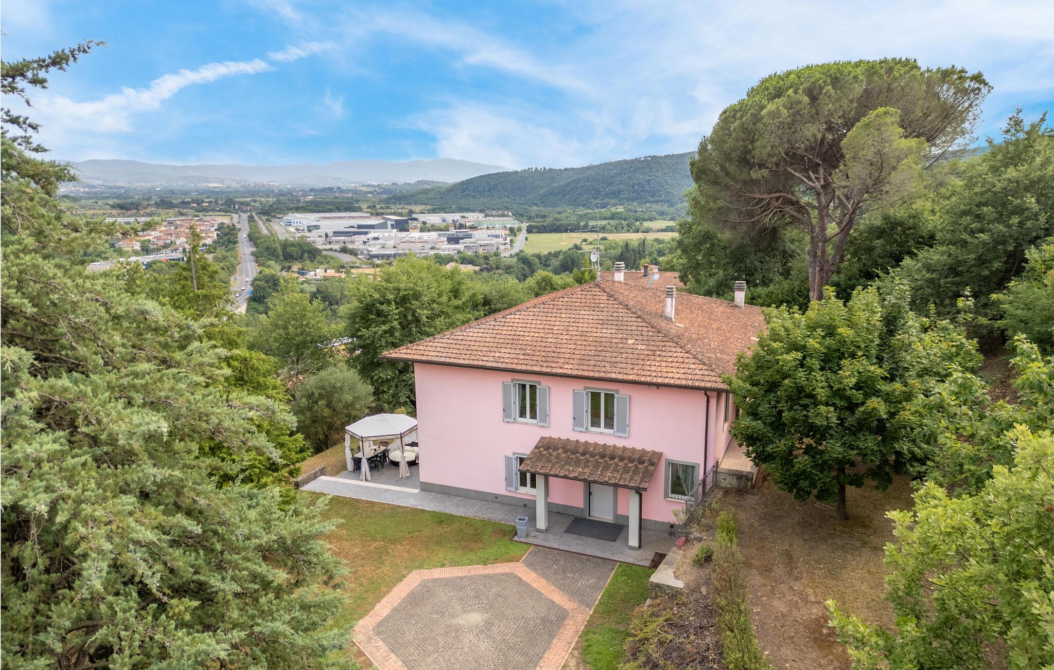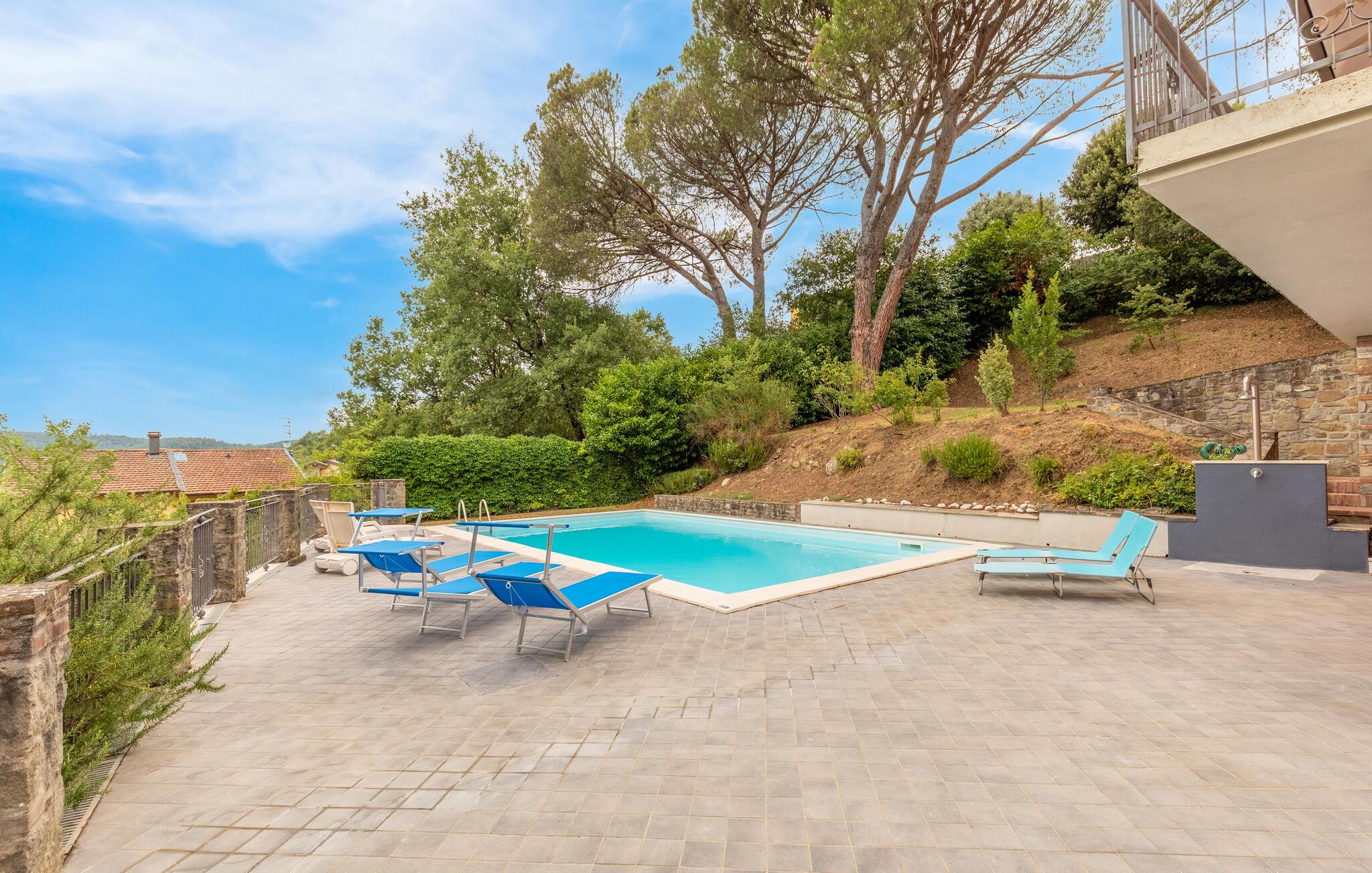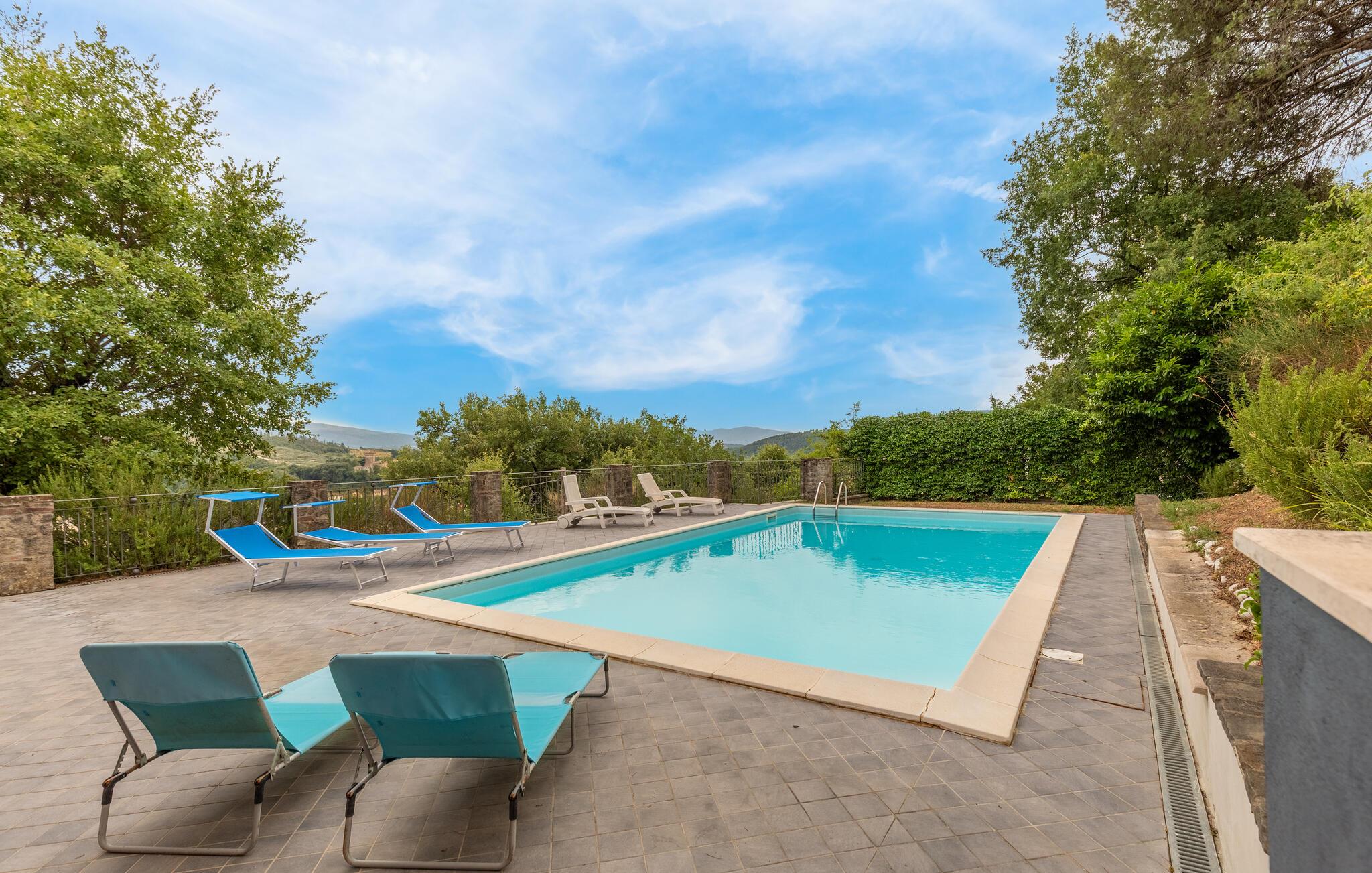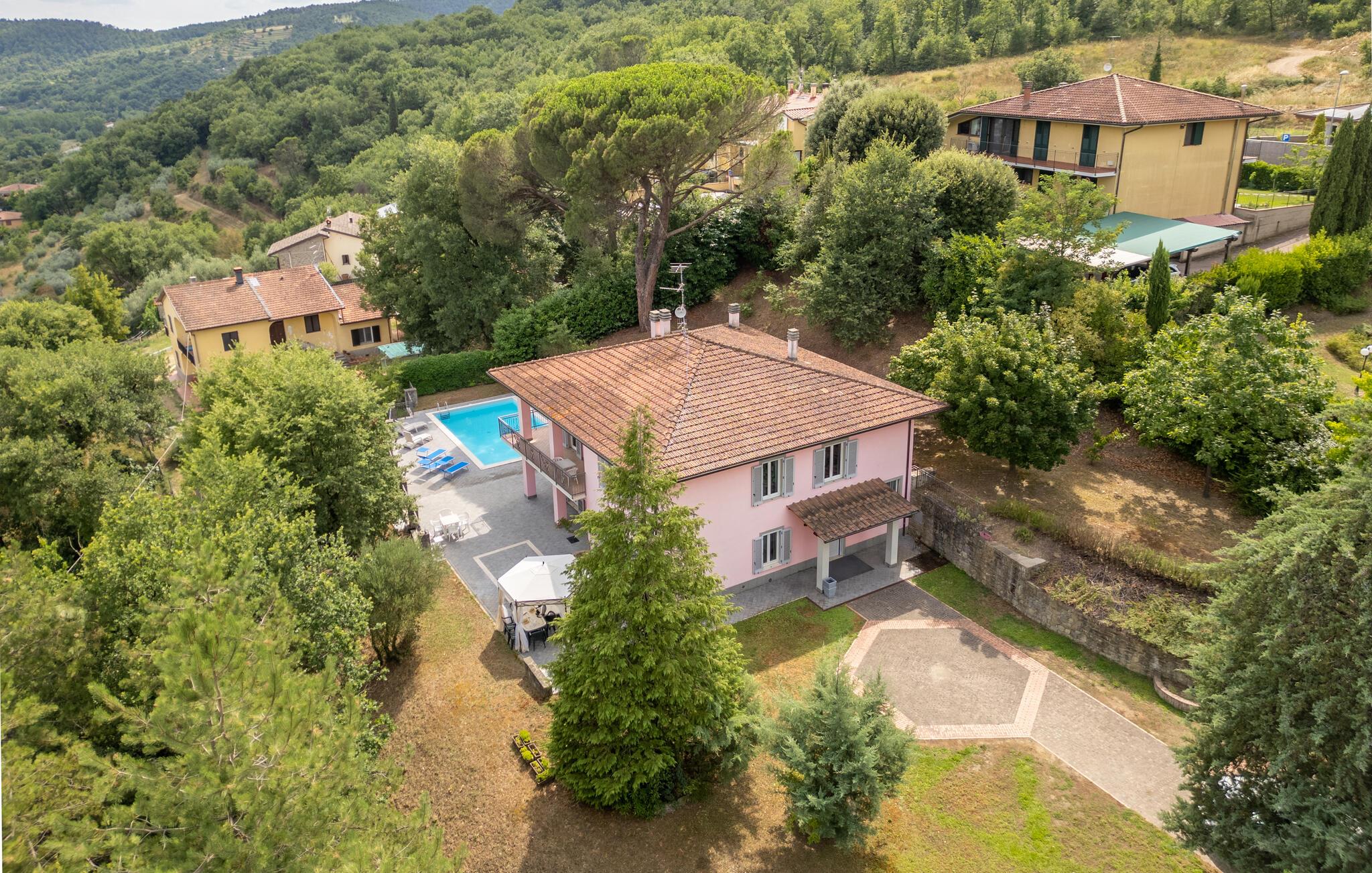 Nyd jeres ferie i et feriehus med pool og en fantastisk udsigt. Velkommen til dette indbydende hus ved porten til Toscana, hvor I vil føle jer hjemme fra første dag. Glæd jer til individuelt indrettede og lyse værelser med spændende farveaccenter, nyd udsigten over det omkringliggende landskab, spis sammen ved det lange spisebord, og hyg jer sammen på sofaen om aftenen efter en begivenhedsrig dag. Slap af på grunden, nyd de første solstråler på altanen, solbad og svøm i poolen til jeres hjertens lyst. Om aftenen kan I nyde kolde drikke udendørs og slappe af foran en storslået kulisse. Bliv inspireret af naturens ro eller udforsk regionen aktivt ved at vandre eller cykle på velafmærkede stier gennem de toscanske bakker. Besøg middelalderbyen Arezzo, beundre de storslåede fresker i San Francesco-kirken, slentre gennem det berømte antikvitetsmarked, eller nyd en espresso på Piazza Grande.