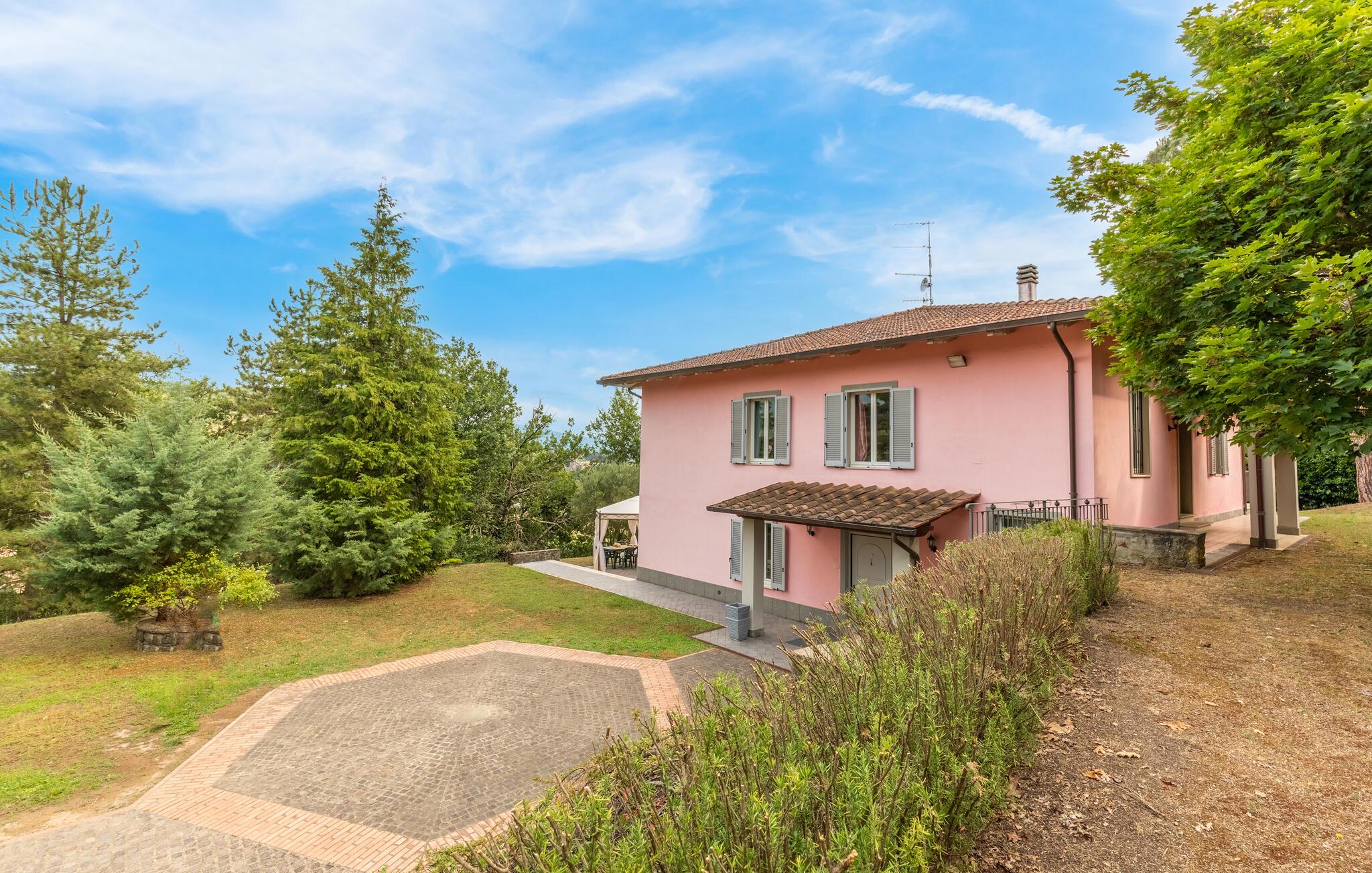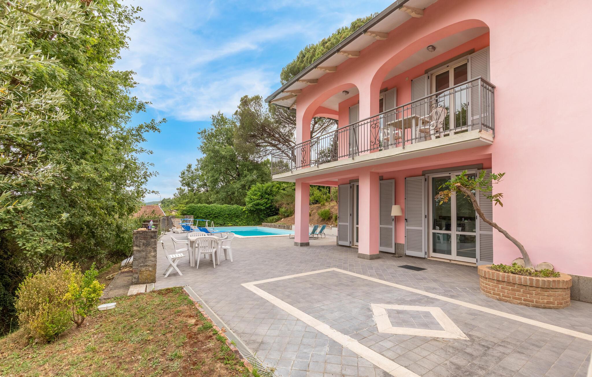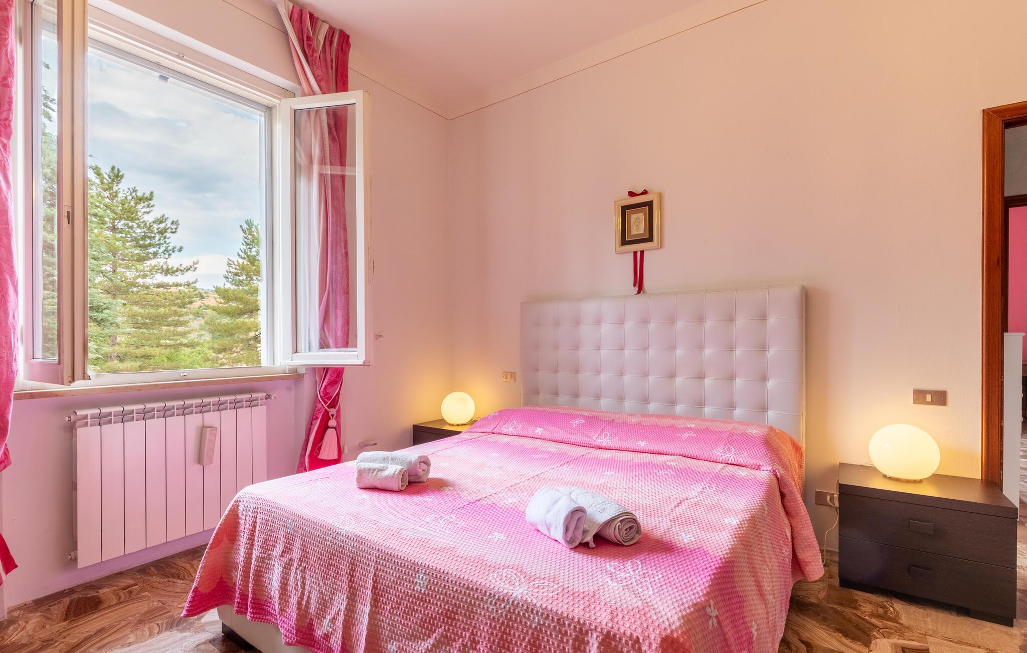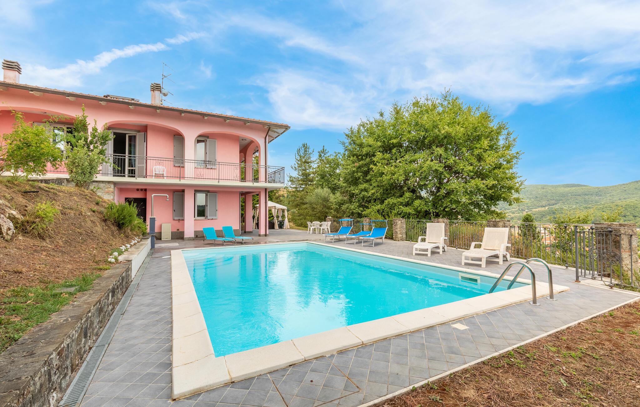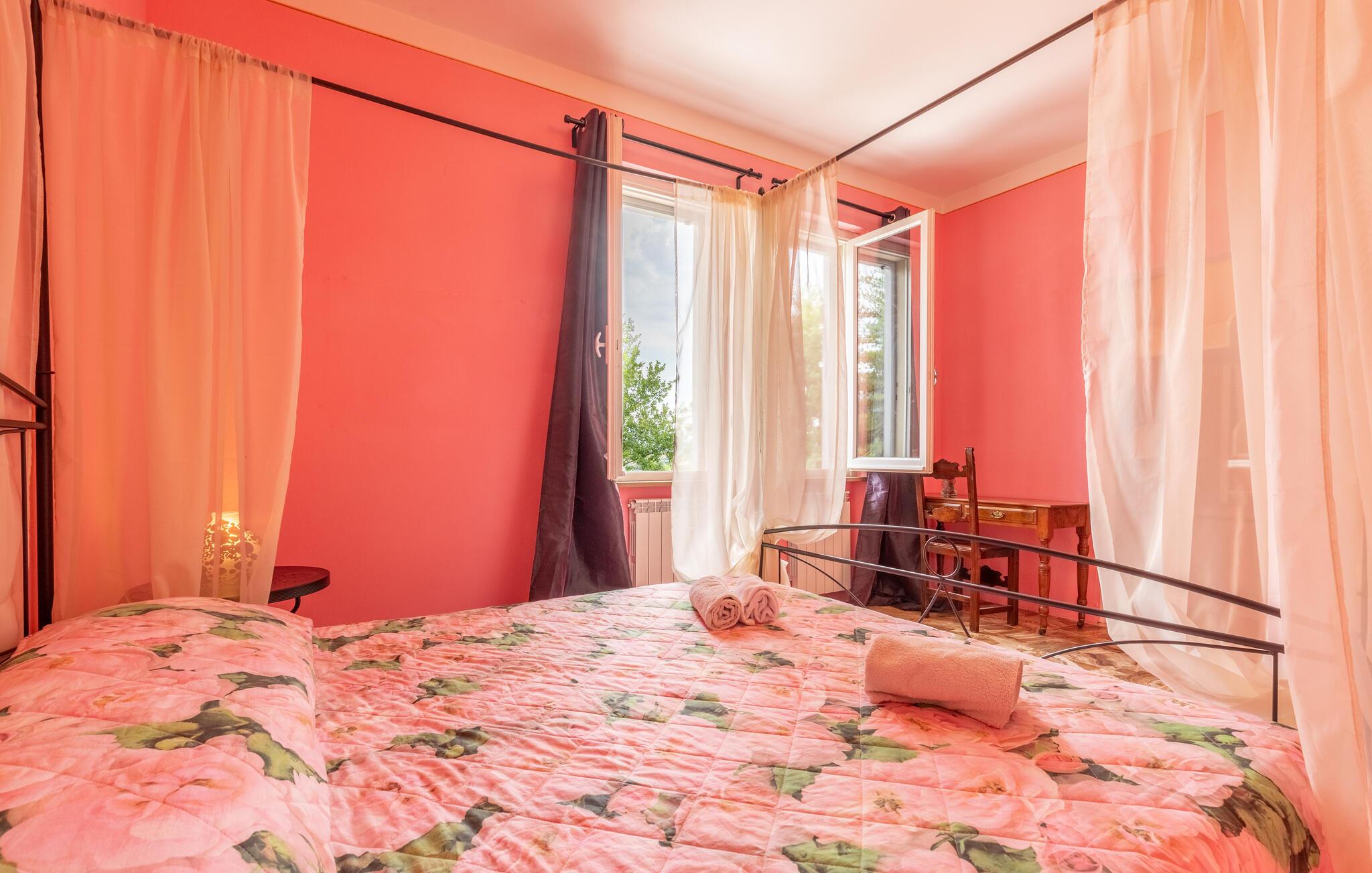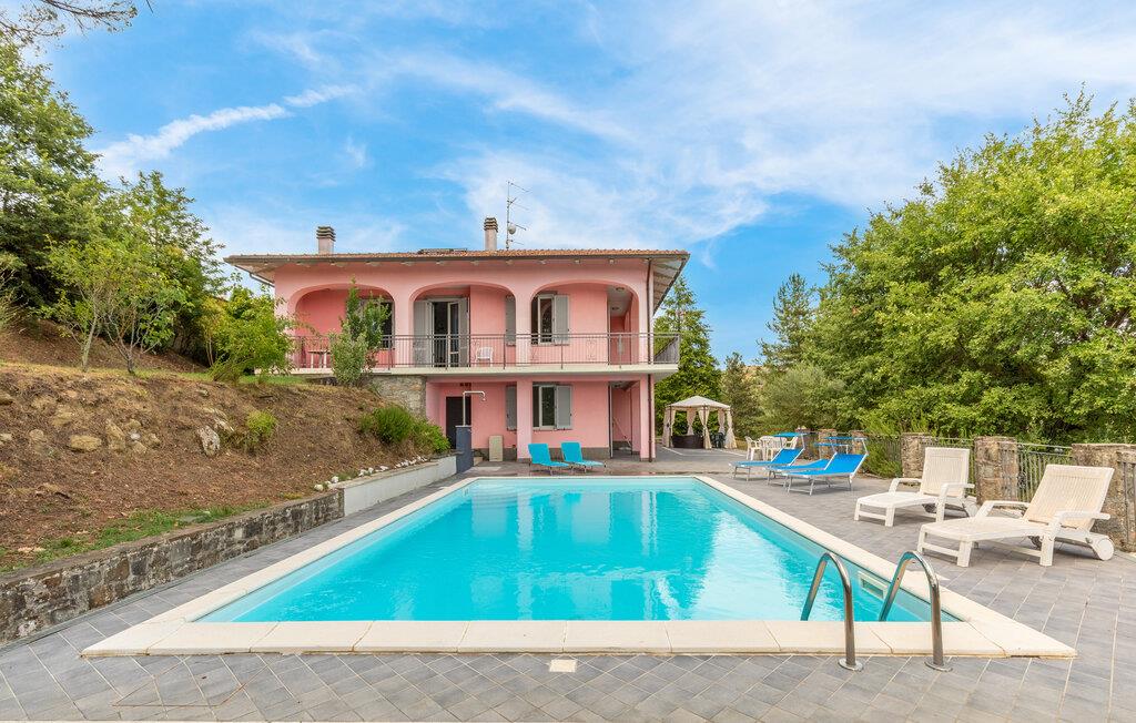 Nyd jeres ferie i et feriehus med pool og en fantastisk udsigt. Velkommen til dette indbydende hus ved porten til Toscana, hvor I vil føle jer hjemme fra første dag. Glæd jer til individuelt indrettede og lyse værelser med spændende farveaccenter, nyd udsigten over det omkringliggende landskab, spis sammen ved det lange spisebord, og hyg jer sammen på sofaen om aftenen efter en begivenhedsrig dag. Slap af på grunden, nyd de første solstråler på altanen, solbad og svøm i poolen til jeres hjertens lyst. Om aftenen kan I nyde kolde drikke udendørs og slappe af foran en storslået kulisse. Bliv inspireret af naturens ro eller udforsk regionen aktivt ved at vandre eller cykle på velafmærkede stier gennem de toscanske bakker. Besøg middelalderbyen Arezzo, beundre de storslåede fresker i San Francesco-kirken, slentre gennem det berømte antikvitetsmarked, eller nyd en espresso på Piazza Grande.