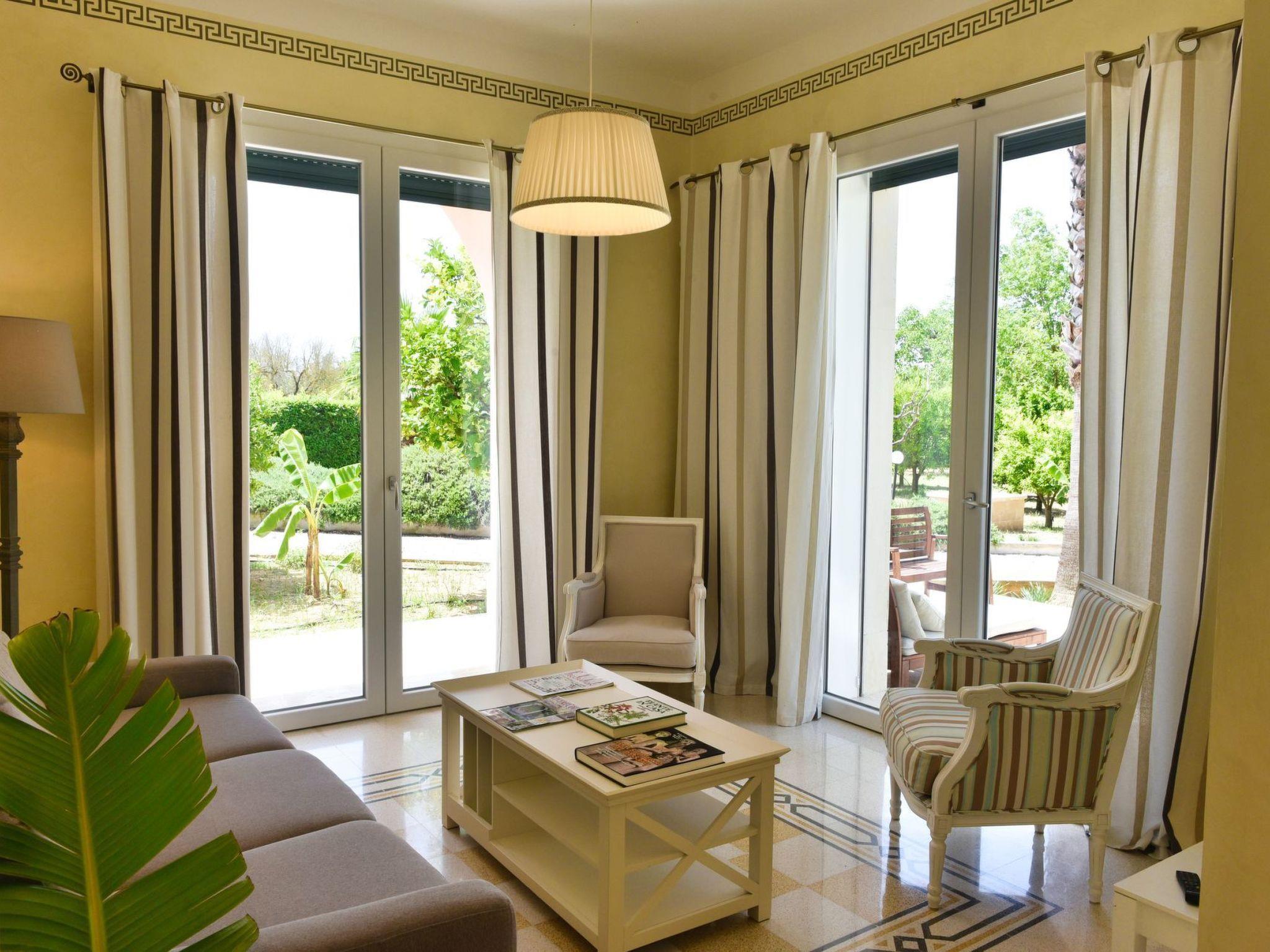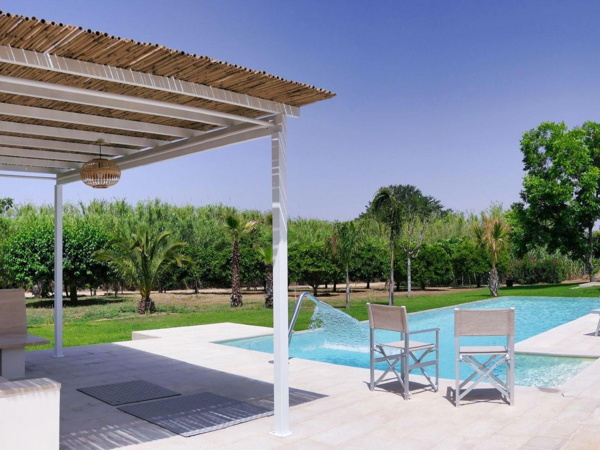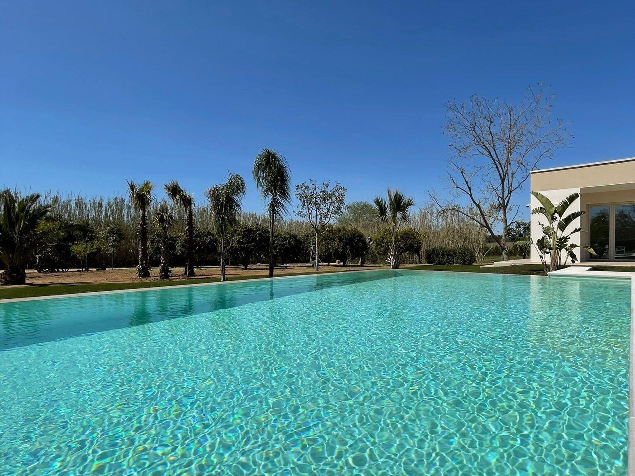 You enjoy an enchanting view of the green countryside and are surrounded by a beautiful garden with large palm trees, orange, lemon, apricot, pomegranate, banana, fig and olive trees. Far away from the hustle and bustle, there is plenty of space, pure air, nature, in short an indescribable pleasure, and since 2021 there is also the possibility to rent a 30 m2 luxurious pool house right next to it, which can accommodate two more visitors. This means we can receive a total of seven to a maximum of eight visitors. The pool house faces the magnificent swimming pool.