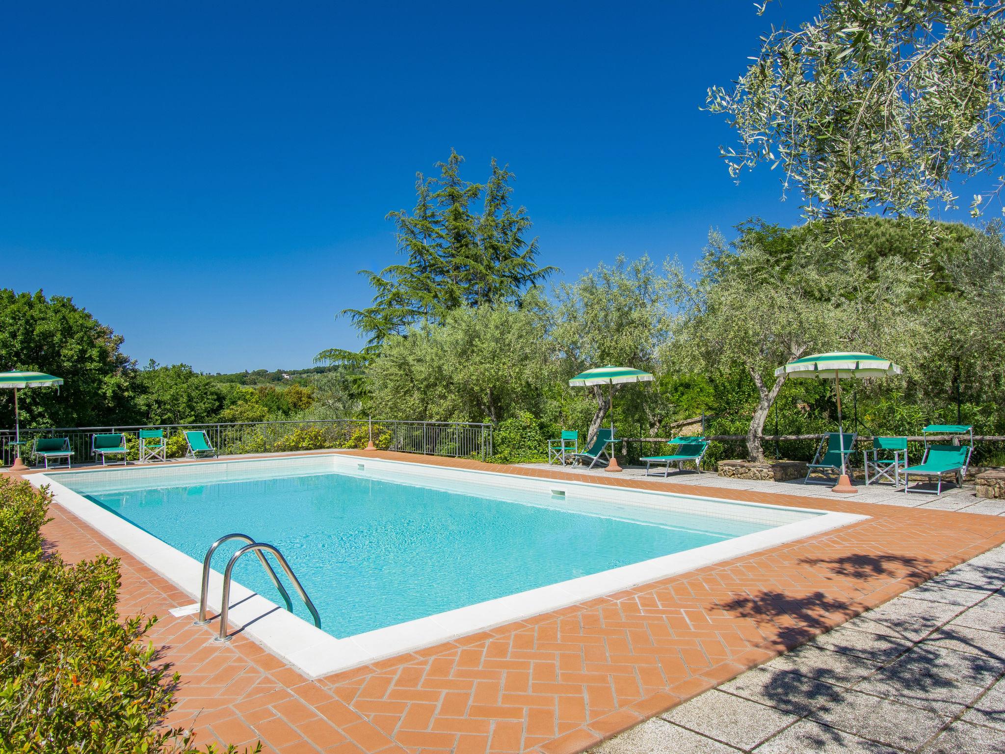 Small residence "Il Montaleo". 5 apartments in the residence. In the district of Il Montaleo 2 km from the centre of Casale Marittimo, 10 km from the sea, in the countryside. For shared use: property 6'000 m2 (fenced), trees, swimming pool (14 x 7 m, seasonal availability: 21.May. - 23.Sep.). Outdoor shower, barbecue. In the house: washing machine (for shared use, extra). Roofed, parking on the premises. Shop 2 km, supermarket 7 km, bus stop 1.5 km, sandy beach "Cecina Mare" 10 km. The photo is just an example.