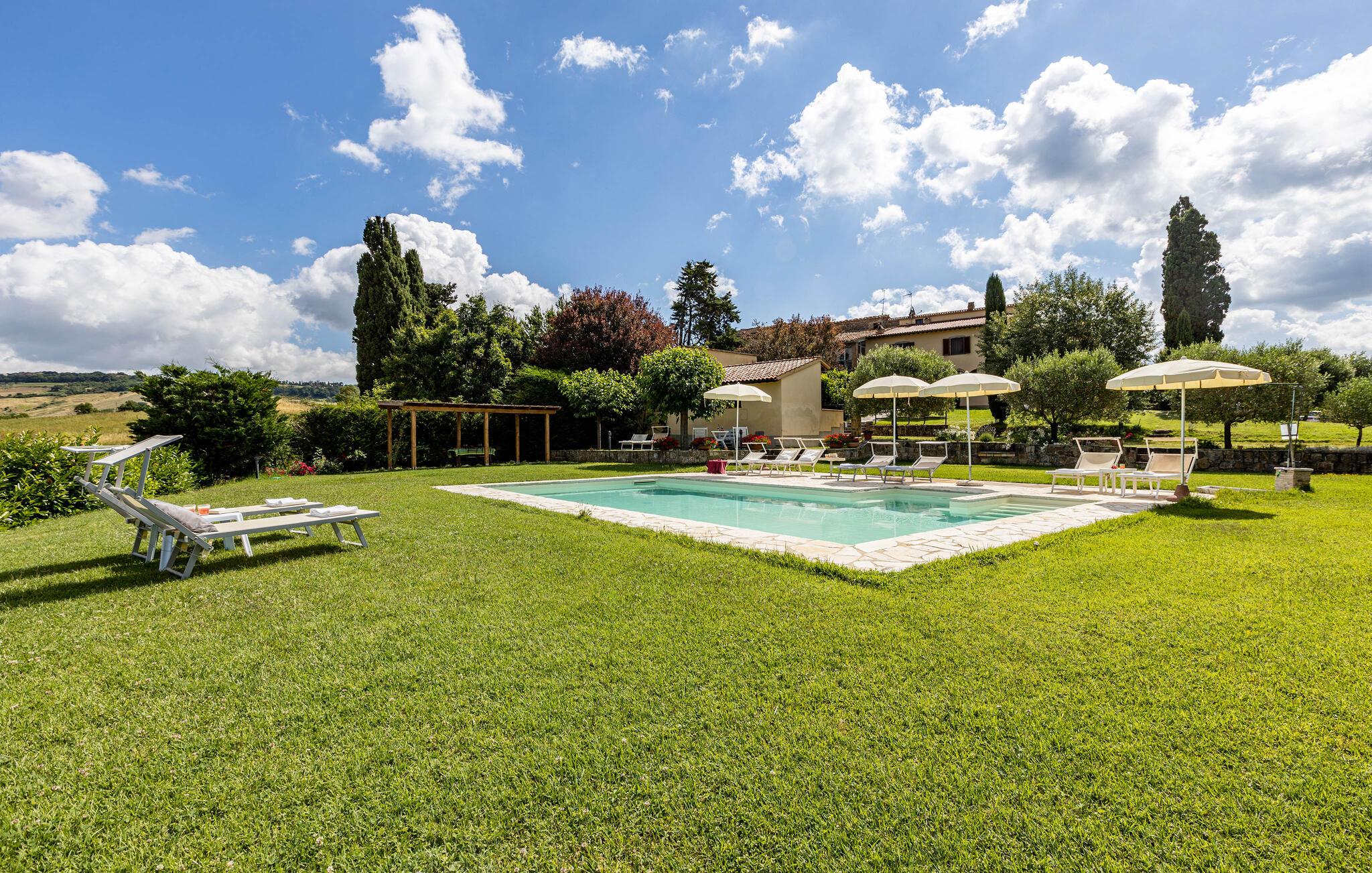 Dejligt feriehus (rækkehus) på en landejendom, i tre etager hvis gæster har adgang til en fælles pool. Beliggende omgivet af et grønt landskab i nærheden af Casole d'Elsa kun en km fra dets historiske centrum. Casole d'Elsa er en lille by i Sienaprovinsen, berømt for sit hestevæddeløb Palio, der afholdes i juli, men også for sine mange former for kultur i løbet af sommern som den traditionsrige messe "Festa del Borgo Nero", Food Festivallen "Steak på rette sted", hvor I kan købe kød fra slagterne i det historieske centrum og få det tilberedt af de lokale eksperter. I kan også opleve guitarfestivallen, hvor alle Italiens berømte musikere deltager. Huset er fordelt på to etager og har to store terrasser med havemøbler hvorfra I kan nyde dagens måltider i det fri og samtidig beundre udsigten over de omliggende landskaber. Efter en dag fuld af oplevelser kan I hoppe en tur i den fælles pool og slappe af. I kan fx besøge Siena (40 km), Firenze (60 km), Colle di Val d'Elsa (10 km), krystalbyen San Gimignano (25) km og Volterra (alabastbyen) 24 km. Det tager ca. en time at køre til Cecina og Follonicas strande. I kan bestille to ekstra sovepladser (mod betaling). I samme bygning som ITS309.