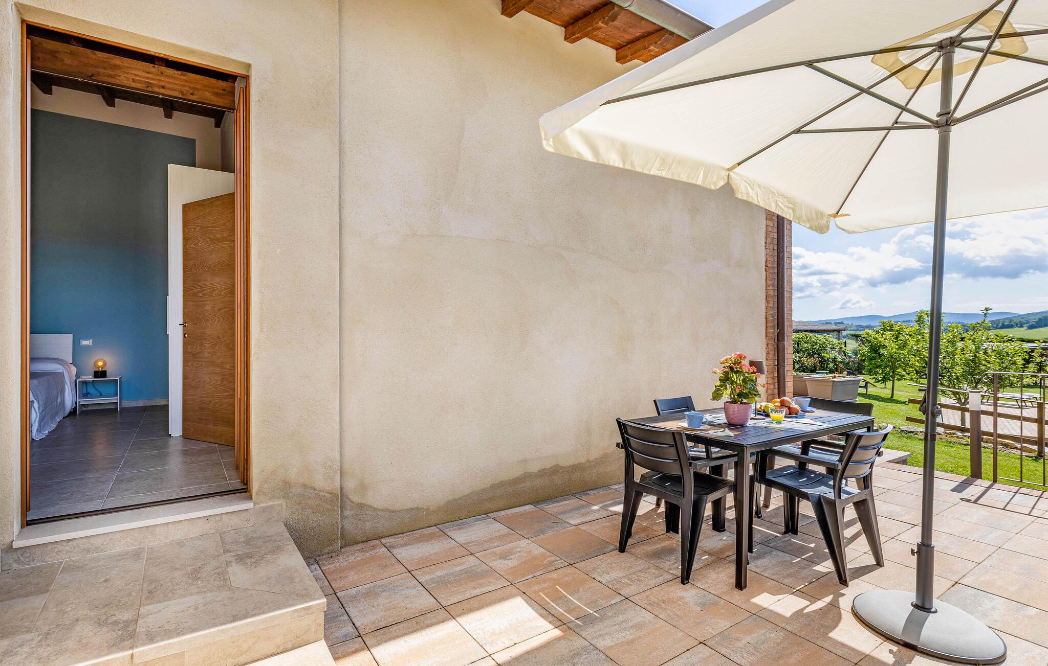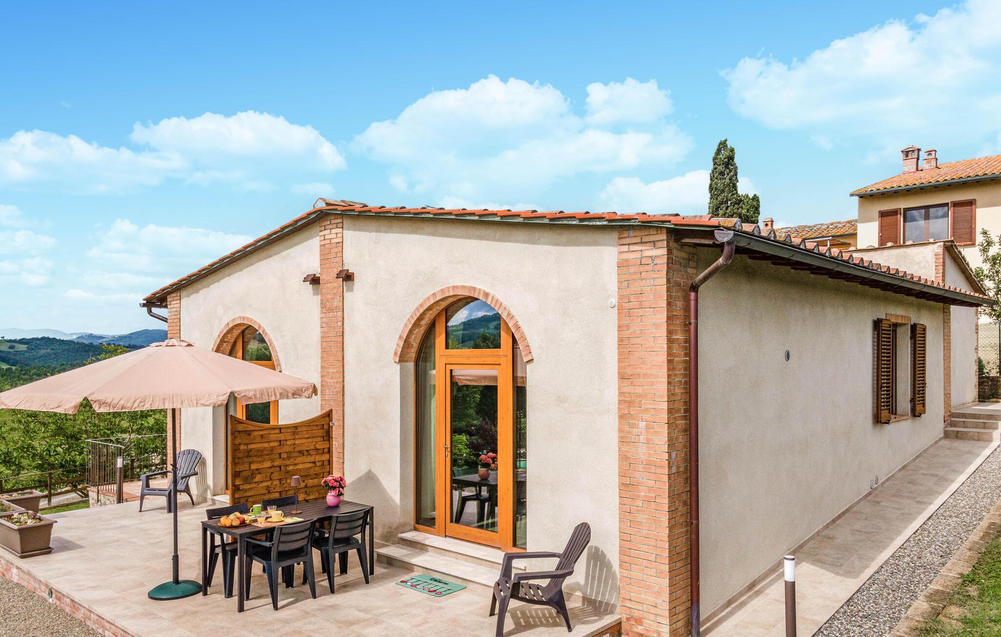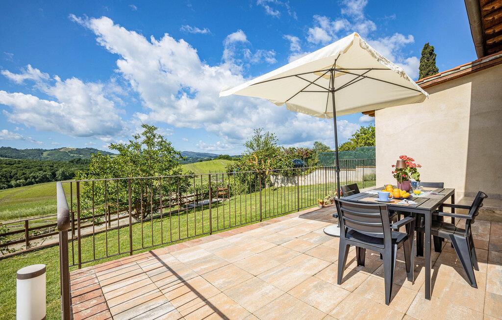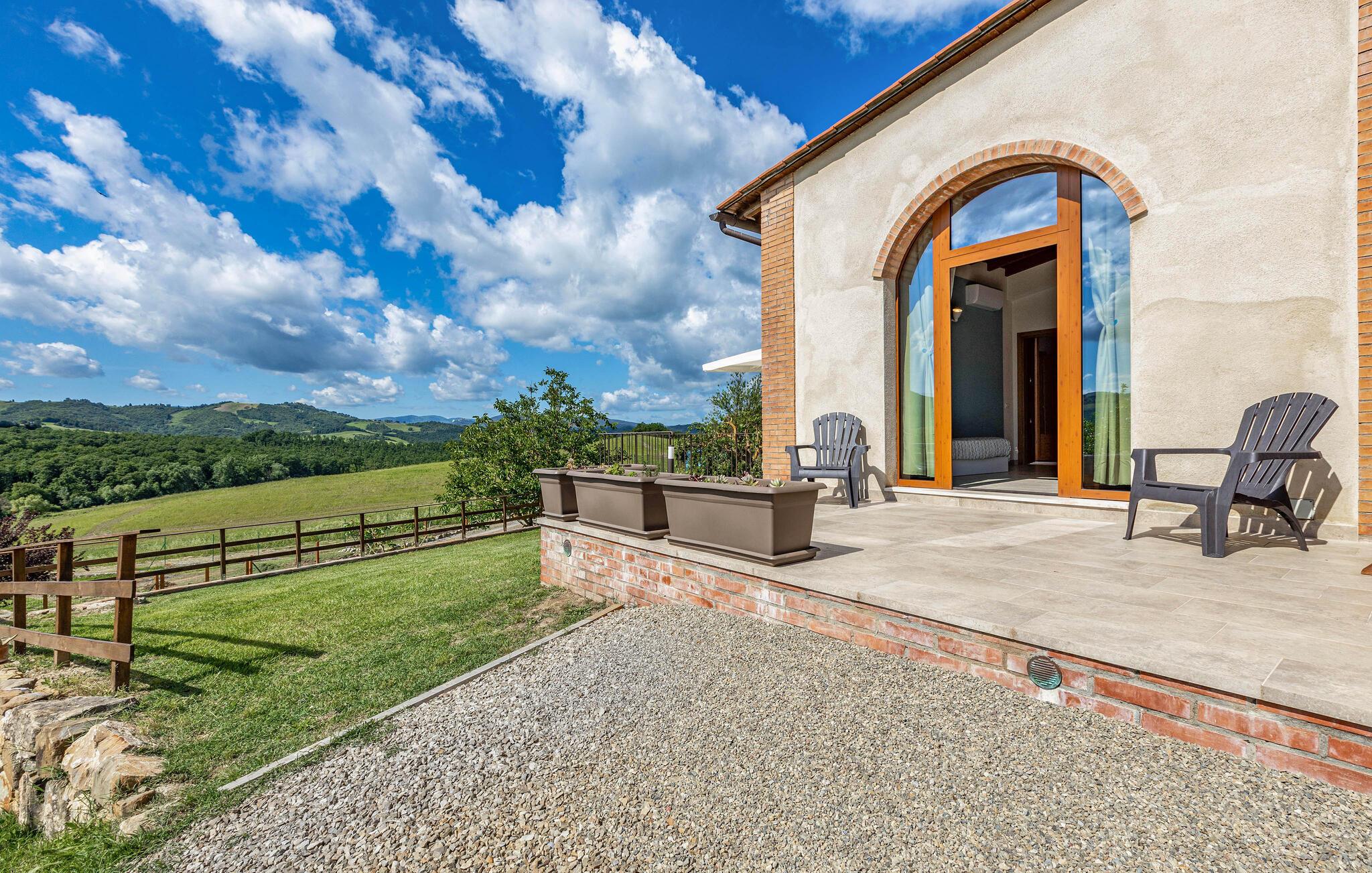 Velkommen til denne hyggelige lejlighed, der ligger smukt omgivet af Toscanas bakker, enge og marker, og hvor I får en skøn base for mange store oplevelser. Lejligheden ligger i et hus med to lejligheder og er lyst og funktionelt indrettet med et godt køkken, så I kan tilberede nogle lækre, lokale retter efter en aktiv feriedag, inden I flader ud i sofaen til langt ud på aftenen.