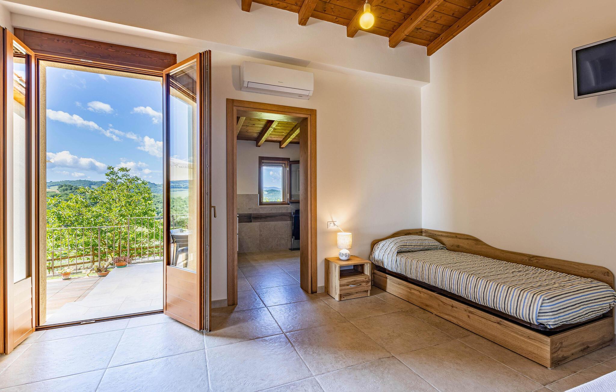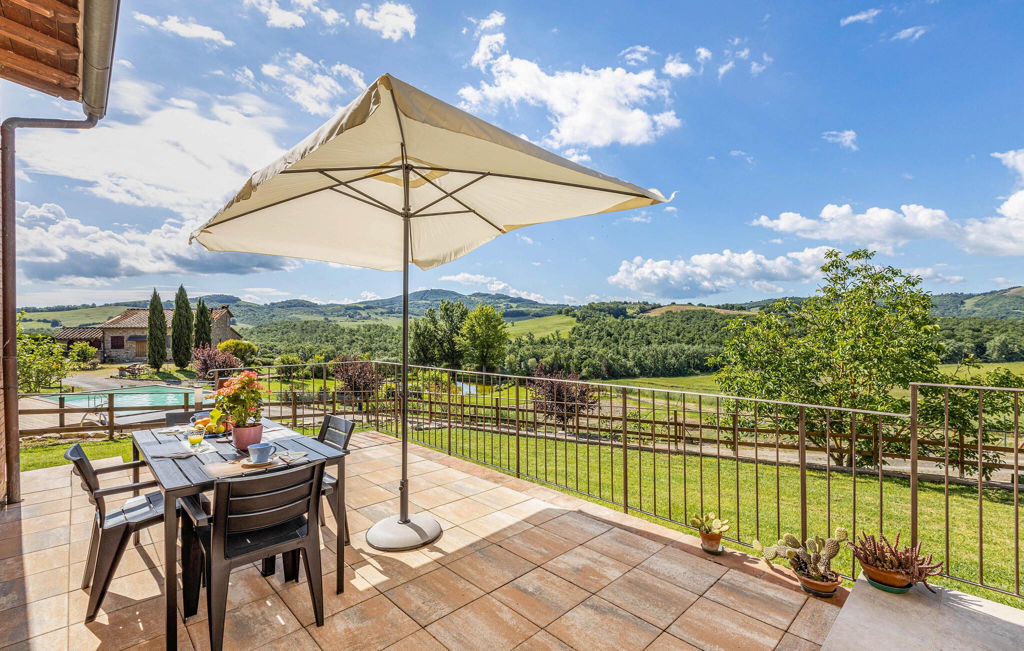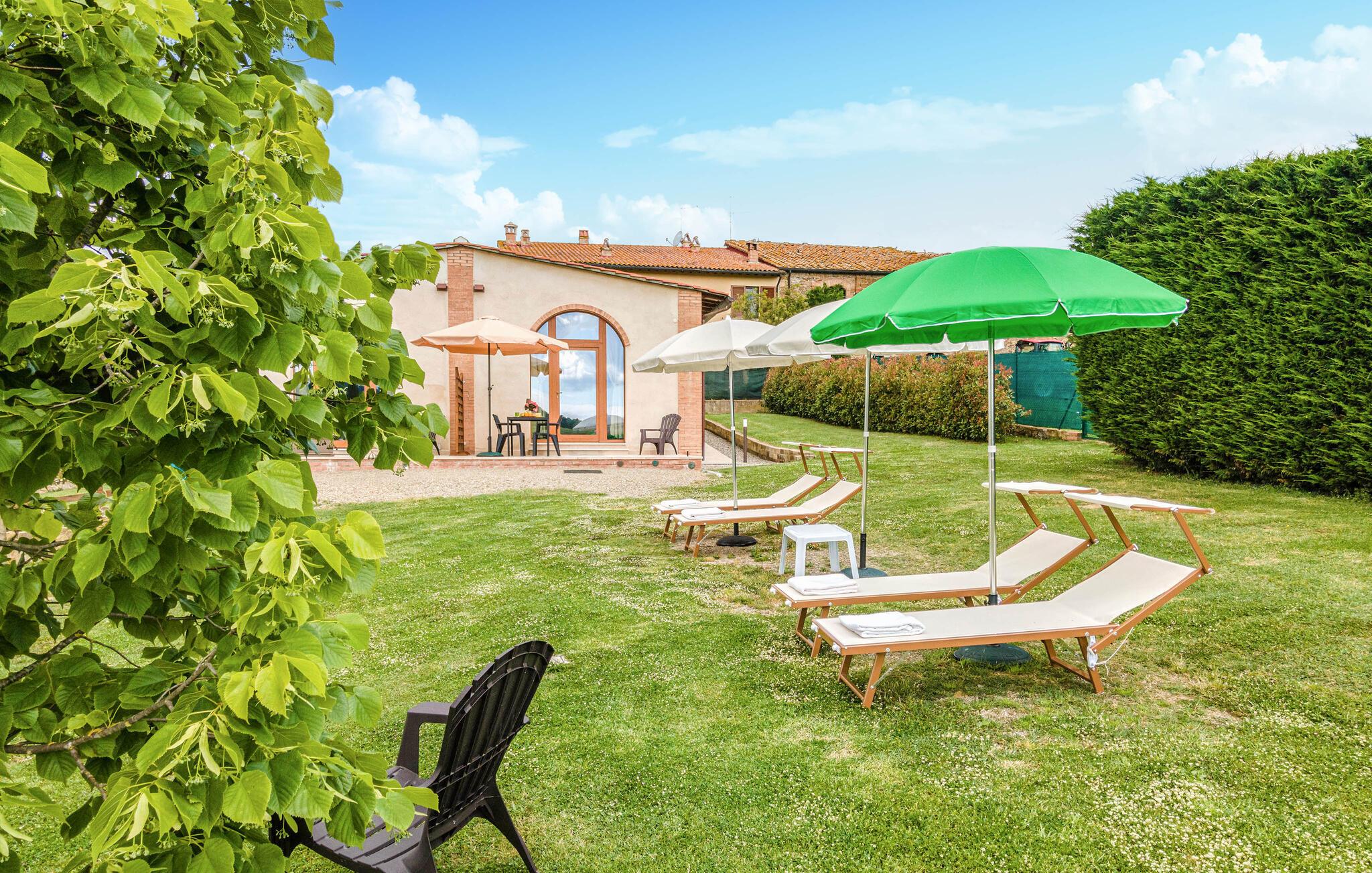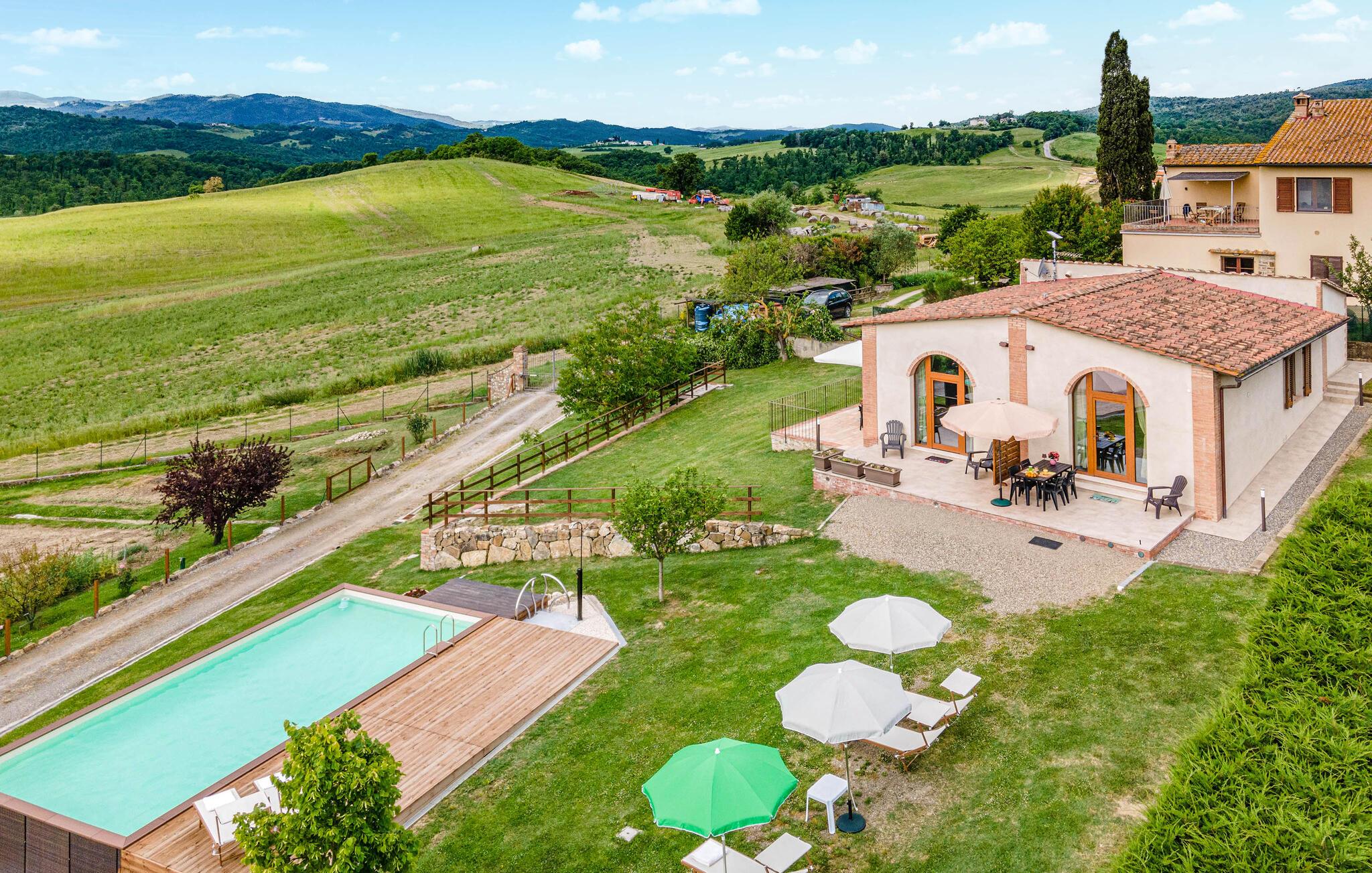 Velkommen til denne hyggelige lejlighed, der ligger smukt omgivet af Toscanas bakker, enge og marker, og hvor I får en skøn base for mange store oplevelser. Lejligheden ligger i et hus med to lejligheder og er lyst og funktionelt indrettet med et godt køkken, så I kan tilberede nogle lækre, lokale retter efter en aktiv feriedag, inden I flader ud i sofaen til langt ud på aftenen.