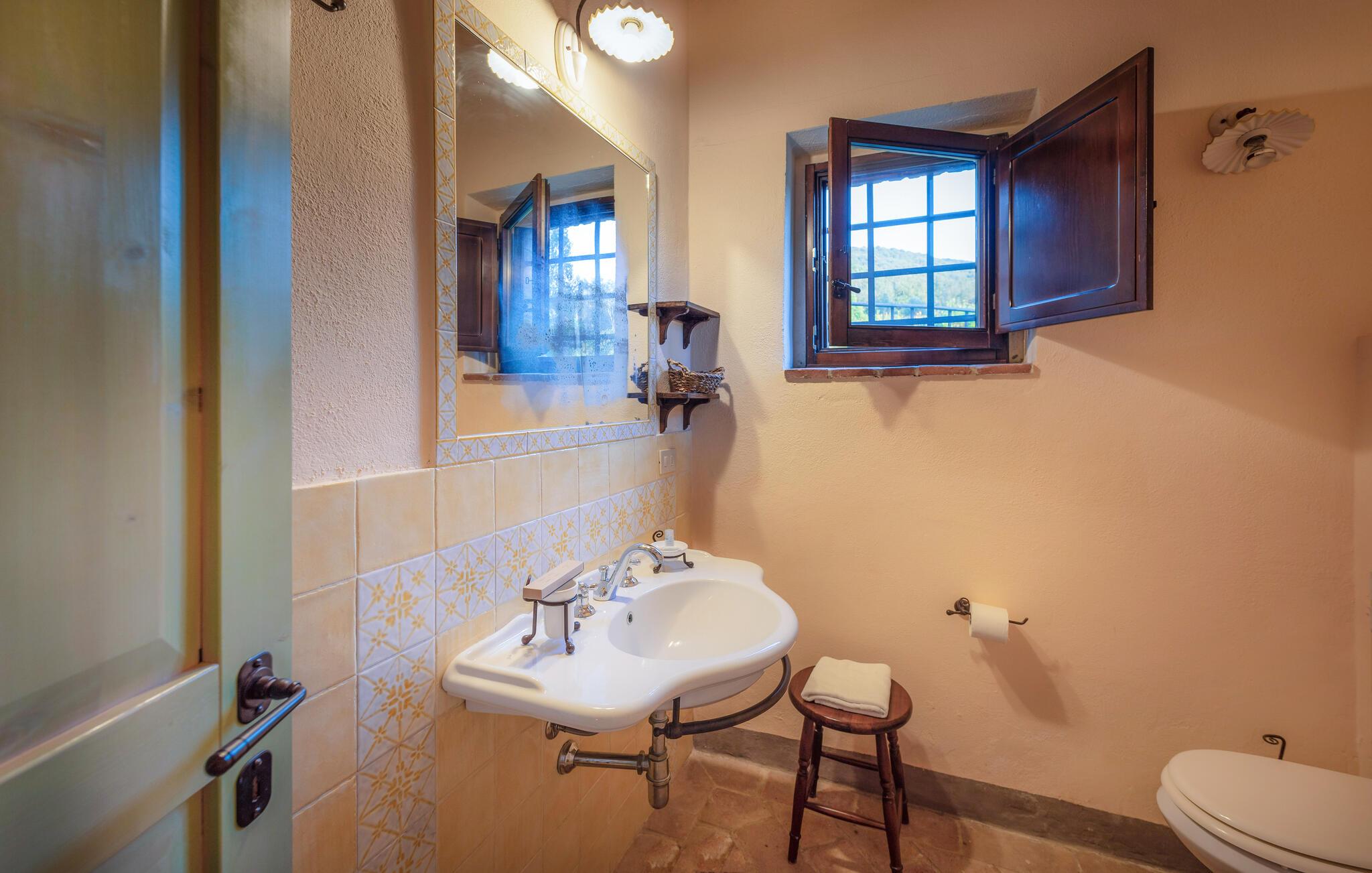 Denne hyggelige lejlighed er placeret på et karakterfuldt toscansk landsted og har fine autentiske detaljer. Synlige træbjælker i loftet og rustikke møbler skaber en historisk atmosfære, der hurtigt vil få jer til at føle jer hjemme. Slap af med god musik, nyd en sjov spilleaften eller lav lækre måltider i det moderne køkken.