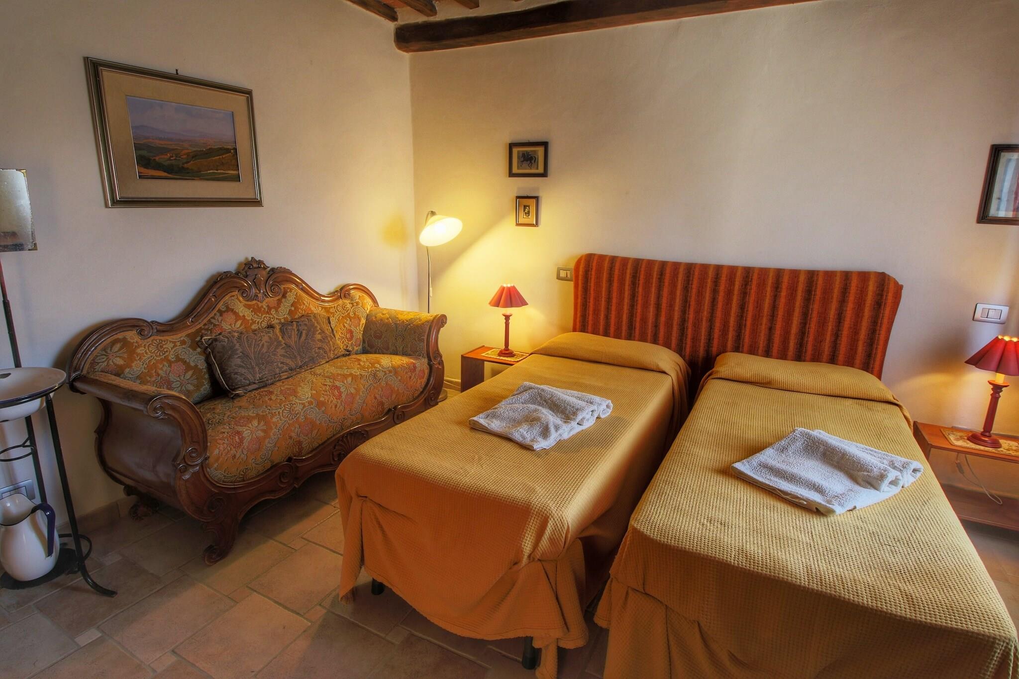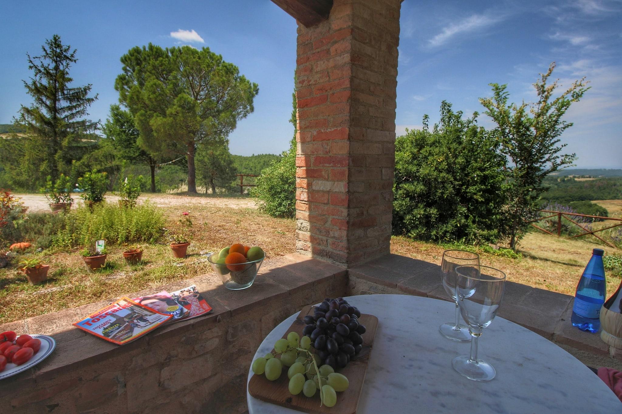 Olmi feriehus er et rustikt hus i et landligt område tæt på Casole d Elsa, Siena, Volterra de Chianti. Der er 2 lejligheder til gæster og en lejlighed, hvor boligejer selv bor i det rustikke hus. Hver lejlighed har en privat have og terrasse og du har en fantastisk udsigt over de toscanske bakker i hver sæson. Ferieboligen er 12 km fra Casole d'Elsa og Radicondoli, typiske små middelalderlige landsbyer med masser af charme og karakter. Det er en perfekt base for at udforske Toscana, havet og Maremma. Byer som Siena, Firenze, San Gimignano, Volterra, Monteriggioni og Massa Marittima er nemme at nå via gode veje. Den berømte Chianti vinregion ligger kun 25 km væk. Dinner er til rådighed efter anmodning og mod betaling og indeholder økologiske produkter fra ejerens egen grøntsagshave samt andre regionale produkter. Haven er et vidunderligt sted at nyde udsigten Der er en overjordisk swimmingpool og forskellige floder med rent vand i det omkringliggende område. Du kan også svømme i det naturligt varme vand i Petriolo-kilderne.