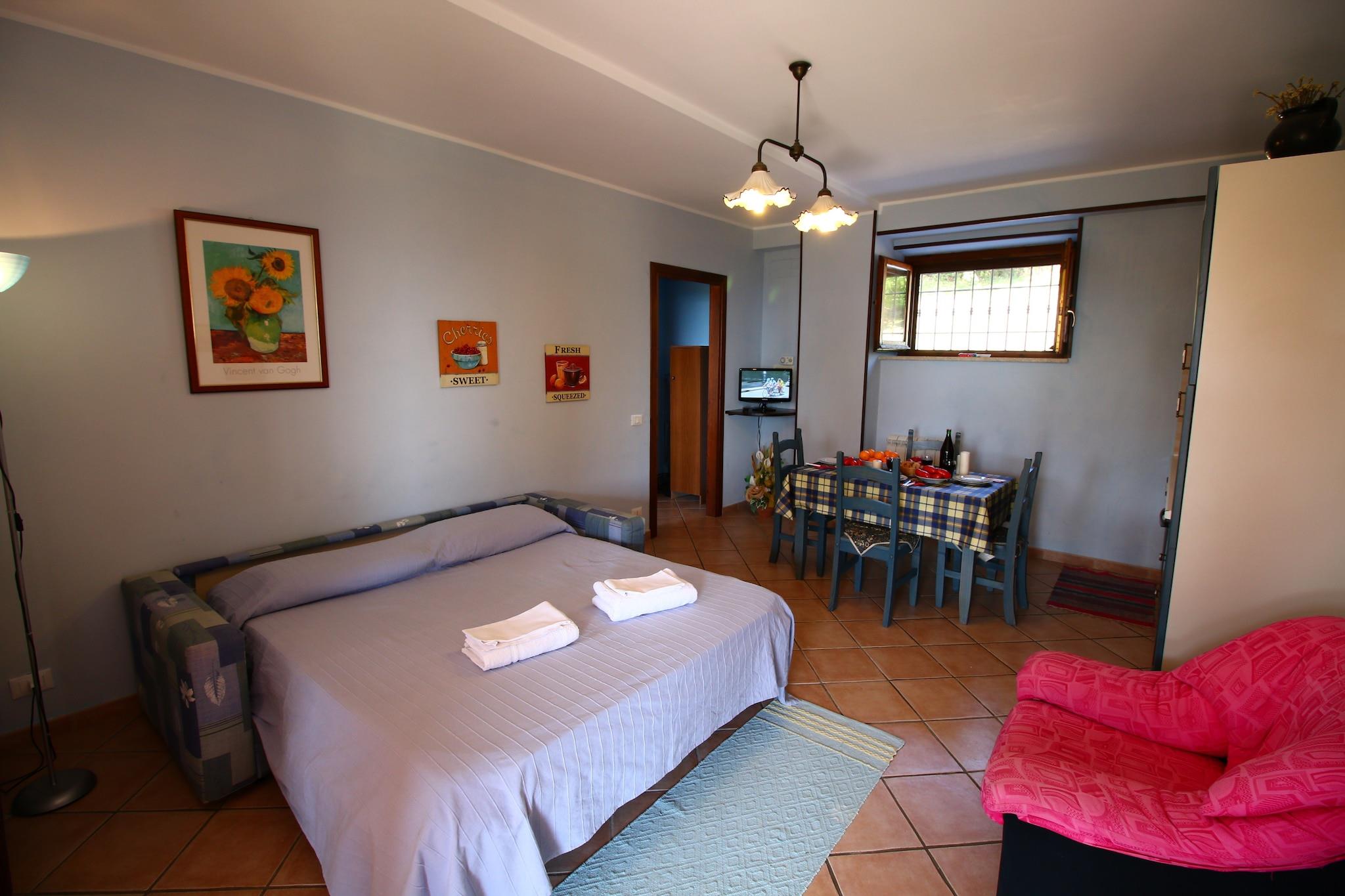 Charming Countryside Retreat in Casperia Set amidst the idyllic landscapes of Casperia, this pet-friendly farmhouse welcomes up to four guests for a peaceful escape. Surrounded by rolling hills and vibrant greenery, the property features free WiFi, a shared garden, and access to a 10 x 5 m shared swimming pool (available June through September), ideal for rest. Whether basking in the open air or relaxing indoors, guests are guaranteed a serene and unforgettable stay. Inviting Living with Thoughtful Details The ground-floor layout includes a cozy living area with a double sofa bed and TV, alongside a well-appointed open kitchen equipped with an electric kettle, toaster, coffee maker, espresso machine, oven, and fridge-freezer. The farmhouse offers a restful bedroom with a double bed and a bathroom featuring a shower, washbasin, toilet, and bidet. Guests also benefit from comforts like central heating, insect screens, garden furniture, barbecue setup, and on-site parking, creating a stay that blends convenience with rustic charm. Explore Casperia’s Heritage & Flavors Just a short distance away, admire the historic beauty of Palazzo Forani or wander the timeless streets of Borgo Storico di Casperia. For food lovers, Pub Al Solito Posto serves up hearty meals in a lively setting, La Tana del Branco delights with traditional Italian fare, and Vivere Il Gusto offers elevated dining. With culture, comfort, and cuisine all within reach, this farmhouse makes for a perfect Casperia getaway.